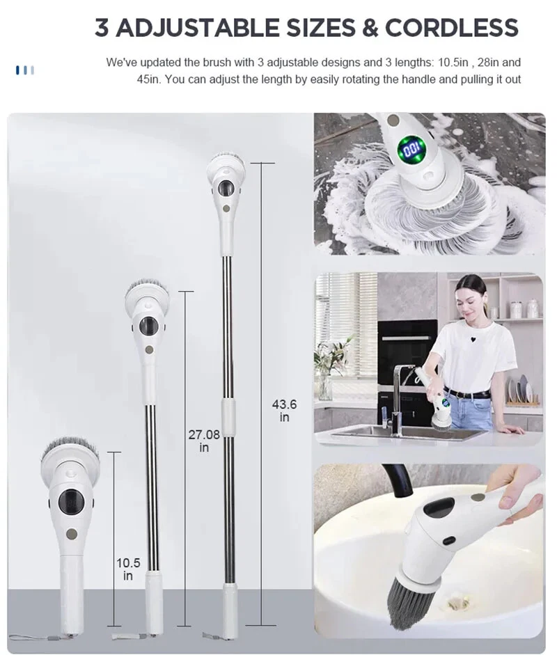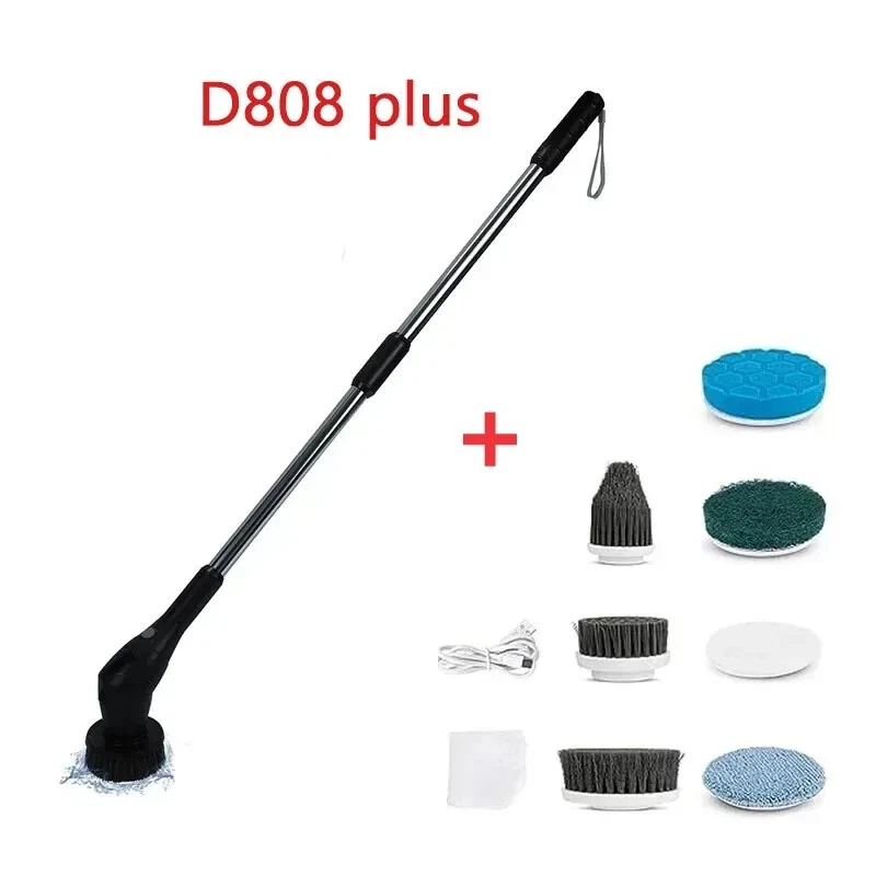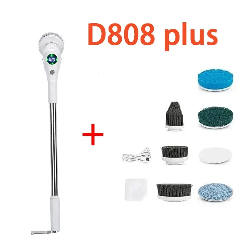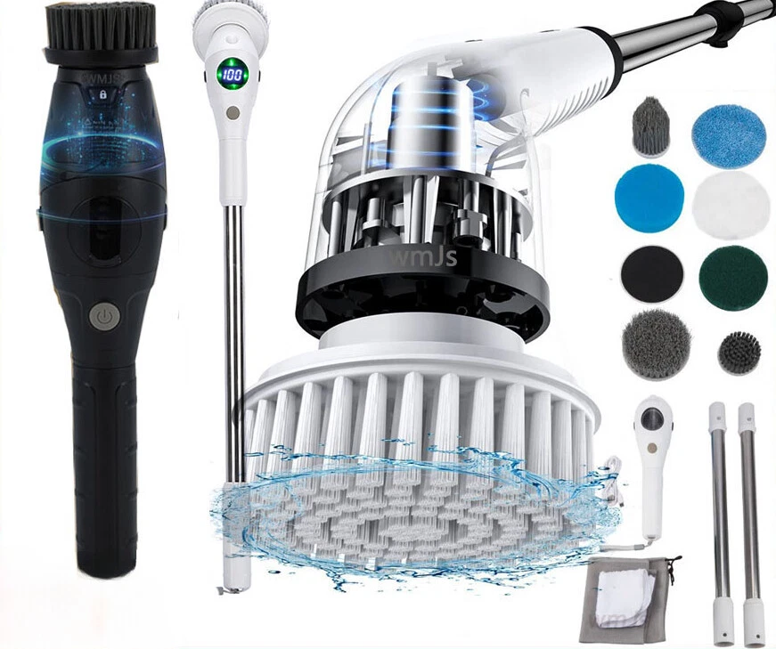 8 in 1 Cordless Powerful Spin Cleaning Brush (with LED Night Light , 3 Speed Control , Battery LED Display) Feature: 1. Suitable for cleaning the entire house . The parts of the multifunctional washing machine can be assembled as required, which is suitable for home cleaning. 2. The rechargeable electronic function is not restricted by the power cord after cleaning, and the cleaning range is wider. 3. The special brush head can clean the bathroom, faucet and other dirt problems, and the corner brush can penetrate into every corner and space. 4. The main unit can be connected to an extension pipe to easily clean the ceiling and tall furniture. 5. The accessory brush head can be cleaned different type area easily and clearly after use. 6.With LED night light design even dark corner also can be clean 7.The three speeds can be adjusted freely,more easy to clean . 8.LED screens can better show of battery power level and speed level Specification Weight with packaging: 1kg Packing size: 44.3x18x8.5cm Battery capacity: 2500mAh Working time: about 90 minutes Charging time: about 4-5 hours Material: environmentally friendly ABS with stainless steel Packing list Host *1 Telescopic pole*1 Sponge tray*1 Polyester tray*1 Fiber tray*1 Large flat brush*1 Fixed tray* 1 Wool tray*1 Pointed brush head*1 Small flat brush*1 Small Mops*1 Storage bag *1 Charging cable*1 Manual *1