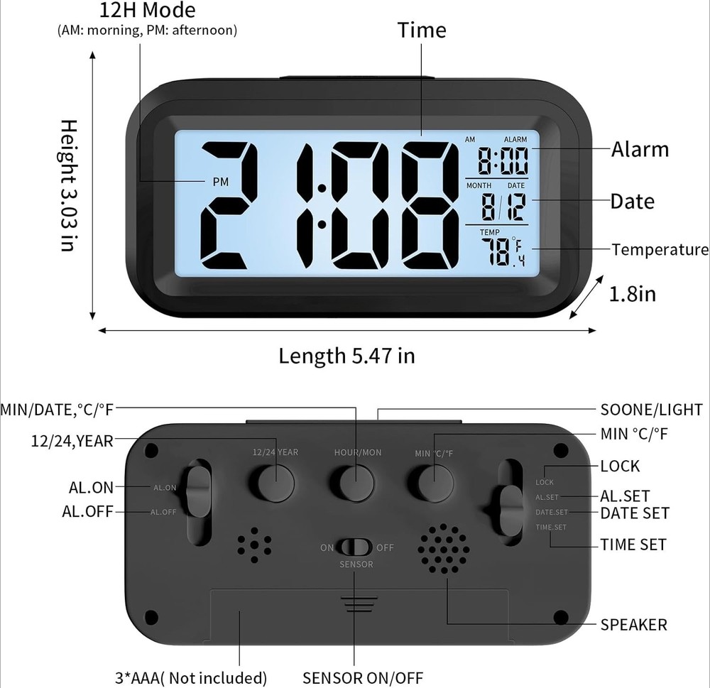 Descrip tion Electric Digital Alarm Clock Battery Backup LED Large Display Snooze Black Item Type: A LCD Alarm Clock Condition: Brand New Color: B l a c k Product Size : 5.5x3in Mat erial : Plastic Nu mber of Pie ce s : 1 Cold lig ht source back-light, easily read the time at the night. Accurate digital clock display. Date and Week display. Snooze repeat alarm function. Indoor Thermometer display.( C/F option) Compact and portable size,perfect travel-mate. Large LCD screen. Easy setup. Also suitable for the elderly. Not very loud alarm, suitable for those who like gentle ringing. Shipping Terms 1.We ship within 3 business days of payment, usually sooner. 2.All orders will be shipped out via USPS or UPS or Fedex express with a tracking number, 3.which will take 2-6 business days for the delivery. 4.We only ship to the lower 48 states, no APO/FPO addresses or PO Boxes allowed. Local pickups and combined shipping options are not provided at this time. Return Terms 1.You may return the product within a maximum of 30 days from the date of purchase. 2.If the item you received does not meet your expectations, is defective, or has any other issues, please contact us first . We will do our utmost to resolve the matter to your satisfaction. Feedback 1.Please kindly leave us a positive feedback and 5 star DSR if you satisfied with our product and service. Please feel free to contact us firstly if you have any problem with your order, we are responsible and credible seller and will solve the issue it for you asap. 2.If you are dissatisfied for any reason, please don't be quick to leave us neutral or negative feedback. We work hard to make sure EVERY CUSTOMER 100% SATISFIED and resolve any problem for you and always leave positive feedback to all our customers