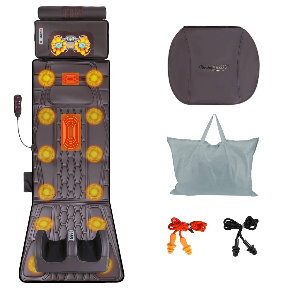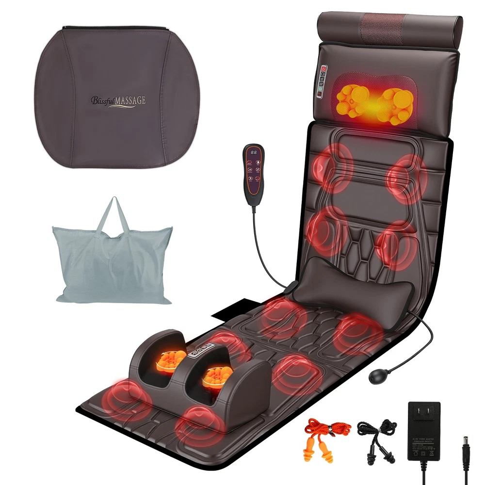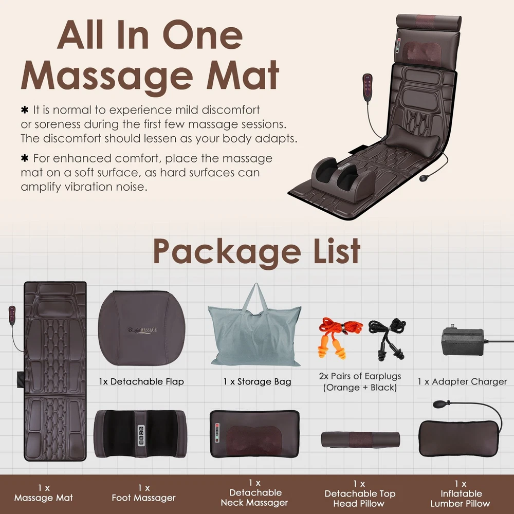 Free Shipping Featured Item Product Detail Image Gallery Product Description Overview: This full body massage mat is an ultimate solution for body pain and relaxation. With 12 massage heads, 9 vibration modes, pinpoint vibration, 9 speed/intensity levels, 3 heating options, and 3 timer settings, it relieves discomfort caused by various issues. The massage mat includes a detachable Shiatsu neck massager and foot massager, a sponge head pillow, inflatable lumbar pillow and earplugs for enhanced comfort. Available in flannel or PU leather, it has an anti-slip bottom. Comes with a storage bag, easy to carry. An ideal gift for loved ones on special occasions like Mother’s Day, Father’s Day, or birthdays. Features: Full Body Massage Mat: Suffering from back,waist,hip,thigh,or leg pain due to a sedentary lifestyle,cold,sports injury,,or meniscus issues? This electric massage mat is your ideal solution!It features 12 massage heads and offers versatile relief with 9 vibration modes,9 pinpoint vibration modes,9 speed levels,9 intensity levels,3 heating levels,and 3 timer settings—all designed to target and soothe your pain. Shiatsu Neck & Foot Massager: Designed for versatile relaxation,this full body massage mat includes 2 powerful massagers:The detachable neck massager gives a comfortable massage for your neck,back,arms,and legs,while the individual foot massager delivers soothing relief to your feet,calves,and arms. Each massager features 2 rotating Shiatsu heads,multiple speed and mode options,soothing heat,and a 15mins auto-off timer—making them perfect for releasing muscle tension anytime,anywhere. Whether at home,in the office,or traveling,enjoy a spa-like experience. Sponge Head Pillow & Inflatable Lumbar Pillow: Designed for total comfort,our massage chair pad includes two supportive pillows:The soft sponge head pillow provides optimal support for your head,while the inflatable lumbar pillow lets you customize the height to perfectly match your body's curves. Comfortable Surface & Anti-Slip Bottom: For ultimate comfort at home, this massage mat offers two choices: cozy Flannel for warmth and softness, perfect for cooler environments or sensitive skin; or easy-clean PU Leather, ideal if you prefer a sleek feel and worry about spills. Both options feature a secure anti-slip dotted bottom and a adjustable strap, allowing you to safely enjoy deep massage on any surface—whether attached to a recliner, placed on a bed/sleeper sofa, or over a soft carpet. Portable Use & Thoughtful Gift: All components detach easily to fit into the included storage bag, making it perfect for travel or saving space at home. Plus, if you feel noisy when massaging, you can use our included earplugs. The massage mat with heat serves as an ideal gift for loved ones on special occasions like Mother’s Day, Father’s Day, or birthdays—offering relaxation and care to grandparents, parents, partners, and friends! Usage FAQs: Q1: Why do I feel sore or uncomfortable during/after the first few uses? A: It’s normal to experience some soreness or discomfort initially, especially if it’s your first time using a massage mat. This sensation aligns with the traditional belief: “Where there is pain, there is blockage; where there’s blockage, pain follows. Relief comes once energy flows freely.” The massage nodes stimulate muscles and acupoints that may be tense or underused. This initial reaction often indicates that your muscles are being actively relaxed and circulation is improving. The discomfort should lessen within a few sessions as your body adapts. Q2: How Can I minimize discomfort during the first few sessions? A: To reduce discomfort in the initial sessions, try the following methods: Method 1: Begin with shorter sessions, lasting 8–10 minutes, and gradually extend the duration as your body acclimates to the massage. Method 2: Avoid applying your full body weight directly onto the mat. Instead, slightly lift part of your body to decrease pressure. Method 3: Place a flap, towel, or thin blanket over the Shiatsu Massager. This extra layer can cushion the massage intensity and alleviate discomfort. Q3: Where should I place the massage mat for optimal comfort and safety? A: For the best experience, place the mat on flat, soft surfaces like reclining/lounge chairs, beds, sofa beds, or thick carpets. Measure the chair's dimensions and compare them with the mat to ensure a proper fit;avoid using chairs smaller than the mat. Opt for armless chairs for better comfort. Steer clear of hard or uneven surfaces,as they can increase vibration and noise. Q4:How can I reduce vibration noise during use? A:To minimize noise,you can place the mat on a soft surface as recommended. Use the included earplugs for additional noise reduction. Q5:Is the entire mat a deep tissue or Shiatsu massager? A:Only the detachable neck and foot massagers use Shiatsu(deep kneading) technology. The main vibration mat provides a soothing vibration massage,not deep tissue or Shiatsu. Use them together or separately for full-body relaxation. Q6:Can I sleep on the mat or use it overnight? A:Absolutely not. For your safety,never use the massager while sleeping or unattended. Each should have a maximum duration of 30 minutes. Always unplug the adapter from the power outlet after use. Q7:Can I wash the massage mat? A:The main Vibration Mat cover is non-removable and not machine washable. Clean it by wiping the surface with a soft,damp cloth and mild detergent. Avoid soaking or spraying water directly on the mat. Q8:Why does the massage mat feel hot? Is this safe? A:The massage mat supports overheating protection. If heat feels excessive,painful,or localized in one spot,turn off heating function immediately and unplug. Check for obstructions(blankets,pillows) trapping heat. Specifications: Brand: Blissful Massage Product Type: Full Body Massage Mat Color : Brown Materials: PU Leather+Shaped Sponge+Plastic Dots Bottom Surface Pattern: Hot-Press