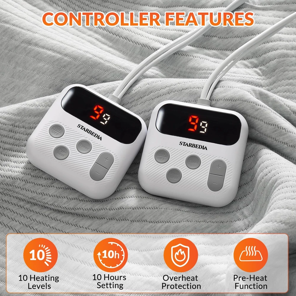 Experience the ultimate in comfort and convenience with our premium heated mattress pad. Made of high-quality air layer fabric, it offers a soft and fluffy touch while ensuring excellent breathability, regulating temperature and moisture for a cozy sleep environment. The delicately designed striped pattern adds elegance to any bedroom decor. With our one-touch controller, adjusting the temperature is a breeze. Choose from 5 heat settings (86℉ to 112℉) and feel the pad warm up in just 30 minutes, providing a cozy embrace. The elasticized edge ensures a perfect fit for mattresses up to 18 inches deep, preventing slipping and maintaining a tidy bed. Safety is paramount, as our electric mattress cover is ETL certified, and the 10-hour automatic shut-off function promotes energy efficiency. Cleaning is effortless with the machine washable feature. Remove the controller and toss it in the washing machine for a hygienic and allergen-free sleeping surface. Enjoy the perfect blend of comfort, convenience, and safety with our feature-packed heated mattress pad. 【Premium Fabric】Made of high-quality air layer fabric, the heated mattress pad not only provides a soft and fluffy touch but also ensures excellent breathability. This helps to regulate temperature and moisture, creating a comfortable and cozy sleeping environment. The delicately designed striped pattern adds a touch of elegance and beauty to any bedroom decor. 【Dual Control】The dual controller allows for independent temperature control in two separate zones, accommodating the needs of two individuals. Each controller offers 10 heat settings ranging from a gentle warmth of 78℉ to a toasty 122℉, both partners can enjoy your desired level of warmth and comfort throughout the night. Achieving the perfect temperature is quick and easy, thanks to the fast heat-up time of just 30 minutes. 【Perfect Fit】The elasticized edge of the heating mattress pad is designed to fit most mattresses depths of up to 18 inches. The strong elasticity ensures a snug and secure fit, preventing the cover from slipping or bunching up during the night. This not only provides a hassle-free sleep experience but also helps to maintain the overall appearance of the bed, giving it a neat and tidy look. 【Safe & Efficient】Safety is a top priority with the queen electric mattress pad cover. Rest easy with the ETL certification, guaranteeing the highest safety standards. The built-in 10-hour automatic shut-off function is not only convenient but also promotes energy efficiency, reducing the risk of overheating and conserving electricity. 【Machine Washable】Maintaining cleanliness is a breeze with our machine washable heated mattress pad cover. Just remove the controller and toss the mattress pad into the washing machine for a convenient and hassle-free cleaning experience. Say goodbye to time-consuming hand washing and enjoy a fresh and clean mattress pad cover with ease.