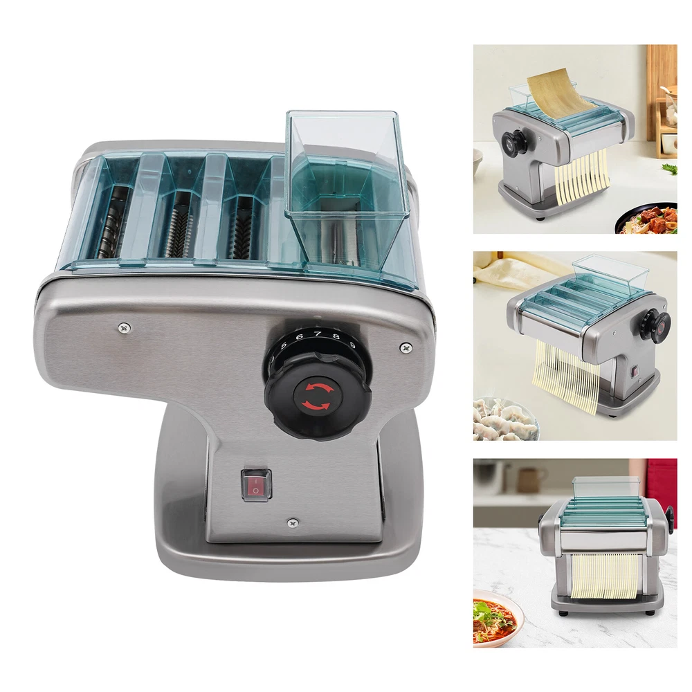 Electric Pasta Press Maker Noodle Machine Stainless Steel Commercial Home Hotel Welcome~ Description A great automatic noodle machine can help you make noodles of different thicknesses and crusts of different thicknesses for you and your family to enjoy deliciously. Our product is made of high-quality stainless steel for durability, has a high power of 135W and offers 9 thickness adjustments so you can quickly make different sizes of pasta to really meet your needs. Come and bring it home! Specifications Color: Silver Material: 409# Stainless Steel, 201# Stainless Steel, 410# Stainless Steel, ABS Process: Electroplating Assembly Required: Yes Mounting Type: Tabletop Power Source: Corded Plug Type: US Standard Motor Type: Aluminum Motor Operation Mode: Automatic Power: 135W Voltage: 110V Gears: 9 Gears Is Dishwasher Safe: No Adjustable Thickness Range: 0.5-5mm/0.02-0.2in Adapted Noodle Size: 2.5mm/0.1in, 4mm/0.16in, 9mm/0.35in Gross Weight: 10.3kg/22.71lbs Net Weight: 9.3kg/20.5lbs Top Width: 25cm/9.84in Overall Product Size: 25*20*23cm/9.84*7.87*9.06in Package Size: 32.3*32*27cm/12.72*12.6*10.63in Package Included 1* Automatic Noodle Machine 1* Brush 1*Dough Cutter 4*Non-slip Foot Pads All Accessories for Assembly Key Features Sturdy and Durable: The item is made of high-quality 409# stainless steel, 201# stainless steel, ABS and 410# stainless steel materials with an electroplating process, making it resistant to deformation, oxidation, rust, and safe to use, so it can keep practical and beautiful without frequent replacement. High Efficiency: The 135W powerful aluminum motor and chain drive design make the product run more stably, so you can make noodles faster and more efficiently to provide delicious food for your family. Adjustable Thickness: You can use the thickness knob to cycle through 9 gears to make crusts of 0.5mm and 5mm(1st gear is the thickest while 9th gear is the thinnest), facilitating dough preparation. Thoughtful Design: 3 different blade thicknesses (2.5 mm, 4 mm, and 9 mm) are convenient for making crusts, and round noodles, giving you more options. Moreover, its press and cut knob allow you to make better different sizes of noodles. Complete Set: The product also includes a brush for oiling the dough, and molds for making dumplings as well as a tool for cutting the dough, so you don't have to buy extra, saving you time and effort. High Safety : Uniform heat dissipation holes on the bottom ensure smooth operation and increase safety during use. In addition, the ABS protective cover prevents the risk of scratches for added safety. Easy to Clean: Thanks to its smooth surface and removable shield, you can clean the product more easily with a rag or a brush(not included). Ideal Gift: Thanks to its functionality, you can give it to your friends as a housewarming, Christmas or Thanksgiving gift! Protective Package: To prevent damage to the product due to bumps in transit, we place foam to protect the product as much as possible. Details Practical Brush: It helps you clean the product better and can be used to apply vegetable oil(not included) to the rotating parts for better lubrication. 4 Anti-slip Pads: The anti-slip silicone pads on the bottom of the product dampen vibration, reduce noise and ensure stability when in use. Power Switch: The one-touch power switch and the outer protective barrier are waterproof and dustproof, which are convenient for you to operate and improve the safety of use. Application It can be used in homes, breakfast stores, restaurants, noodle shops, etc. It can be used with gluten flour, spelling flour, etc. and used to make spaghetti, lasagna, spaghetti and dumplings. How to Use 1. Mix the flour(not included) and water about 4:1. 2. Cut the dough into small pieces. 3. Turn the knob to pressing mode. 4. Adjust the thickness settings. 5. Press the dough repeatedly. 6. Turn the knob to cutting mode. 7. Cut noodles. Notes Please add some flour(not included) on both sides of the dough when pressing the dough to prevent the dough from being too sticky and attached to the machine. Please note that this product does not include items such as flour. The machine cannot be disassembled and do not clean the machine directly with water. Please use a brush and wet dishcloth to clean the machine after each use. Please store the machine in a dry place to reduce corrosion. The machine is used for pressing and cutting noodles, not for polymer clay, pizza, or bread. It can not be used for over an hour. Please check the power cord frequently to reduce leakage and injury. Please often inject a little vegetable oil (not included) into the rotating parts to ensure lubrication. Please allow the slight color difference caused by the shooting light and 1-3cm error due to manual measurement, and make sure you do not mind before you order. tu1 Payment Delivery details Terms of sales About us Contact us Payment We accept ebay payment 。 Fees such as import duties, taxes are not included in the item price or shipping costs. These charges are the buyer's responsibility. Delivery details Shipping: 2-9 working days to: USA Terms of sales We maintain high standards of excellence and strive for hundred percent customer satisfaction. Feedback is very important to us. We hope that you contact us immediately before you give neutral or negative feedback, so that we can address your concerns. It is impossible to address issues if we do not know about them! About us Your satis faction is our ultimate goal. We work hard to earn your trust and future business. Our certified technicians have tested each item before shipping. The unit comes with 1 year limited warranty on all manufacturing defects. a) If you receive a defective item, you may return it or ask for a discount. Please contact us within 14 days after you receive the package. b) What you returned must be intact and in its original packaging as re? u. Customer is responsible for shipping costs of the returned item. c) We will 