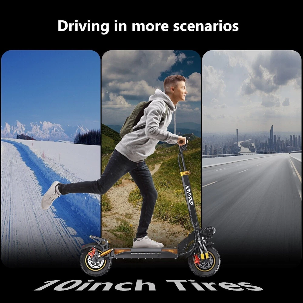 2OOOW Adults Electric Scooters 1OOOW Dual Motors Drive 48V Max Speed 37Mph Long Rang Fast 28-34Miles Commute Off Road E-Scooter 2023 Upgraded iENYRID Electric Scooter ES6 Foldable Electric Scooter comes with a 960Wh (48V 20.8Ah) battery assisting 28-34 miles cruising range. ES6 becomes an excellent choice for high-quality and comfortable riding. It is suitable for commuting to work, shopping in supermarkets, mountain cross-country and traveling. Powerful Motor & Long Lasting Battery ES10 electric scooters f With powerful Dual 1OOOW Motors, detailed parts, detachable seat and foldable design,, brings faster acceleration and climbing ability to this electric scooter, which can reach 35 mph max and max 30°climbing angle. Comfortable Commuting IENYRID ES10 adult off road electric scooter comes with upgraded 10-inch off-road tires and front and rear dual suspension to ensure max comfort even on bumpy roads. Also, the aviation-grade aluminum frame is stronger and lighter, which makes the scooter much more elegant to look at and handle as well. And it has a max load of 280 lbs. Foldable Electric Scooter Easy to fold and carry, carry it on public transportation or store it in your car to get to wherever you want. Dynamic, Easy storage in car trunks and other compact spaces, occupying little space and suitable for travel and transportation commute. IPX5 Super Waterproof & LED Intelligent Lighting System The waterproof frame and deck are tightly sealed against water, accredited with an IPX5 ingress protection rating painting. The head of the e scooter is equipped with three LED lights with different functions to ensure safe and worry-free riding at night. Specification: Model: iE-ES6 Battery: 48V / 20.8Ah(Shenzhen Chuangxingyuan and Dongmag A-grade batteries) Power: 1OOOW x 2 (40*3mm magnet Dual Motors) Display Screen: Color Max Speed: 34Mph Range: 24-34Miles Max Load: 120 KG Tire Size: 10 inch Tire Type: Off-road Air Tires (Front and rear 10-inch pneumatic off-road tires) Charging Time: 7-9 hours Frame Material: Aluminum Alloy Net Weight: 30.34 KG Gross Weight: 35 KG Package Size: 48.2 x 10.2 x 20.7 inch Brake: Front and Rear Disc Brake Light: Front LED Headlights, Cornering Lamp, Sidelights, and Taillights (One-piece headlight, built-in speaker, side red, green and blue colored lights, rear brake lights, front and rear turn signals with running water, with spotlight function (waterproof connector for headlight and tail light)) Adapter: Input: AC 100-240V ~ 50/60Hz 1.5A, Output: 54.6V 2.0A Note: The maximum load capacity is the maximum weight that the scooter can withstand. Instrumentation: ① Yongkang Zhe whale black and white screen instrument (do waterproof connector) ② Function: NFC card brush instrument screen boot (with 2 NFC card), public mileage switching, 5 minutes of automatic resting screen, free to lift the speed limit, cruise control, a single mileage and total mileage clearing, zero-start (power on the display of 0 gears), fault code prompts, the stall stall display Frame: Aluminum frame Finger Pivot: Acceleration finger pivot is uniformly mounted in the right hand direction Pedals: Black one-piece pedals (brand logo printed) Brakes: front and rear power-off disc brakes, left and right e-brake lines with waterproof connectors. Seat Bag + Carrying Handle: Sponge memory seat (seat bag + base packaged as accessories, carrying handle installed in the E-Scooter) Risers: round risers with fixed latches Reflector: white front + yellow side + red rear Speed: factory set speed limit according to European regulations (maximum speed of 15.53Mph before unlocking, speed of 6.21/9.32/15.53Mph in three gears), the instrumentation needs to be equipped with a function that can be unlocked (maximum speed of 34Mph after unlocking, speed of 12.43/21.75/34Mph in three gears) Pure electric range range 27.96Mph~40.39Mph Max speed may vary depending on the rider's weight, riding style, ambient temperature, battery level, and terrain. This list breaks down the key specifications and details of the iE-ES6 scooter. Package Contents: 1 x Charger 1 x User Manual 1 x Electric scooter ''Warning: It is illegal to ride electric scooters on public roads (except under very specific circumstances), pavements or cycle paths. They are intended only for use on private land with the owner’s permission.''