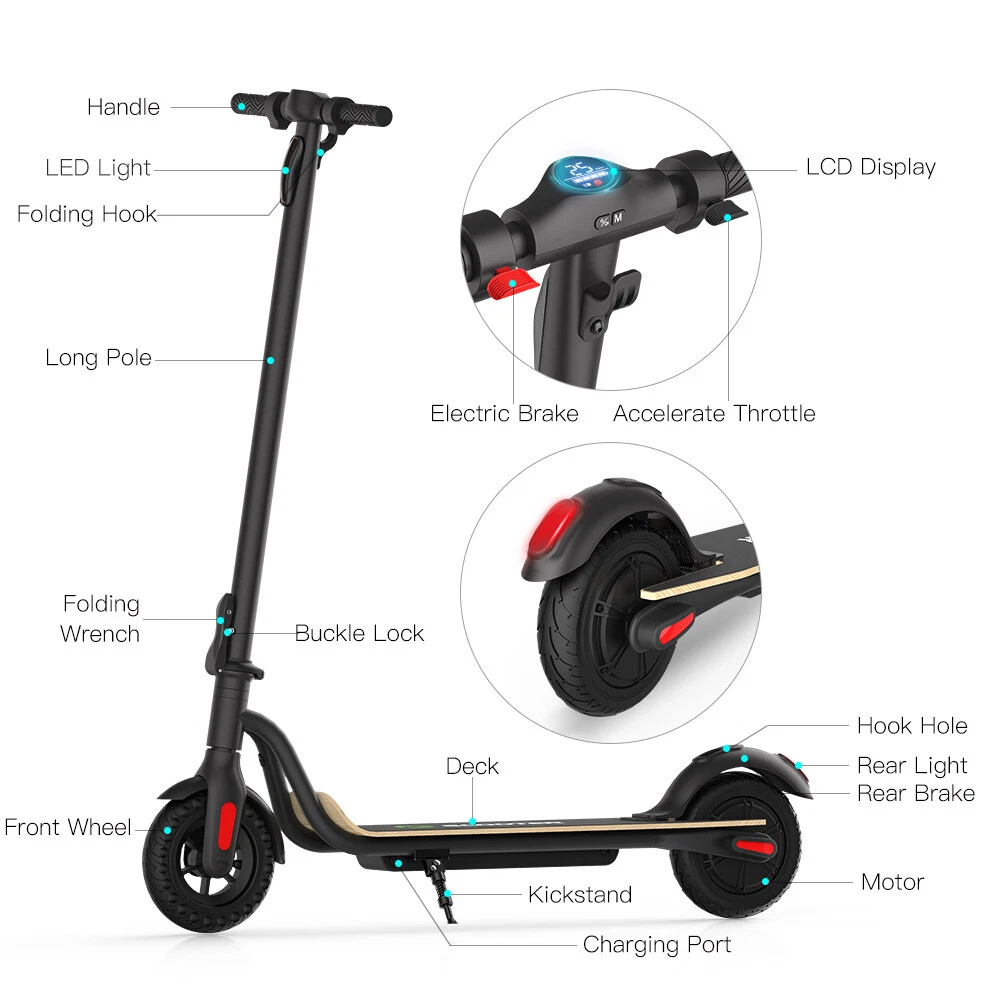 Main features: LONG RANGE BATTERY LIFE - Powerful 250W motor and 7.8 Ah/36V lithium battery pack that supports a speed of up to 15 Mph with a range up to 13 Miles. Updated large-capacity battery life, designed for commuters and longer distances. 8.0" HONEYCOMB & SOLID TIRES - Shock-absorbing rubber tires offer a smooth ride even over bumpy surfaces. PORTABLE FOLDING DESIGN - Electric scooter can be folded easily in 3 seconds with quick folding latch for easy carrying and storage. BATTERY INDICATOR AND LIGHTS - Battery indicator keeps to track battery life. Ultra bright LED headlight and taillight. Fast recharging about 5 hours. GEAR SHIFT SETTING - 1st gear for a 7 Mph comfortable ride or 3rd gear to get the 15 Mph fast experience. Extremely fun to ride and end boring commutes. Specification: Brand: Megawheels Model: S10 Dimension: Unfolding 105 x 43 x 118 cm; Folding: 105 x 43 x 48 cm Net Weight: 11.9kg Color: Black Frame Material: Aluminium Tires: 8.0" Honeycomb Front Tire & Solid Rear Tire Max Load: 100kg Max speed: 25KM/h Speed level: Gear 1--Max 10km/h ; Gear 2--Max 20km/h; Gear 3--Max 25km/h Mileage: 17-22km Grade Ability: 20 degree slope Working Temperature: -15°C-50°C Storage Temperature: -20°C-25°C Mode Type of Motor: Brushless hub motor Battery Type: High quality lithium battery Battery Capacitiy: 7.8 Ah Battery Voltage: 36V Charger Input Voltage: 100V-240V Charger Frequent: 50Hz/60Hz Charging time: 5 hours Package Contents: 1 * Folding Electric Scooter 1 * Battery Charger 1 * User's Manual NOTE:The appearance of the product you receive may vary slightly from the image shown due to differing production batches! Before use, please kindly read the schematic diagrams and assembly steps of manual to assemble the front wheel: 1. Step on the base, lift the fork firmly to remove the base. 2. Remove the rubber plugs on both sides of the front fork, and unscrew the front axle with the two 6mm hexagon wrenches in the package. 3. When installing the front wheel (please pay attention to the direction of the tread of the tire, as shown in the lower right or the inflation port to the right), and tighten the front wheel axle. 4. Plug back the rubber plugs on both sides of the front fork. Riding Skills: -Put your foot in the front of the scooter and the other foot on the floor before riding. -Make sure that the riding route is smooth. -Slide forward with the food standing on the floor before starting (like riding the scooter without power). -Immediately press the acceleration button and lean forward to avoid falling over backward due to inertia, so that the electric scooter will enter the working status. -Avoid pressing the handle with your body in the acceleration and deceleration process. Put one foot ahead and the other behind (like on the sliding plate/surfboard, put one foot ahead and the other behind by 70-90 for better comfort). -Turning – The turning principle of the electric scooter is the same with that of surfboard/sliding plate/skis. The handle shall be balanced with the body. Observe and make sure that turning is safe before turning. Tips: Before riding the scooter, please put one foot on the scooter deck and the other foot on floor and push the scooter forward by kicking the floor for some distance, in this way, the scooter will get some impulse to run forward. Note: This products have been certified under UL2272 safety standards. On Feb 1, 2025 at 14:02:44 PST, seller added the following information: