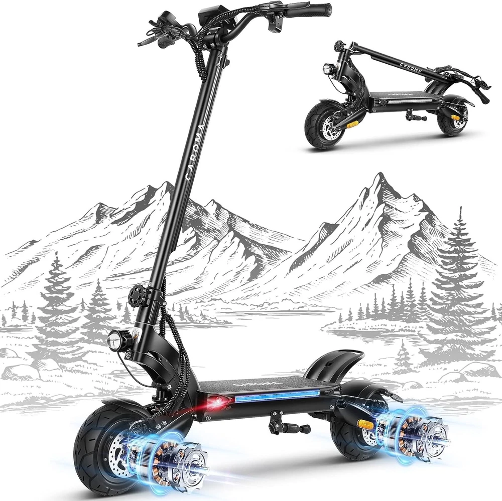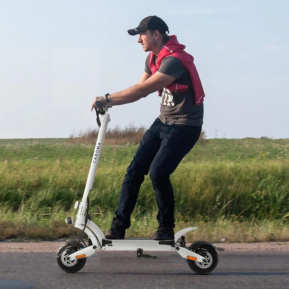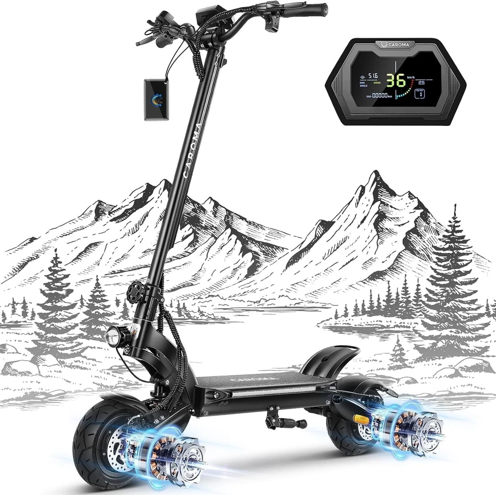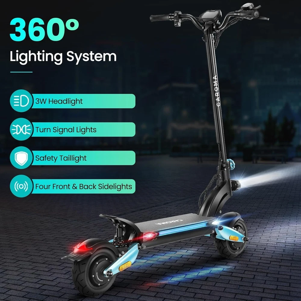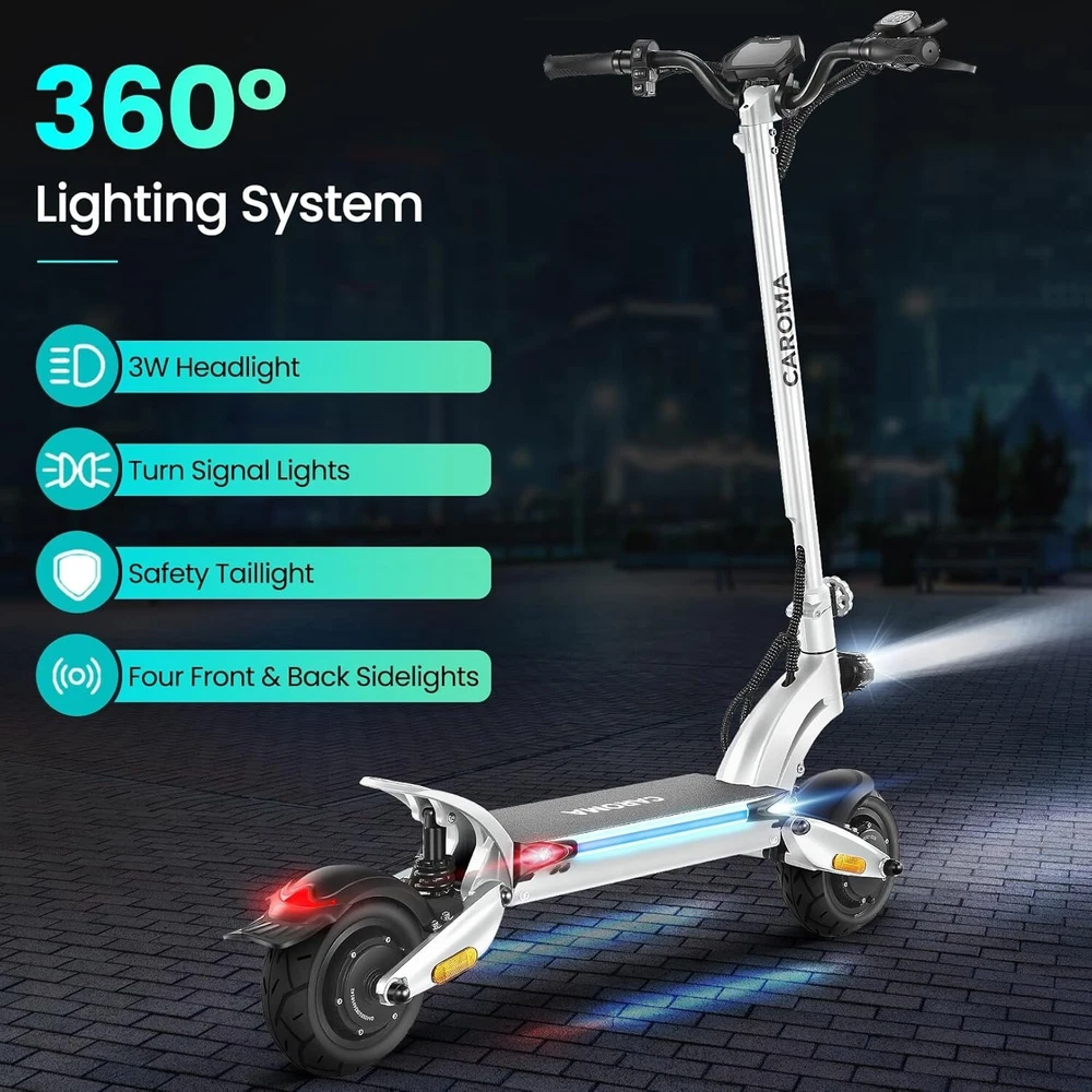 Product Description About this item High Performance Off Road Electric Scooter: The Caroma off-road electric scooter for adults is equipped with 2600W motor (rated 1600W) and an impressive top speed of 36 MPH. 2600W motor makes it easier for riders to conquer challenging terrains, effortlessly overtakes traffic, and navigate the city streets and 30° slope. Max load up to 330 lbs Superior Dual Shock Absorption: Front and rear shock-absorbing rocker arms and 8.5” fat off-road tires transform every ride into an enjoyable experience. No matter the road conditions, you'll glide smoothly and joyfully Long Life Battery: The high-capacity 48V 18.2Ah battery elevates your riding experience with an extraordinary range of up to 37 miles on a single charge. Dual charging ports reduce charging time from 8 hours to 4 hours. Whether you're off-road riding, commuting to work or city walking, this adult electric scooter ensures you reach your destination without worry Superior Dual Hydraulic Braking System: Safety is paramount. Front and rear full hydraulic disc brakes controlled by two EABS brake provide unparalleled stopping power in all conditions. Whether you're navigating crowded urban streets or navigating steep downhill slopes, you can rely on the e scooter for adults responsive brakes to keep you safe Advanced 360° Lighting System: Illuminate your path and make a statement with Caroma dual motor electric scooter for adults all-around lighting system. Powerful headlight pierces through the darkness, while two fisheye lights and side light add flair to your night-time rides. Taillight and two turn signals enhance visibility, making sure you stay safe and stand out during nighttime adventures Safety: The product is UL 2272 certified