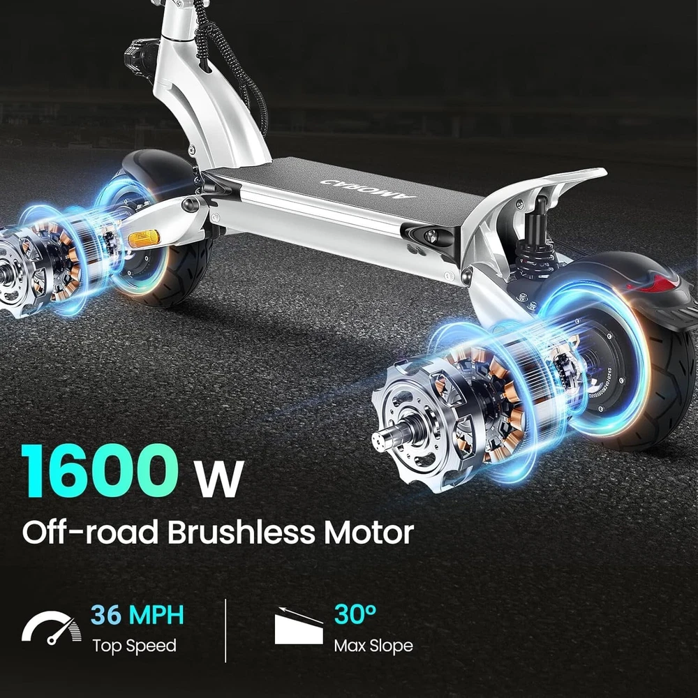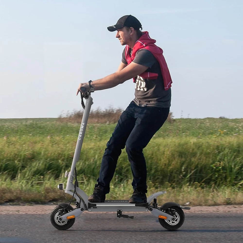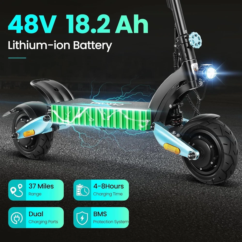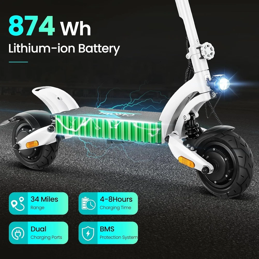 Product Description About this item High Performance Off Road Electric Scooter: The Caroma off-road electric scooter for adults is equipped with 2600W motor (rated 1600W) and an impressive top speed of 36 MPH. 2600W motor makes it easier for riders to conquer challenging terrains, effortlessly overtakes traffic, and navigate the city streets and 30° slope. Max load up to 330 lbs Superior Dual Shock Absorption: Front and rear shock-absorbing rocker arms and 8.5” fat off-road tires transform every ride into an enjoyable experience. No matter the road conditions, you'll glide smoothly and joyfully Long Life Battery: The high-capacity 48V 18.2Ah battery elevates your riding experience with an extraordinary range of up to 37 miles on a single charge. Dual charging ports reduce charging time from 8 hours to 4 hours. Whether you're off-road riding, commuting to work or city walking, this adult electric scooter ensures you reach your destination without worry Superior Dual Hydraulic Braking System: Safety is paramount. Front and rear full hydraulic disc brakes controlled by two EABS brake provide unparalleled stopping power in all conditions. Whether you're navigating crowded urban streets or navigating steep downhill slopes, you can rely on the e scooter for adults responsive brakes to keep you safe Advanced 360° Lighting System: Illuminate your path and make a statement with Caroma dual motor electric scooter for adults all-around lighting system. Powerful headlight pierces through the darkness, while two fisheye lights and side light add flair to your night-time rides. Taillight and two turn signals enhance visibility, making sure you stay safe and stand out during nighttime adventures Safety: The product is UL 2272 certified