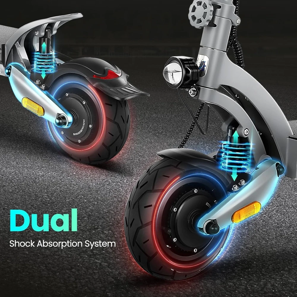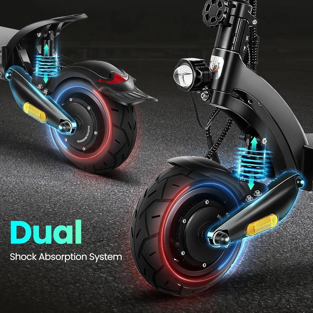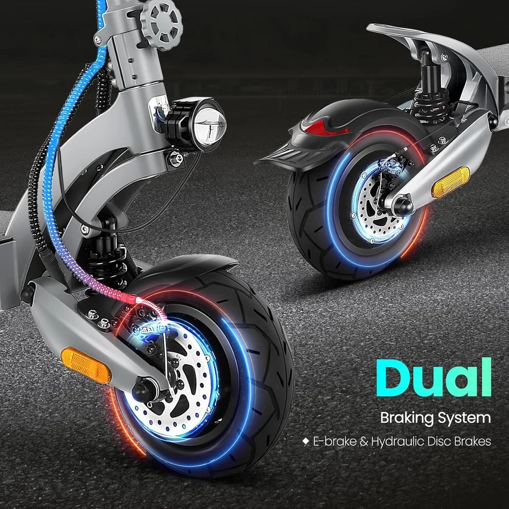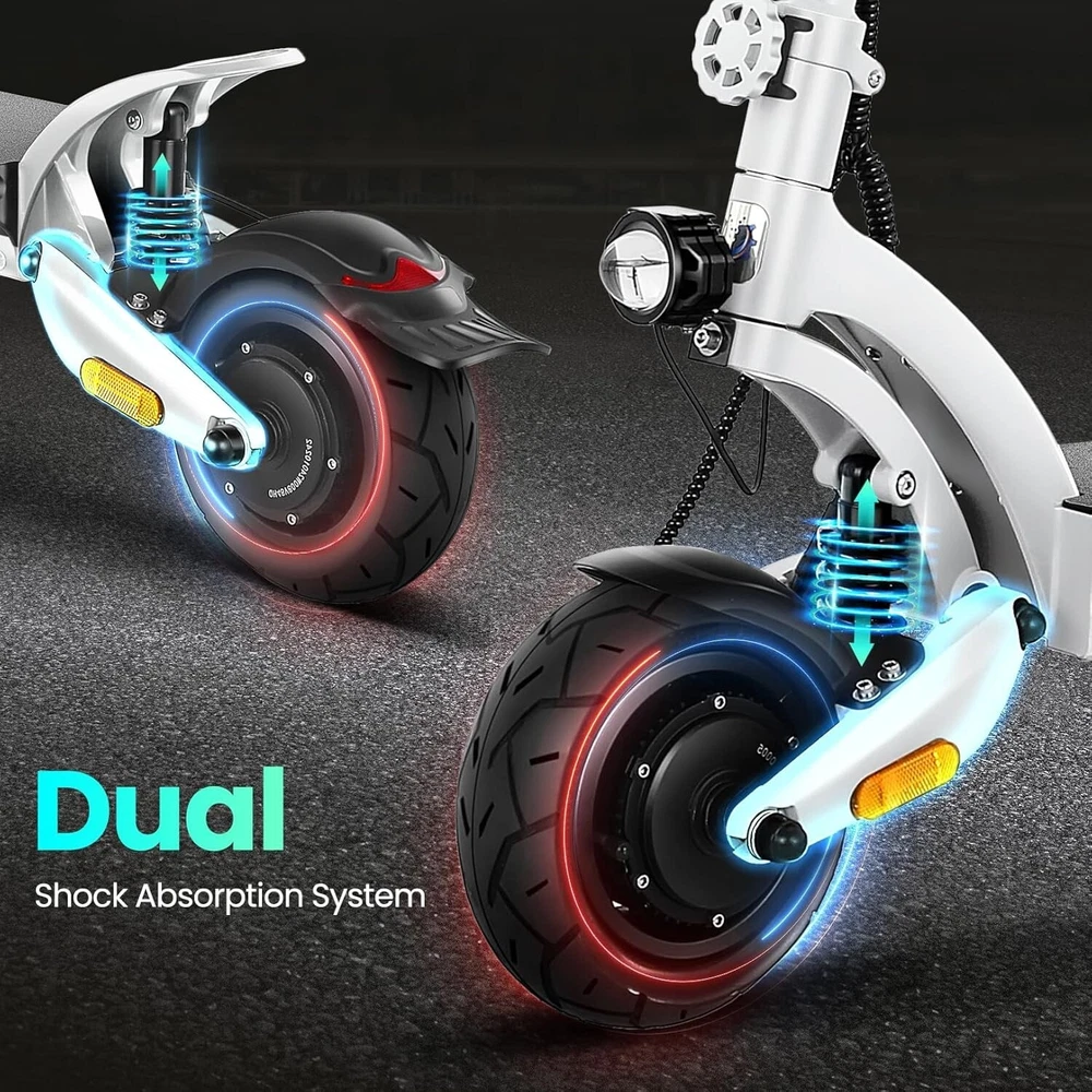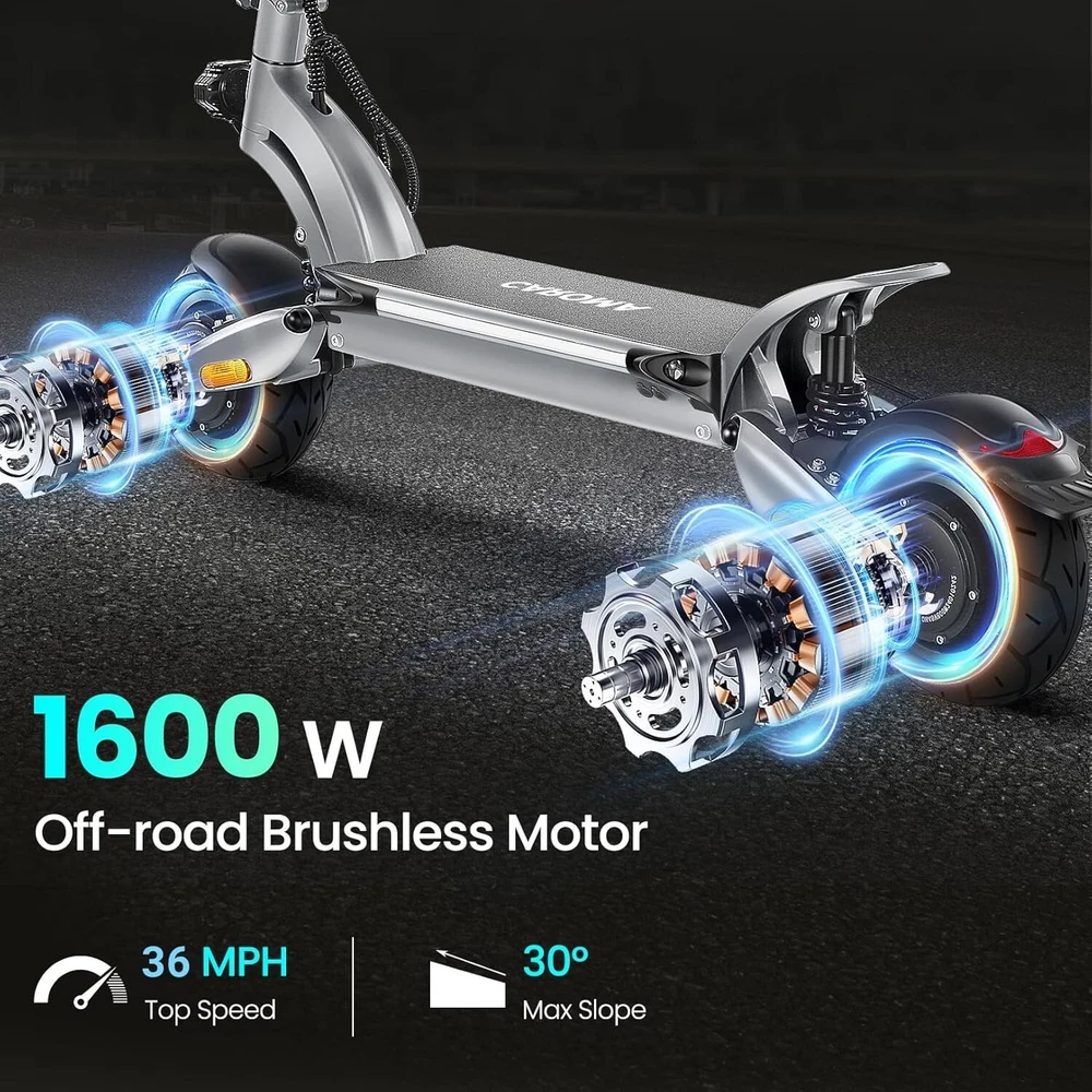 Product Description About this item High Performance Off Road Electric Scooter: The Caroma off-road electric scooter for adults is equipped with 2600W motor (rated 1600W) and an impressive top speed of 36 MPH. 2600W motor makes it easier for riders to conquer challenging terrains, effortlessly overtakes traffic, and navigate the city streets and 30° slope. Max load up to 330 lbs Superior Dual Shock Absorption: Front and rear shock-absorbing rocker arms and 8.5” fat off-road tires transform every ride into an enjoyable experience. No matter the road conditions, you'll glide smoothly and joyfully Long Life Battery: The high-capacity 48V 18.2Ah battery elevates your riding experience with an extraordinary range of up to 37 miles on a single charge. Dual charging ports reduce charging time from 8 hours to 4 hours. Whether you're off-road riding, commuting to work or city walking, this adult electric scooter ensures you reach your destination without worry Superior Dual Hydraulic Braking System: Safety is paramount. Front and rear full hydraulic disc brakes controlled by two EABS brake provide unparalleled stopping power in all conditions. Whether you're navigating crowded urban streets or navigating steep downhill slopes, you can rely on the e scooter for adults responsive brakes to keep you safe Advanced 360° Lighting System: Illuminate your path and make a statement with Caroma dual motor electric scooter for adults all-around lighting system. Powerful headlight pierces through the darkness, while two fisheye lights and side light add flair to your night-time rides. Taillight and two turn signals enhance visibility, making sure you stay safe and stand out during nighttime adventures Safety: The product is UL 2272 certified