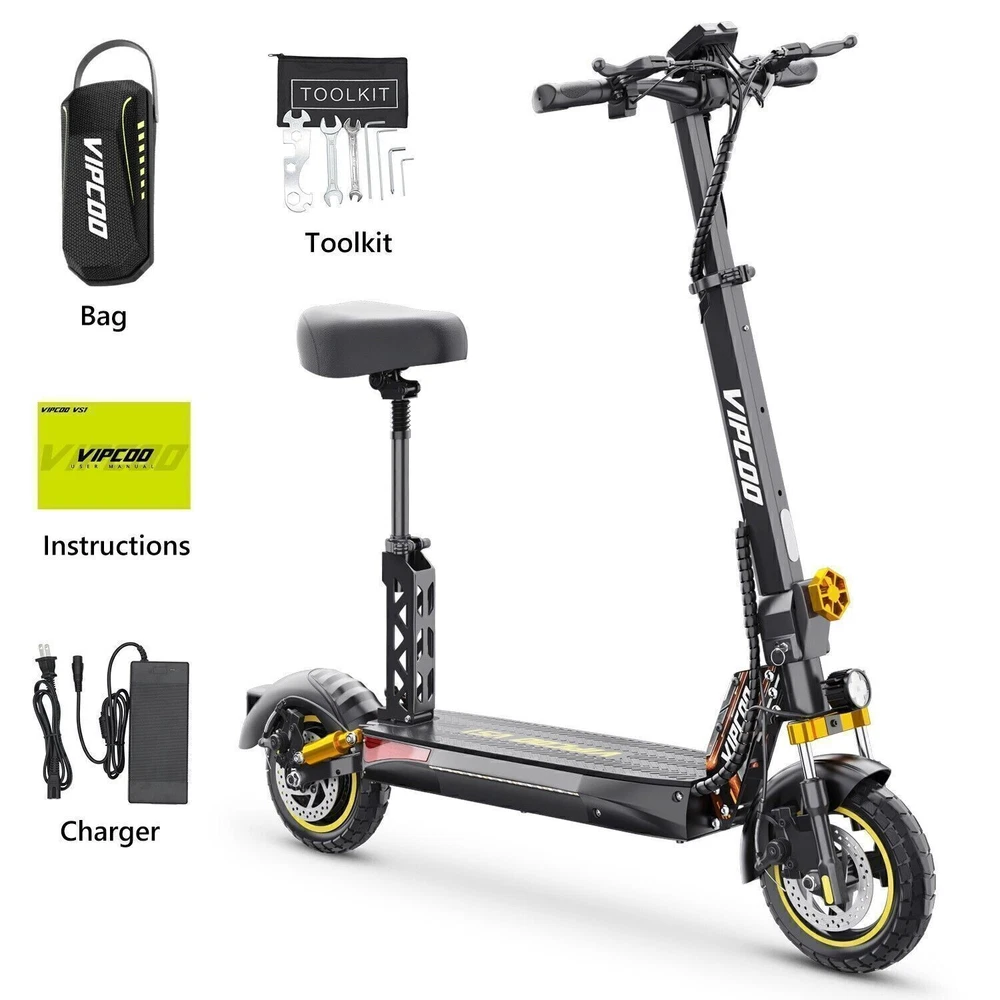 Product Description Model: VIPCOO VS1 Battery: 48V/13Ah Power: 700W Display Screen: Digital display Max Speed: 28 MPH (45 KM/H) Range: 19 Miles (20-30 KM) Max Load: 265 lbs (120 KG) Tire Size: 10 inch Tyre Type: Off-road air tires Charging Time: 6-8 hours Frame Material: Aluminum alloy Net Weight: 25.2 KG Gross Weight: 29.5 KG Package Size: 122.5 × 23.5 × 52 cm Brake: Front and rear disc brakes Light: Front LED headlights, side lights, and taillights Adapter: Input: 100-240V~50/60Hz 3.0A Max, Output: 54.6V 2.0A Additional Notes: The max load capacity is the maximum weight the e-scooter can withstand. Max speed & range may vary depending on the rider's weight, riding style, ambient temperature, battery level, and terrain. Package contents: 1 x Electric scooter. 1 x Instruction 1 x Tool set. 1 x Main charger. 🛴A new option that allows you to freely across the city - Our New VS1 Adult Electric Scooter with Seat which is with powerful battery(48V 13Ah), makes it easier for you to complete daily travel, and one charge is enough for you to ride for 15-45 miles under specific conditions. 🛴Let You Ride As You Want, Easy to Drive - Our New VS1 Escooter has three different riding modes (Eco: 9Mph, D: 18Mph, S: 28Mph), you can choose the most suitable mode for you according to your needs, and the 700w powerful high brushless motor allows you ride speed up to 28Mph, and handle all kinds of road conditions with ease! 🛴Comfortable Riding Experiences, Let You Enjoy Every Trip - Our New VS1 Electric Scooter for Adult adopts front and rear wheel suspension system and 10inch pneumatic tires, which means you can enjoy a smoother and more comfortable riding experience, even on rough roads! 🛴Make Your Safety More Secure - Our New VS1 Escooter for Adult is not only equipped with super bright headlight & taillight, but also has a side ambient light, which improves the safety of night riding and allows you to travel with peace of mind at any time. The perfect front & rear dual brakes and electronic braking system allow you to stop whenever you want. 【Important Note】- The max speed and max range of per full charged vary based on a lot factors, including: rider's weight, riding surface, incline, ambient temperature, battery level, riding style (stop/start vs cruising), wind direction, wind speed etc “Warning: It is illegal to ride electric scooters on public roads, pavements, or cycle paths. They are intended only for use on private land with the owner’s permission. See Guidance for local areas and rental operators of e-scooters.{e253595-1081650x} Our product: (1) Our product approved by UL2272/CE/ROHS certificates (2) Every piece of spare part will be inspected before assembling and very piece of completed product will be tested before shipment. Electric Scooter For Adult 24OOW Motor 37Miles Range,10-Inch Off-Road Tire 37mph 1078.0 USD Free shipping AOKDA-A1 Electric Scooter for Adults Teens Folding E-Scooter Commuter 48V/12.5Ah 250.38 USD 357.69 USD 39.99 USD 30% off 600W Electric Scooter Adults Teens Folding E-Scooter with Seat 48V/10AH 45Km/h 497.17 USD 599.0 USD Free shipping 17% off iENYRID 24OOW Dual Motor Electric Scooter Adult 10" Off-Road Tires + Seat 48V US 1200.0 USD Free shipping powered by