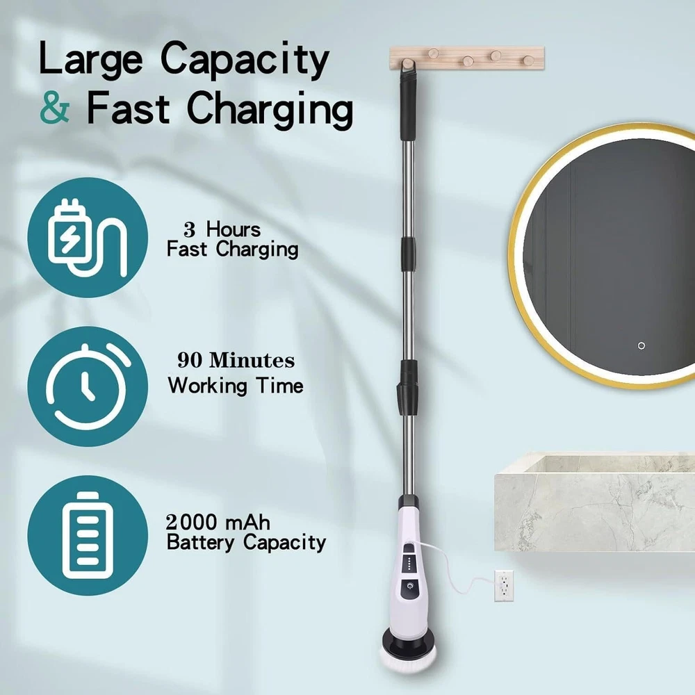 Electric Spin Scrubber Cordless Electric Bathroom Scrubber with 9 Replaceable Brush Heads and Adjustable Handle Brushes for Cleaning bathrooms Suitable for Tiles Floors Product Details Brand: Hehongyuan Color: White Handle Material: Stainless Steel Product Dimensions: 17.32"L x 6.69"W x 3.15"H Material: Plastic Brand: Hehongyuan Color: White Handle Material: Stainless Steel Product Dimensions: 17.32"L x 6.69"W x 3.15"H Material: Plastic Shape: L-Shape Surface Recommendation: Floor, Tile Number of Items: 1 Item Weight: 2.43 pounds Country of Origin: China Item model number: DDQJS01 Batteries: 1 Lithium Ion batteries required. (included) Date First Available: July 2, 2024 Powerful Cleaning Tool: Equipped with a 2000mAh battery and Two speed adjustment ,this electric spin scrubber easily tackles stubborn stains,You can see its remaining battery level on the screen,Very suitable for your daily household chores, while getting rid of the annoying wires of traditional electric brushes,The lightweight design makes household chores easy and enjoyable Versatile Brush Heads: Includes 9 replaceable brush heads for different cleaning scenarios such as bathroom, kitchen, floor, tile, and car, you can choose different specifications of brush heads according to your actual situation Adjustable Handle: The handle can be extended from 12 inches to 54 inches, making it easy to reach high and low places without bending,It is an ideal choice for cleaning hard to reach areas, and the long handled bathroom washer frees housewives from tedious household chores, eliminating the need to bend and kneel down for cleaning, protecting your back and knees Long Battery Life: Enjoy up to 90 minutes of continuous cleaning with just 3 hours of fast charging using the Type-C cable,Strong magnetic motor, high torque, no overheating, lifespan up to 500 hours, product power 25W Waterproof and Safe: IPX5 waterproof rating ensures safe usage in wet environments, while the high-pressure protection feature prevents scratches,Please note do not totally immerse the scrubber in water, you can use a damp rag to clean it