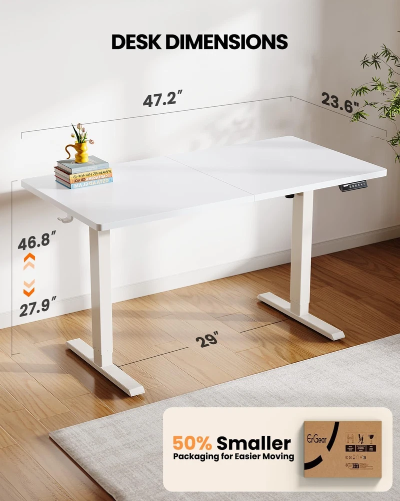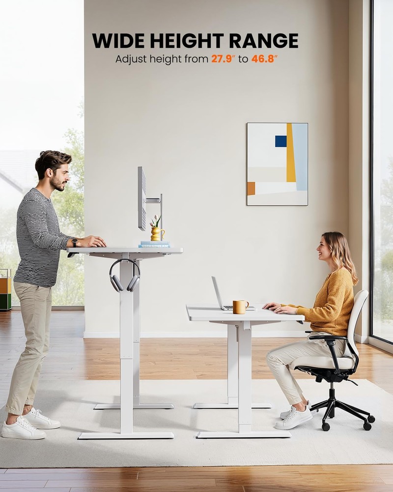 Tested Stability & Durability: Crafted from automotive-grade cold-rolled steel, ’s standing desk is built to last with superior strength and stability. Powered by a durable motor tested to withstand 50,000 lift cycles, this sit stand up desk provides a rock-solid foundation and long-lasting performance. Sit-Stand Flexibility: The adjustable height standing desk offers a wide height range from 27.9″ to 46.8″ tall, making it easy to switch between sitting and standing positions. Transform your home office into a more dynamic workspace that encourages better posture, boosts energy, and enhances focus. Upgrade your Workspace: The spacious 47.24″ x 23.62″ surface of this rising desk provides plenty of room to arrange monitors and a laptop along with your keyboard and mouse on top. Available in a range of colors and sizes, you can choose the perfect computer desk dimensions to fit your office setup. 4 Memory Height Presets: Save your favorite height settings using the four preset buttons on the electric standing desk’s controller. Once saved, a single button press allows you to quickly transition between your preferred sitting and standing positions throughout the day. Hassle-Free Assembly: The sit stand home office desk includes detailed instruction manual and labeled parts to make assembly a breeze. Feel free to contact our U.S.-based product support team if you have any questions about stand up desk assembly or product selection.