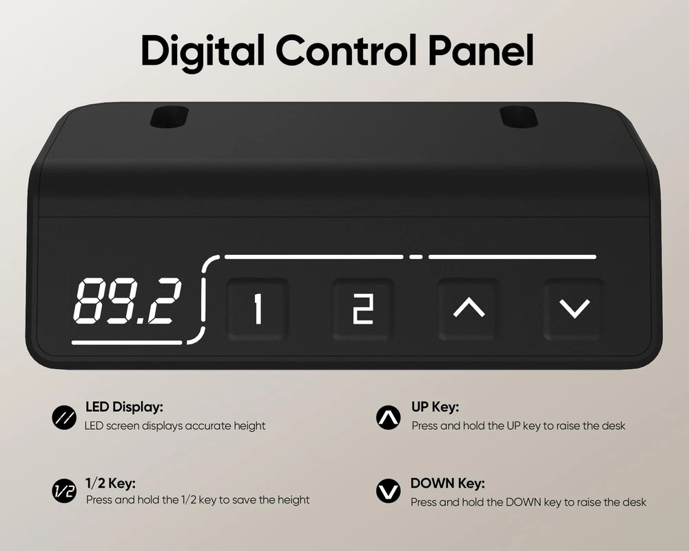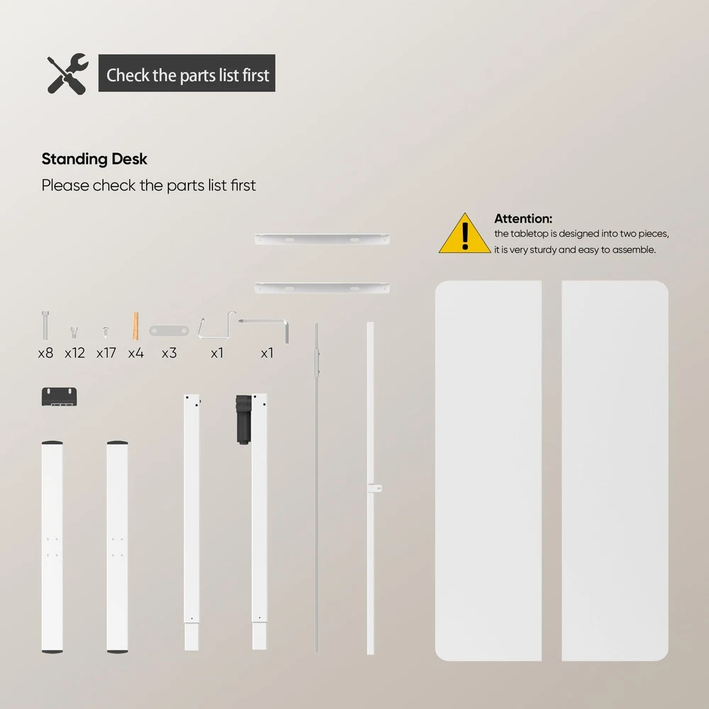Outstanding Stability: The electric standing desk has a sturdy solid steel frame with aerospace-grade lifting column connectors (still stable & secure after testing 50,000 times). Electric Height Adjustable: The stand up desk features two preset buttons to customize your desired heights from 28" to 46.5". Dependable Home Office Desk: The spacious 40” x 24” adjustable desktop offers a roomy setup that promotes an ergonomic workspace. Solid Material: Our sit stand desk applied an industrial-grade alloy steel frame combined with a solid desktop that allows for a 154 lbs weight capacity. Simplified Assembly: The height adjustable desk has an easier assembly process with fewer steps and less lifting. FSC desktop: The desktop is made of FSC-certified wood Attention: Sind wings "F" should face inward. If the two parts "F" are installed in the opposite direction, it will cause the table to be longer than the tabletop. Premium Quality & Stability: Crafted with an industrial-grade alloy steel frame and FSC-certified wood desktop, our standing desk provides exceptional stability, supporting up to 154 lbs, even after 50,000 tests. Ergonomic Health Benefits: Promote a healthier work lifestyle with our spacious 40”x24” adjustable desktop. Easily switch between sitting and standing positions to improve posture, boost energy, and enhance focus. Simple Setup: Enjoy hassle-free assembly with fewer steps and less lifting. All tools and detailed instructions are included for a quick setup. Smart Features: Two preset buttons allow quick height adjustments from 28” to 46.5”. The whisper-quiet motor (under 45 dB) ensures smooth, quiet operation. Cable management structures keep your workspace tidy. Perfect for Home Office: Ideal for remote workers, our desk helps maintain a healthy work-life balance. Designed for laptops, desktops, and monitors, it’s a versatile addition to any home office. Exceptional Value: Invest in your health and productivity with our premium electric standing desk. High-quality materials and innovative features make it a smart choice for your workspace.