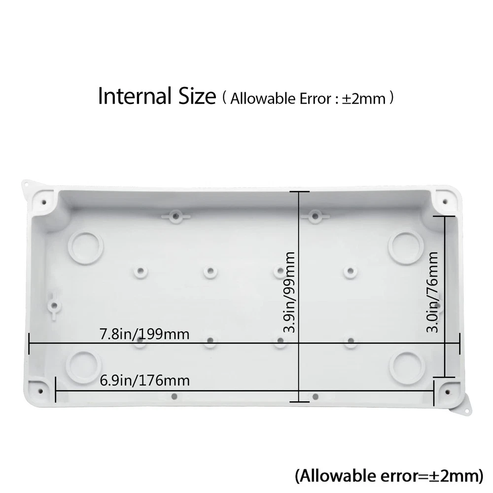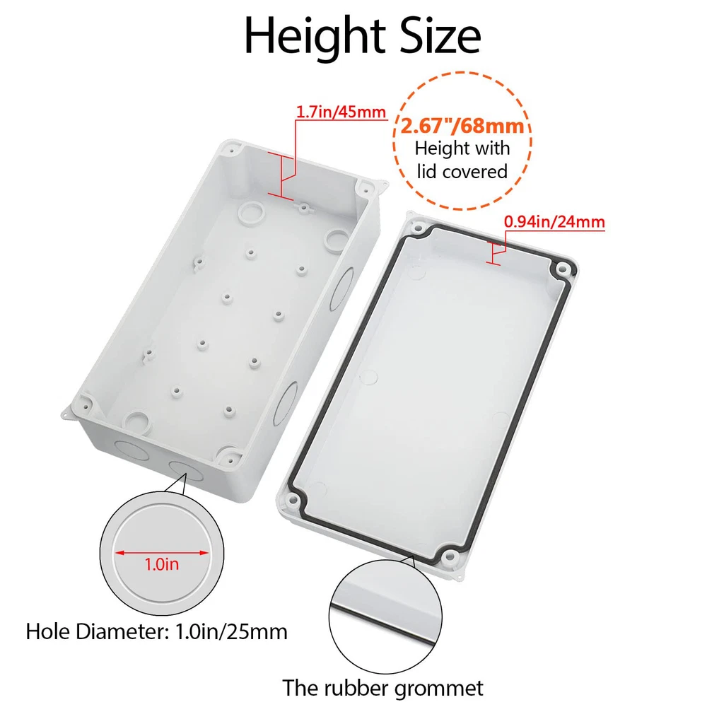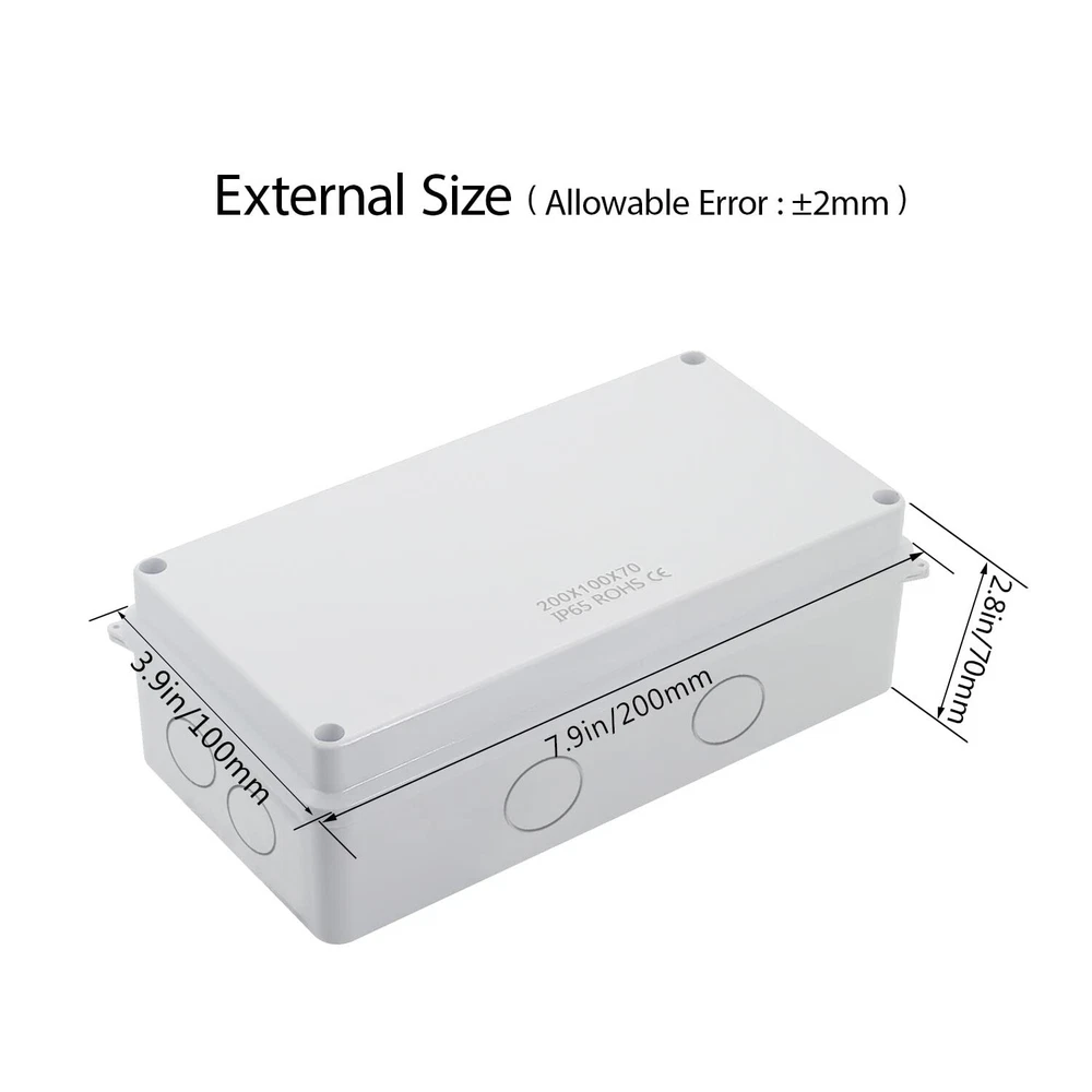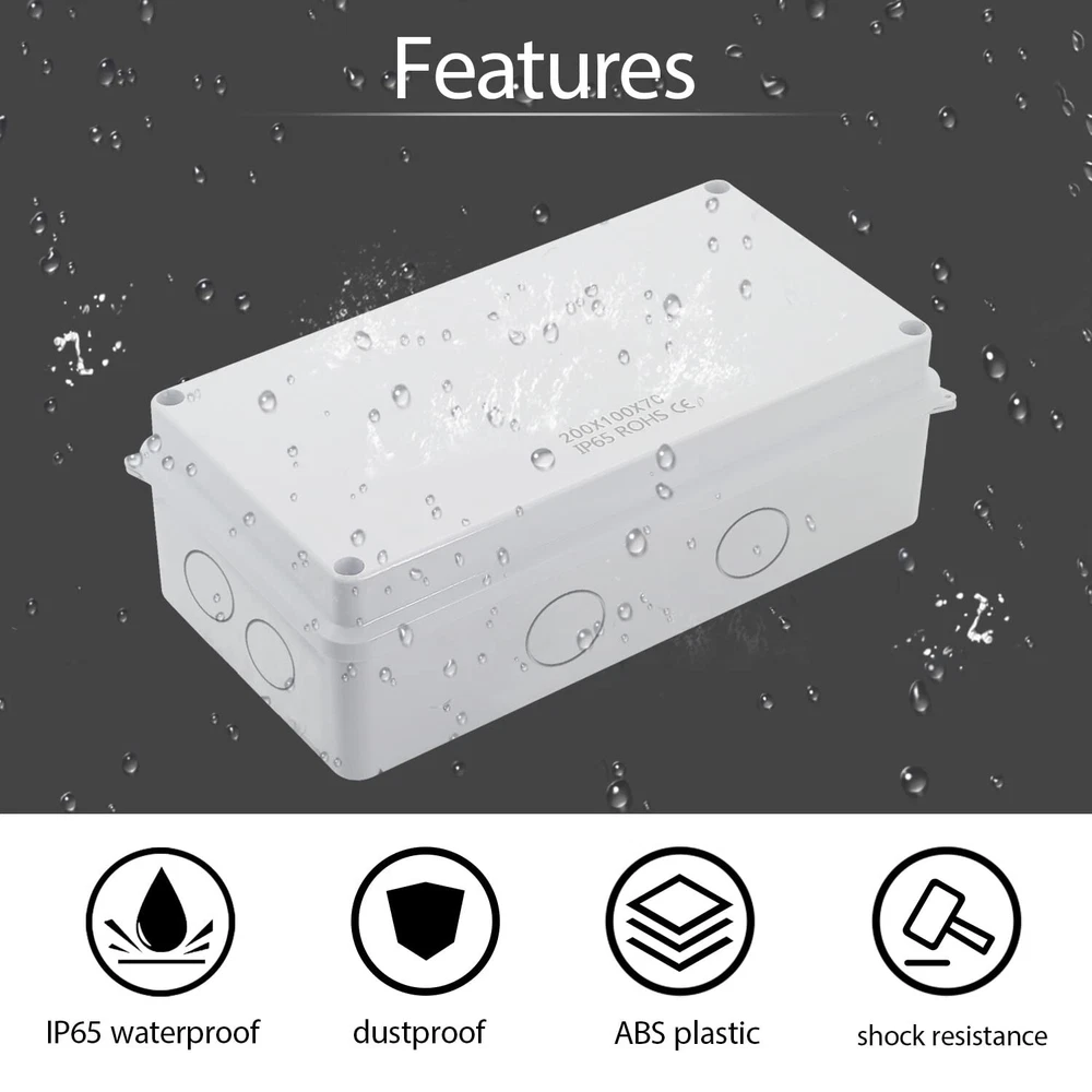 Features: [ Sturdy Construction ] Electrical Junction box is made of high-quality ABS plastic material, which offers excellent impact resistance and electrical insulation. Rest assured that your equipment will be well-protected in harsh environments. [ Safe and Certificated ] With CE RoHS compliant and waterproof rated, the electrical box is free of hazardous substances. The plastic box is predrilled which is easy to install and modify for your project. [ Indoor and Outdoor Use ] With the feature of water resistance and dustproof,it can effectively block splashing water, rain, dust, snow, oil, UV and more. Whether you need to use it indoors or outdoors, this surface mounted project box is easy to operate. [ Extensive Application ] Our junction box is used in a variety of applications: residential homes wiring and connecting electrical devices, such as light fixtures, switches, and outlets; protect and connect electrical equipment for machines, motors etc. Size: 7.87"x3.93“x2.75" Package Included: 1x Electrical Junction Box