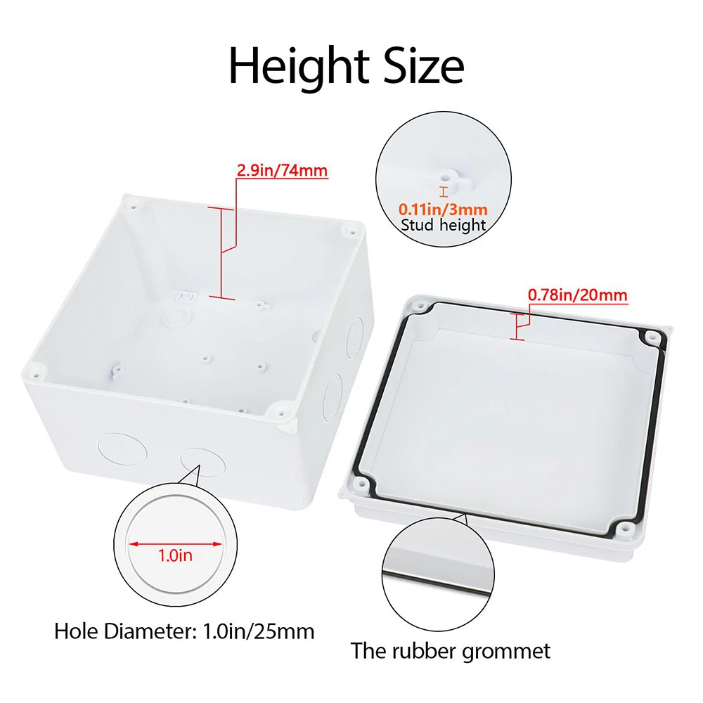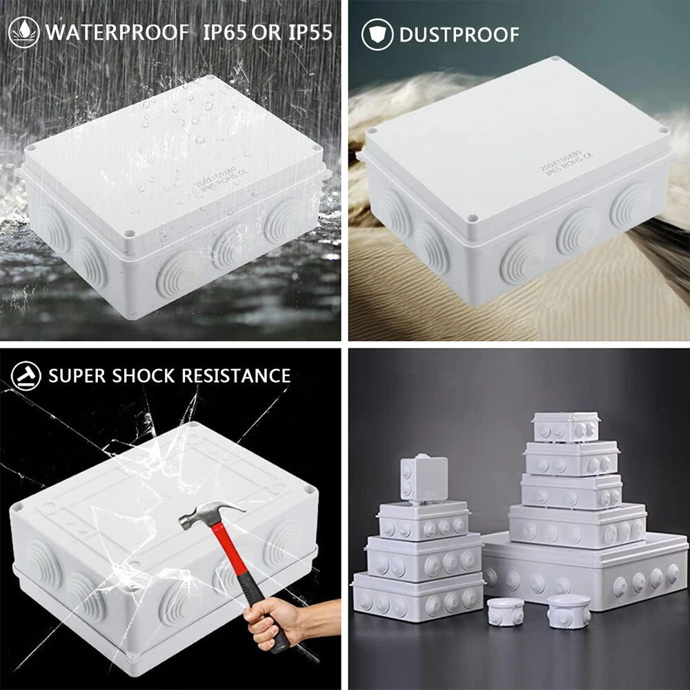 Features: [ Sturdy Construction ] Electrical Junction box is made of high-quality ABS plastic material, which offers excellent impact resistance and electrical insulation. Rest assured that your equipment will be well-protected in harsh environments. [ Safe and Certificated ] With CE RoHS compliant and IP55 or IP65 waterproof rated, the electrical box is free of hazardous substances. The plastic box is predrilled which is easy to install and modify for your project. [ Indoor and Outdoor Use ] With the feature of water resistance and dustproof,it can effectively block splashing water, rain, dust, snow, oil, UV and more. Whether you need to use it indoors or outdoors, this surface mounted project box is easy to operate. [ Extensive Application ] Our junction box is used in a variety of applications: residential homes wiring and connecting electrical devices, such as light fixtures, switches, and outlets; protect and connect electrical equipment for machines, motors etc. Note: There are some junction boxes is IP55 Waterproof, please check the IP Rate before you ordering. Package Included: 1x Electrical Junction Box