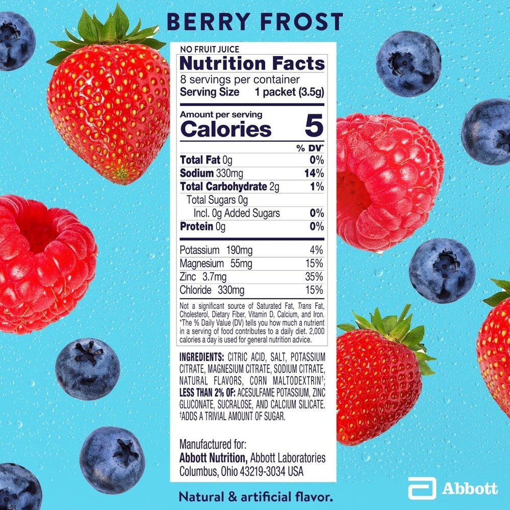 Electrolyte Drink Mix With Zero Sugar | Hydration With Key Electrolytes | Great Hydration Low in Calories | Berry Frost, 8 Powder Packets ELECTROLYTE DRINK MIX WITH ZERO SUGAR AND LOW IN CALORIES: Electrolyte Drink Mix With Zero Sugar powder packets help hydrate and have key electrolytes 3 KEY ELECTROLYTES: Has 3 key electrolytes for hydration: sodium, chloride, and potassium ELECTROLYTE DRINK MIX FREE OF GLUTEN AND ARTIFICIAL COLORS: Electrolyte drink mix that is gluten-free with no artificial colors RECOMMENDED BRAND: From , the #1 doctor-recommended brand for hydration GREAT-TASTING ELECTROLYTES POWDER: Berry Frost is a blend of berry flavors that’s vibrant and refreshing NOT FOR KIDS UNDER 5: Electrolyte Water Drink Mix is not for children under 5 years of age for mild to moderate dehydration due to vomiting and diarrhea Shipping We offer FREE shipping on all orders! We ship within Three business days of payment, usually sooner. We use a selection of shipping services such as UPS, FedEx, USPS etc. We only ship to the lower 48 states, no APO/FPO addresses or PO Boxes allowed. Local pickups and combined shipping options are not provided at this time. Return You can return a product for up to 30 days from the date you purchased it. Any product you return must be in the same condition you received it and in the original packaging. Please keep the receipt. Payment We accept payment by any of the following methods: PayPal Please pay as soon as possible after winning an auction, as that will allow us to post your item to you sooner! Feedback Customer satisfaction is very important to us. If you have any problem with your order, please contact us and we will do our best to make you satisfied. Contact Us If you have any queries, please contact us via ebay. We usually respond within 24 hours on weekdays. Please visit our eBay store to check out other items for sale! Thank you for shopping at our store.