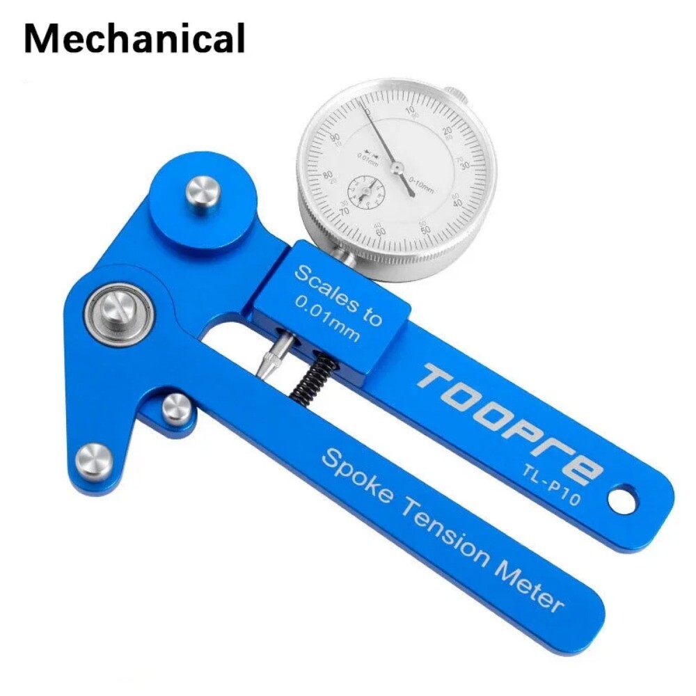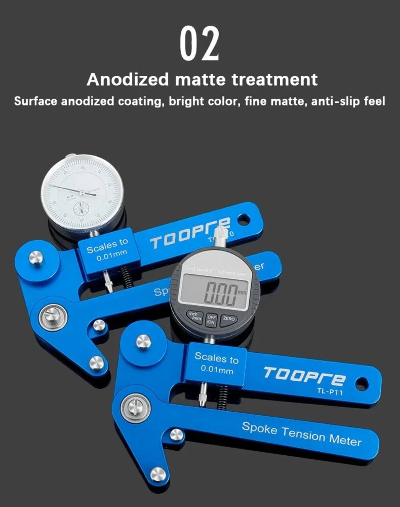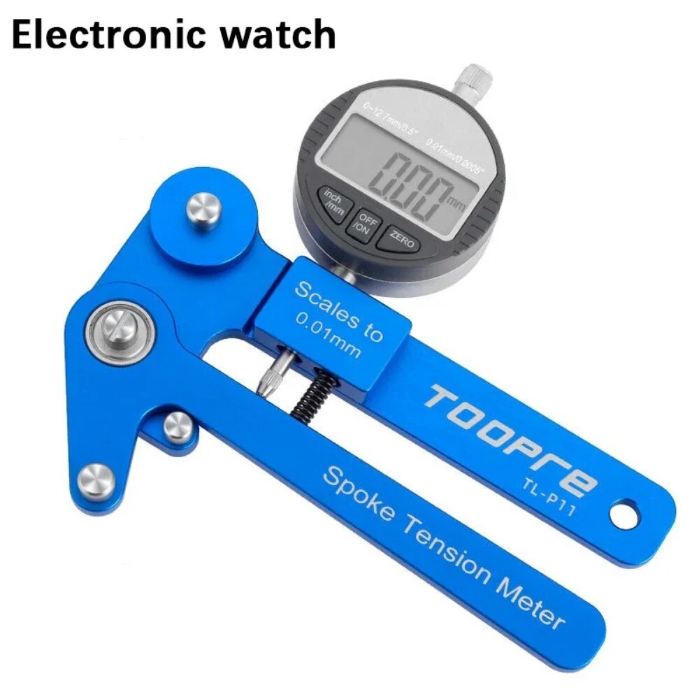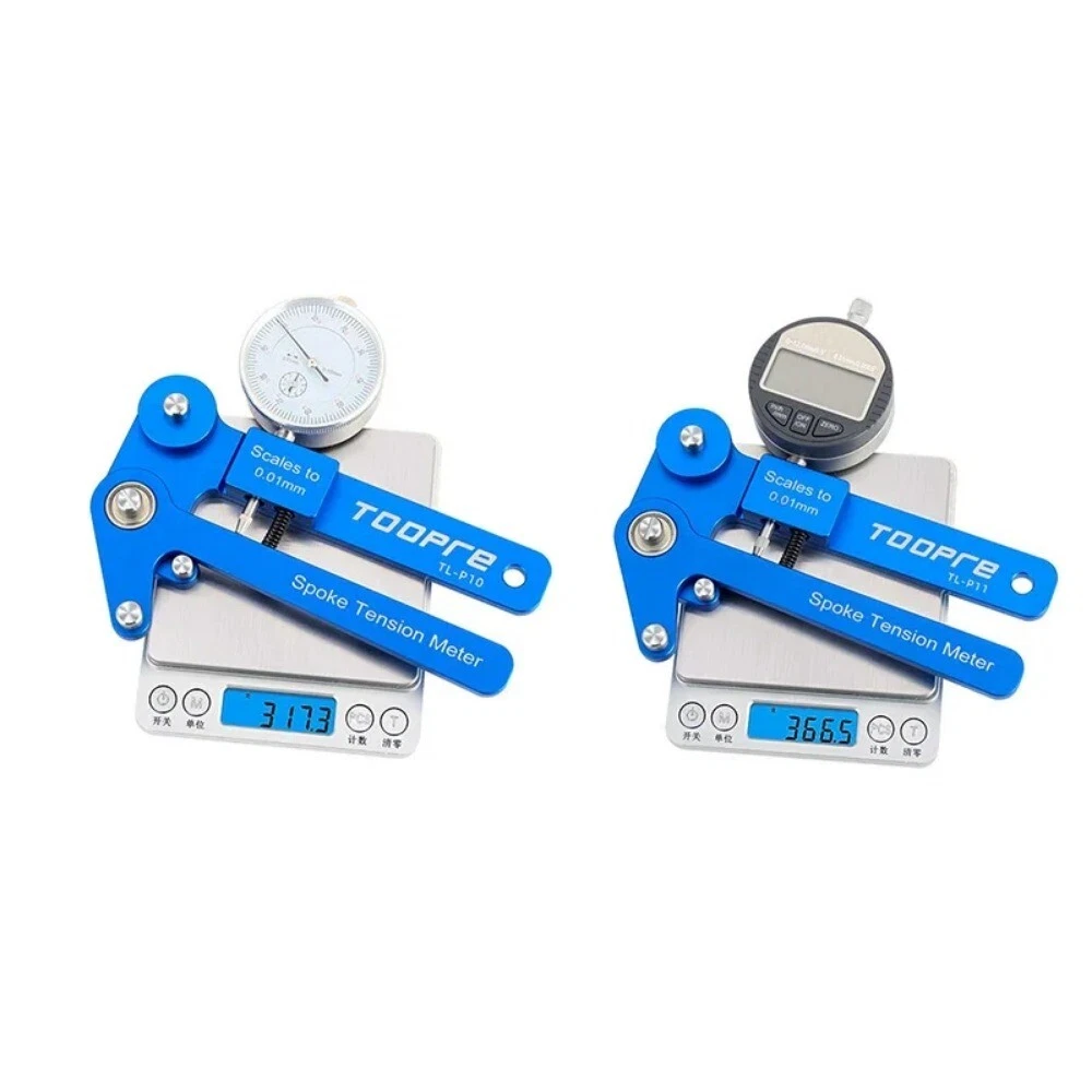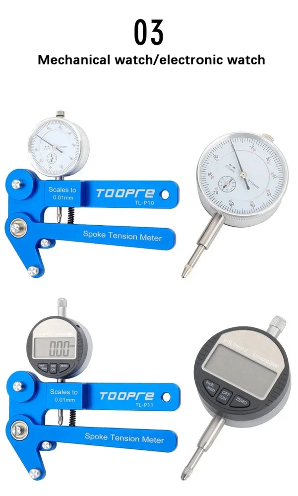 Name:Bicycle Spoke Tensiometer Model:TL-P10(Mechanical Model),TL-P11(Electronic Model) Material:Aluminum Alloy+Stainless Steels Color:Blue Package Size:205X195X60mm Usage:Determines spoke tension for round and flat spokes as well as for various finished wheelsets. Product Name: Spoke Tensiometer Material: Aluminum alloy Model: Mechanical watch TL-P10, electronic watch TL-P11 Weight: 513g/set for mechanical models, 565g/set for electronic models Packaging: Color box (including 1 tension meter, 1 Chinese and English instruction manual, 1 tension comparison table, and 1 spoke wrench)