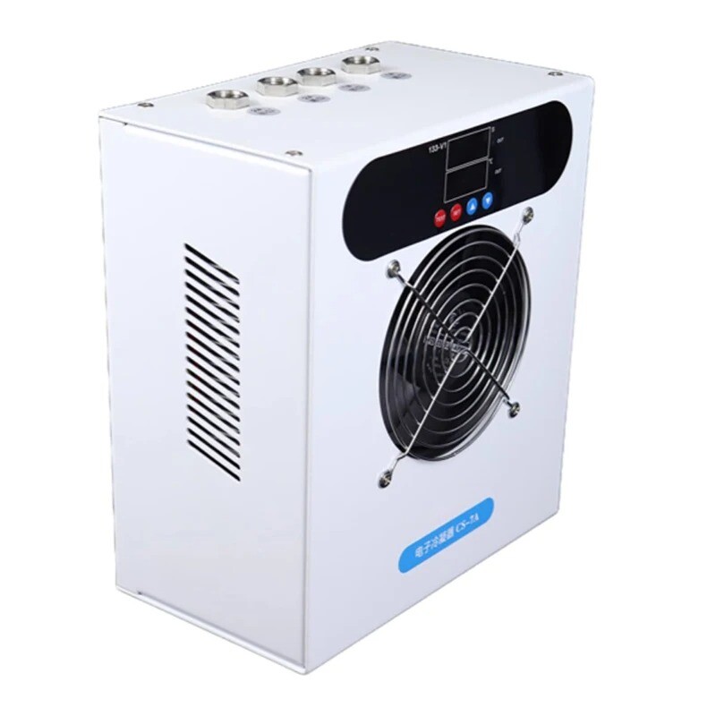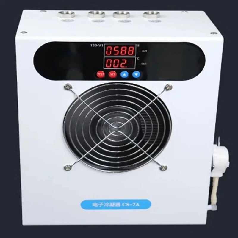 Electronic condenser small dual channel smoke detector stainless steel cold cavity CEMS gas dehumidification cooler Name: Electronic condenser Model: CS-7A Voltage: AC 220V 50Hz Rated current: 0.7A Power: 150W Flow: 10L/min Outlet dew point: ≤5℃ Rated pressure: ≤0.2Bar Air inlet: G1/4 Air outlet: G1/4 Drainage outlet: Φ5 Drainage method: peristaltic pump Inlet temperature: ≤60℃ Cold cavity temperature: 0-10℃ Drainage time: 0-9999S Number of channels: 2 Size: 240*127*290MM Working environment temperature: 0-35℃ Bottom mounting hole size: 230*89MM hole Φ7 Back mounting hole size: 177*237MM hole Φ7 Product introduction: This product is an electronic refrigeration gas condenser. It is used to cool the hot and humid sample gas to reduce the water content of the sample gas to achieve the purpose of gas-liquid separation.