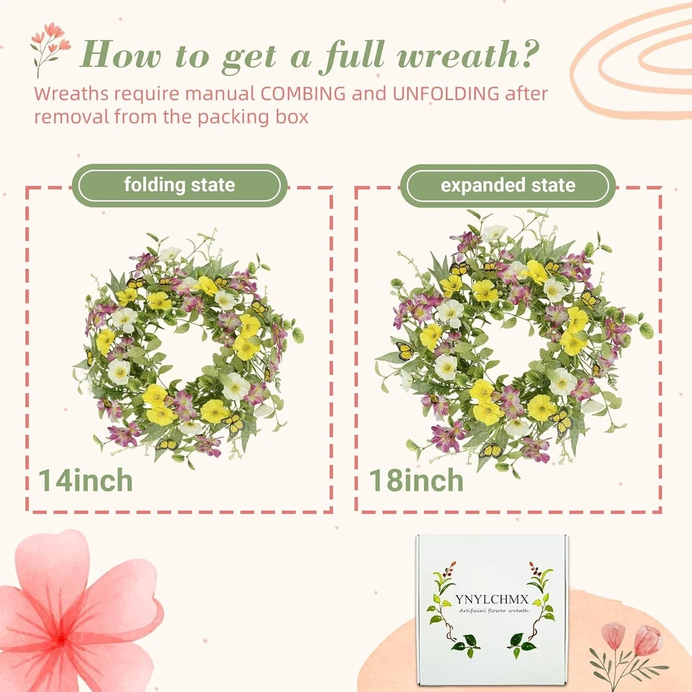Elegant 18-Inch Spring Summer Wreath with Daisies & Butterflies for Every Door ‹ › ‹ › ‹ › ‹ › ‹ › ‹ › ‹ › ‹ › ‹ › Elegant 18-Inch Spring Summer Wreath with Daisies & Butterflies Transform your home into a vibrant oasis with this stunning Spring Summer Wreath adorned with beautiful daisies and whimsical butterflies. Measuring an ideal 18 inches in diameter, this wreath is perfectly sized for adorning your front door, creating an inviting entrance while celebrating the beauty of each season. Features: Realistic Design: Surrounded by lush eucalyptus leaves, colorful daisies, and delightful butterflies, this wreath exudes a lifelike charm that enchants throughout the . Versatile Applications: Use it to embellish your front door, windows, or as a vibrant wall decoration in your living room, fireplace, or kitchen. Easy Maintenance: Handcrafted from high-quality silk and durable iron coils, this artificial wreath is designed to endure. It requires no watering, trimming, or special maintenance, ensuring long-lasting beauty. Wreath Instructions: Arriving in a secure box to prevent damage during transport, simply unfold and shape it for a breathtaking full appearance. Why Choose Our Elegant Wreath? Step into a world of seasonal charm with this exquisite wreath that brings a fresh breath of spring and summer into your home. With its exquisite craftsmanship and vibrant colors, it’s not just a decorative piece; it’s a statement of elegance and personality. Perfect for creating a warm welcome for your guests or as a delightful gift for loved ones, this wreath enhances your living space with natural beauty and joy. Indulge in the luxury of effortless decoration—order your Elegant Spring Summer Wreath today and let your home blossom with style! Shipping Free & Fast Shipping - We offer free shipping to most of the USA with a normal delivery time of 3-7 days. However, due to the current situation, additional delivery time (up to 3 weeks) may be required for some items. Alternative Carriers - We may use alternative carriers (e.g. USPS, FedEx, UPS, etc.) to ensure your package arrives safely and on time. Due to the use of multiple carriers, we are unable to provide a tracking number automatically. Handling Time - Orders are processed and shipped within 1-2 business days of receiving cleared payment. Shipping Restrictions - Shipping to Alaska, Hawaii, Puerto Rico, Guam, and other US territories may incur shipping charges or delivery restrictions. Please contact us before ordering, or your order can be refunded/cancelled. State Restrictions - There may be restrictions based on your state of purchase. For example, certain items may not be shipped to California due to state regulations. Contact for Tracking Updates - If you require tracking updates or have any concerns about the delivery of your order, please feel free to contact us, and we will be happy to assist you. Return 30-Day Hassle-Free Returns - We want you to be completely satisfied with your purchase. If you are not, you can return the item within 30 days of receiving it for a full refund or exchange. Easy Return Process - To start a return, simply contact us and we will provide you with a prepaid return shipping label and detailed instructions. Restocking Fee - There are no restocking fees for returns. However, the buyer is responsible for return shipping costs if the return is not due to a seller's error. Refund Processing Time - Refunds will be processed within 5 business days of receiving the returned item in its condition. Payment We accept all major credit cards, PayPal, and Apple Pay for your convenience. Your payment information is secure and encrypted to ensure a safe and seamless transaction. Please complete your payment within 3 days of purchase to avoid any delays in shipping. Feedback Your feedback is extremely important to us. We strive to provide the best products and customer service possible. If you are satisfied with your purchase, please take a moment to leave us a positive review. If you have any concerns or issues with your order, please contact us before leaving negative feedback. We are committed to resolving any problems and ensuring your satisfaction. Contact Us If you have any questions or concerns, please feel free to out to our customer support team. You can contact us through the eBay messaging system. We are available Monday to Friday, 9:00 am to 5:00 pm EST, and we will do our best to respond to your inquiry within 24 hours. Buy it now and enjoy a pleasant shopping experience! Item Width: Spring Summer Wreaths Unit Quantity: 18 in Material: Silk,Iron Common Name: Daisy,Butterfly Product: Spring Summer Wreaths Form: Wreath Occasion: Casual Color: Yellow & Green Type: Wreath Artificial/Fresh: Artificial Size: 18 in Item Height: 20 Inches Number in Pack: 1 Unit Type: Unit