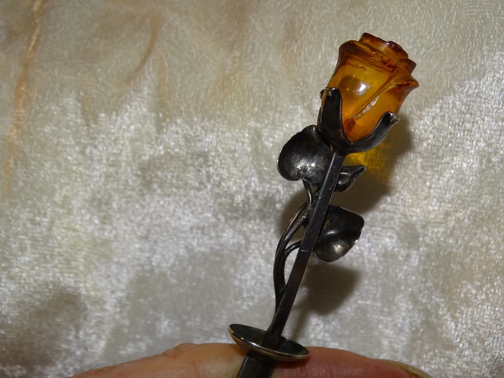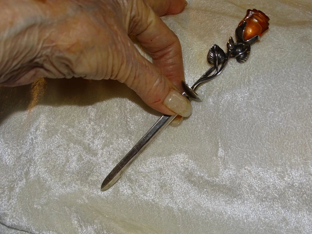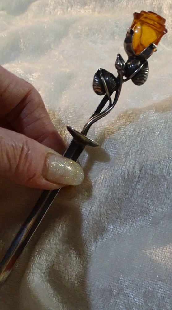 The Lovely Amber Rose 6" Very Strong Letter Opener is a vintage collectible made of a strong material and not signed. I have used it for several years with no problems opening just about anything, crafted in the United States. This elegant and sturdy letter opener features a unique design, making it a stylish and functional addition to any desk or office space. The hand carved amber rose is 1" long and with the stem and leaves almost 3". Its vintage appeal adds a touch of nostalgia to everyday tasks, while its strong material ensures durability for long-lasting use.