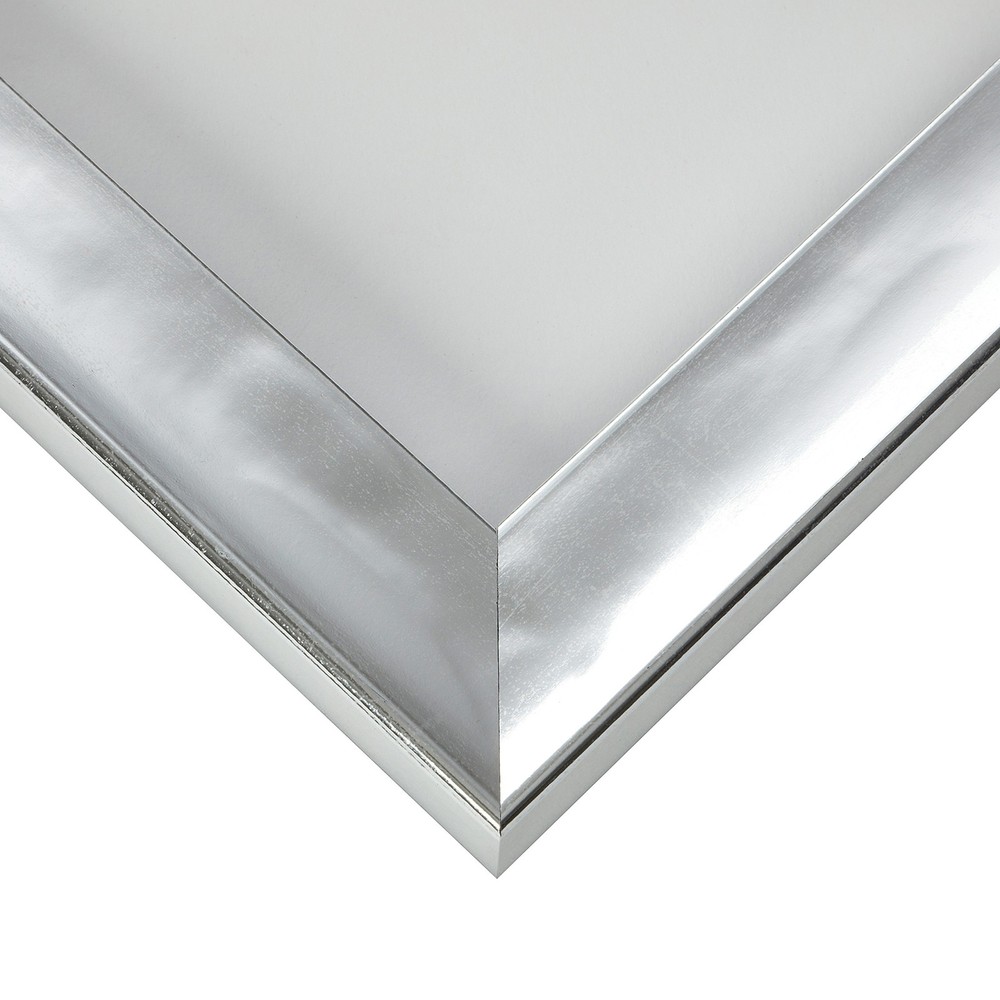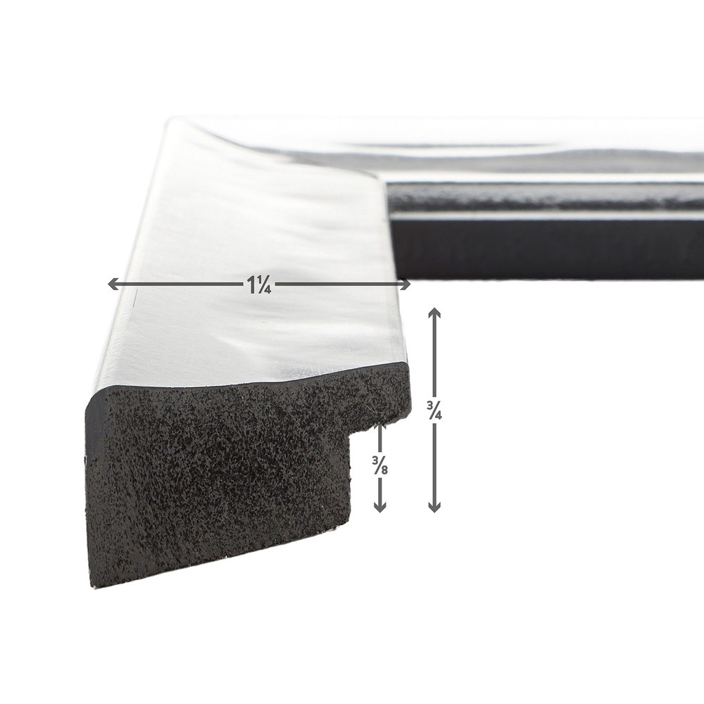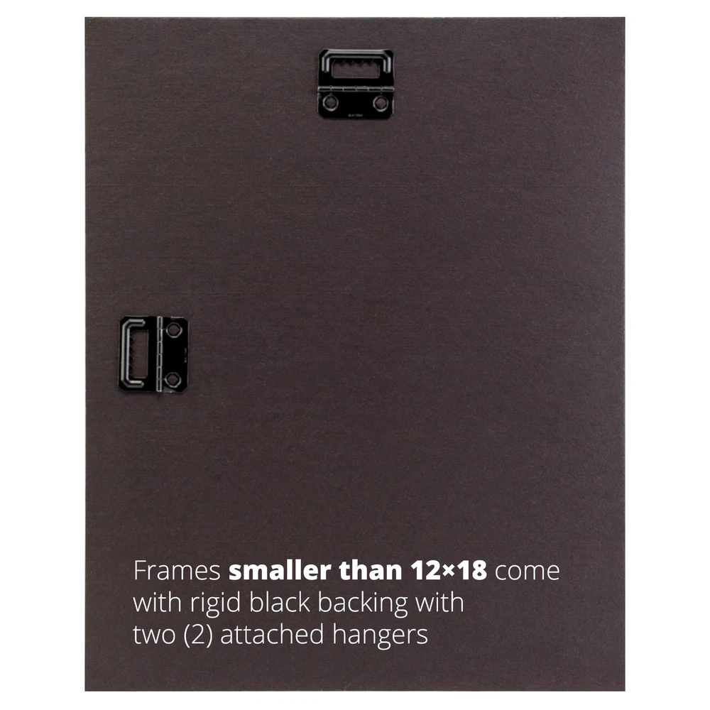 Modern style; scratched chrome/silver appearance; smooth finish (NOT ACTUAL METAL) Frame includes: glass, rigid black backing and pre-attached stamped hanging hardware Frame holds a 8 by 12-Inch photo/print/poster (viewable area reduced by .25" on each side due to frame lip) Frame moulding is 1.25 inches wide; polystyrene construction Frame is designed for WALL HANGING only (hanging hardware allows for portrait or landscape orientation)