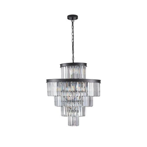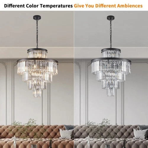 Description 23.6 Inches Black Luxury Crystal Chandelier:Composed of premium K9 crystals and black finish metal base, clear crystal prisms on large round iron chrome finished frames. Total of 5-tier sparkling crystals. Luxurious and contemporary design, perfect for home decor which will make your house look stunning. Size : Width 23.6" x Height 27.6" .Please ensure dimensions of this crystal chandelier light fixture is fit for your prepared space or not. Bulb Requirement:This crystal pendant light need 15 x E12 bulbs (Max 60-watt, This product does not contain a light source) .Ideal Indoor Decoration: This Modern luxury style chandelier is perfect for wide application, kitchen island, living room, dining room, enterway, hallway, foyer, corridor, stairway, bars, cafes, hotels, and restaurants, etc. Features Shine Bright Like a Diamond:selected the TOP K9 crystal and the highest standards in the industry have been adopted from the manufacturing stage. Modern Crystal Chandelier with finished is a beautiful piece. With its sophisticated beauty and stunning details will fits your every space. E12 Bulb*15 Required Chandeliers: compatible with E12 LED bulb, Incandescent, energy-saving, halogen, etc. The brightness depends on the bulb you put in, if you want brighter light, please use high-watt E12 bulb(60w max),The chandelier it’s compatible with dimmable bulbs and wall switch. Chandelier Light Fixture Size: Crystal chandeliers with 23.6 inches wide and 27.6 inches high. Please check the size of the chandelier lighting fixture before purchasing. Simple Assemble: Crystals come in 1 sizes, each crystal strand needs to be hanged one by one. When the chandelier lights up for a moment, everything is worthwhile all the effort will be transformed into your smile. Suggested Space Fit: Securely wrapped crystal high ceiling light fixture. light up your Living Room, Dining Room, Porch, Staircase, Foyer, Hallway, add some elegance to your home with this crystal chandelier ceiling light.