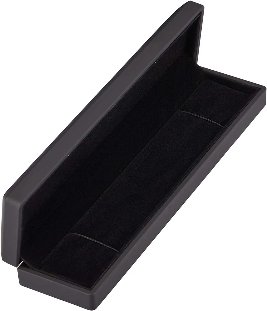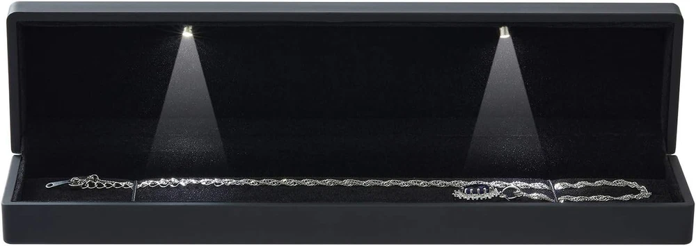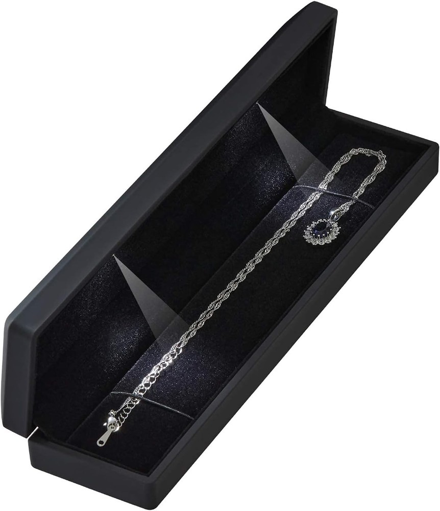 Long Chain Necklace Jewelry Gift Box Case with LED Light, Elegant Black Product Details Color: Black Brand: LETURE Material: metal, aluminium, aluminium Rubber Style: Modern Special Feature: Lighting Recommended Uses For Product: Ring Product Dimensions: 2.2"D x 1.4"W x 9"H Target Audience: Women Shape: Rectangular Occasion: Wedding, Engagement, Proposal, Birthday and Anniversary Mounting Type: Table Top Finish Type: Polished Inner Material: Flannel Number of Drawers: 1 Item Weight: 0.29 Pounds Number of Compartments: 1 Jewelry Storage Type: Jewelry Box Number of Items: 1 Manufacturer: LETURE Item Weight: 4.7 ounces Country of Origin: China Item model number: Necklace Box Batteries: 1 Lithium Metal batteries required. Finish types: Polished Number of pieces: 1 Batteries required: Yes Included Components: Jewelry body holder PREMIUM MATERIAL - The Pendant/Necklace box is made of high-quality rubber baking varnish process, smooth, textured, wear-resistant, dirt-resistant, waterproof. It's Safe, Non-toxic. Built-in soft flannel material can better protect jewelry from damage SIZE - 9*2.2*1.4inch/23*5.5*3.5cm,light and convenient, perfect necklace box, also you can use it as small jewelry storage box for ring, pendant, earings, brooch or pin, even coins, or anything sparkle to display DOUBLE LED LIGHT - There are two LED lights inside the necklace box, which allows you to open the necklace box and automatically light up. The effect is amazing. The soft light shines on your jewelry, making your jewelry more beautiful and shining, perfect display of your jewelry GREAT GIFT - It will help you create a romantic atmosphere with the LED Light. A great gift for your mother, girlfriend , wife, daughter, colleague, friend or any other special woman in your life Ideal gift for proposal, engagement, wedding, and anniversary, birthdays, Valentine’s Day, Christmas gift or any other happy occasion, also perfect for ring earring daily storage Feature: Size 9*2.2*1.4inch/23*5.5*3.5cm Style: classic design with LED light Practical: perfect for pendant and necklace occasions like Engagement, Weddings, Birthday, and Anniversary... etc. Package include: 1 x led necklace box (Jewelry Not Included)