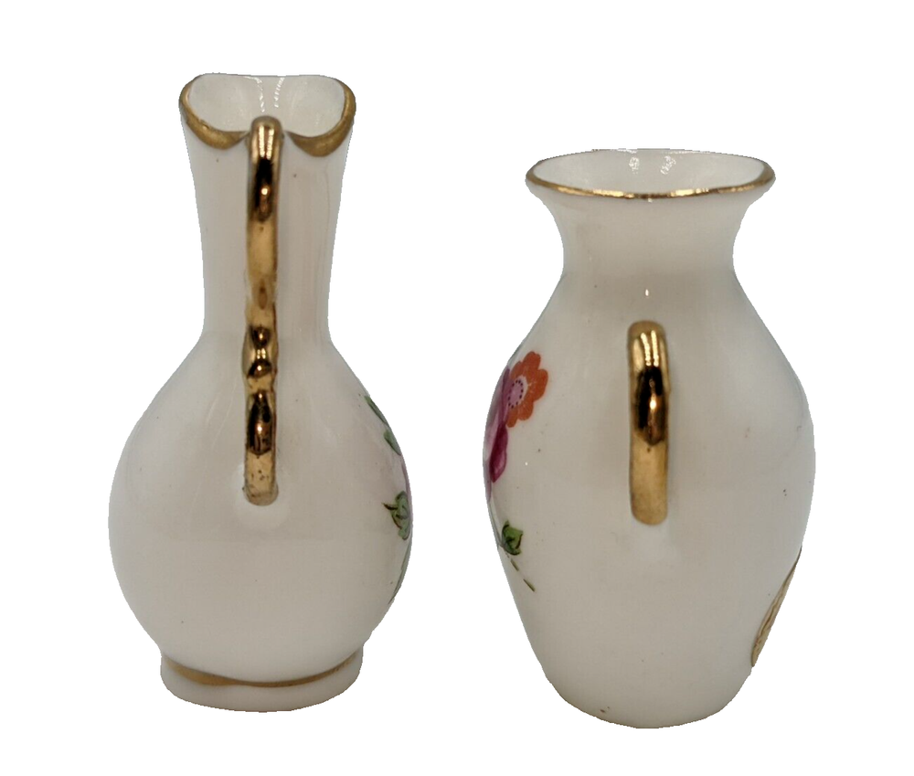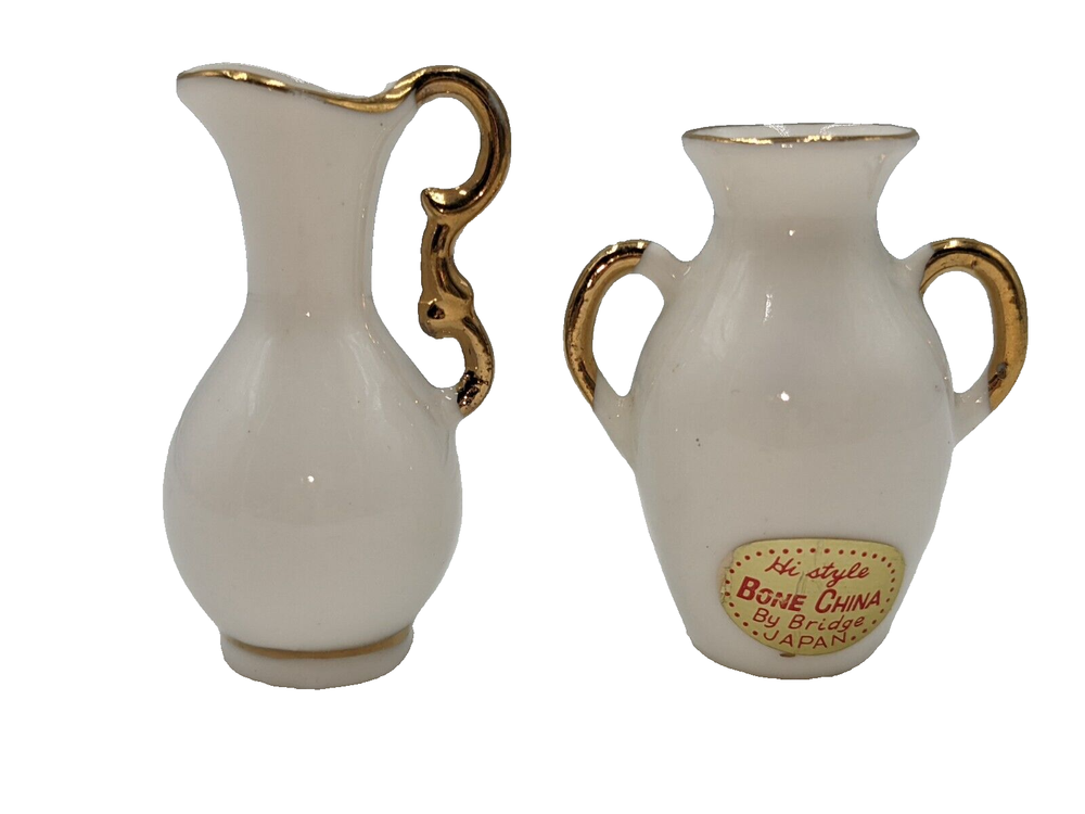 Dollhouse Miniatures Bone China Vase & Pitcher Hi Style By Bridge Japan 1.5". Excellent used condition - no damage at all. Please see the photos. These tiny white vases are decorated with pink and red roses and gold trim. All of my items are carefully packed for shipping, no matter their value - $5 items are wrapped with the same care as a $200 item. My goal is to have your purchase arrive safely. Large, heavy and fragile items are harder to use combined shipping with but just ask if you would like to purchase more than one item and I am more than happy to do so if feasible. Measurements are approximate or as close as I can get. Also, the color you see many not be the exact color depending on your computer or phone settings. Unpaid items will result in the buyer being blocked from further purchases. Please remit payment right away so we can get your item shipped out quickly.