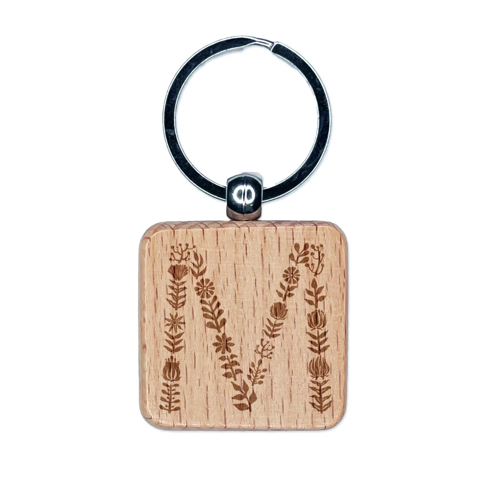 Elegant Botanical Floral Letter M Engraved Wood Square Keychain Tag Charm