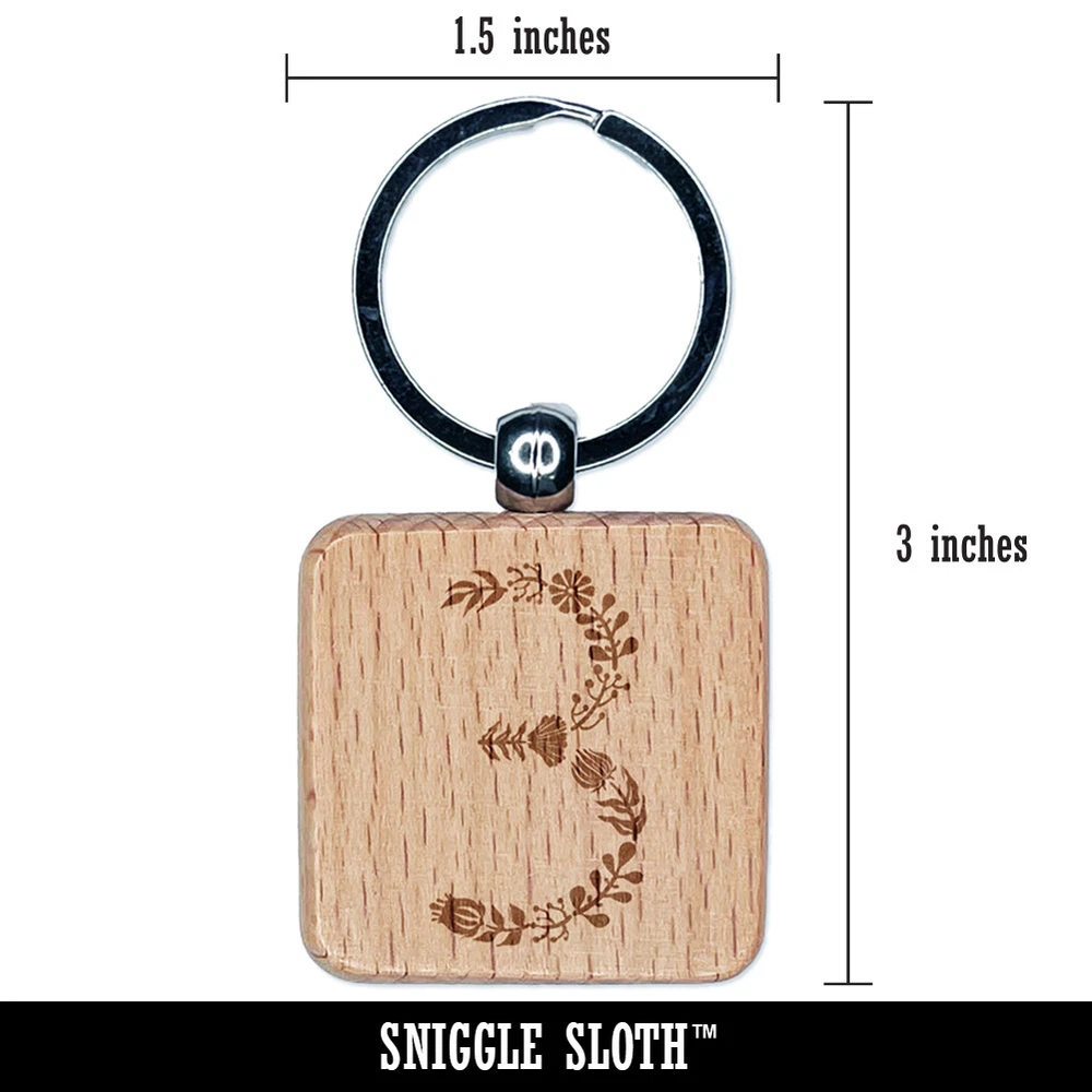 Elegant Botanical Floral Number 3 Engraved Wood Square Keychain Tag Charm