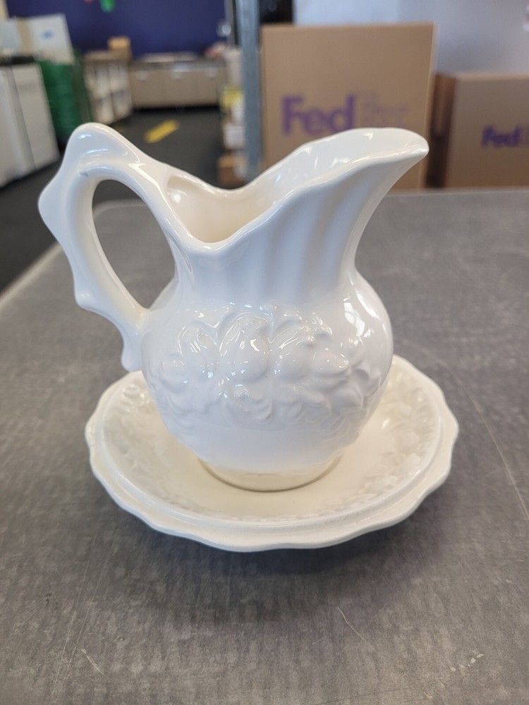 This medium-sized ceramic water wash basin and bowl set features a tray. The basin and bowl are white in color, making them a decorative addition to any home. The set can be used for displaying collectibles and not meant for washing. No chips or cracks!! Professionally packaged at the local FedEx office.