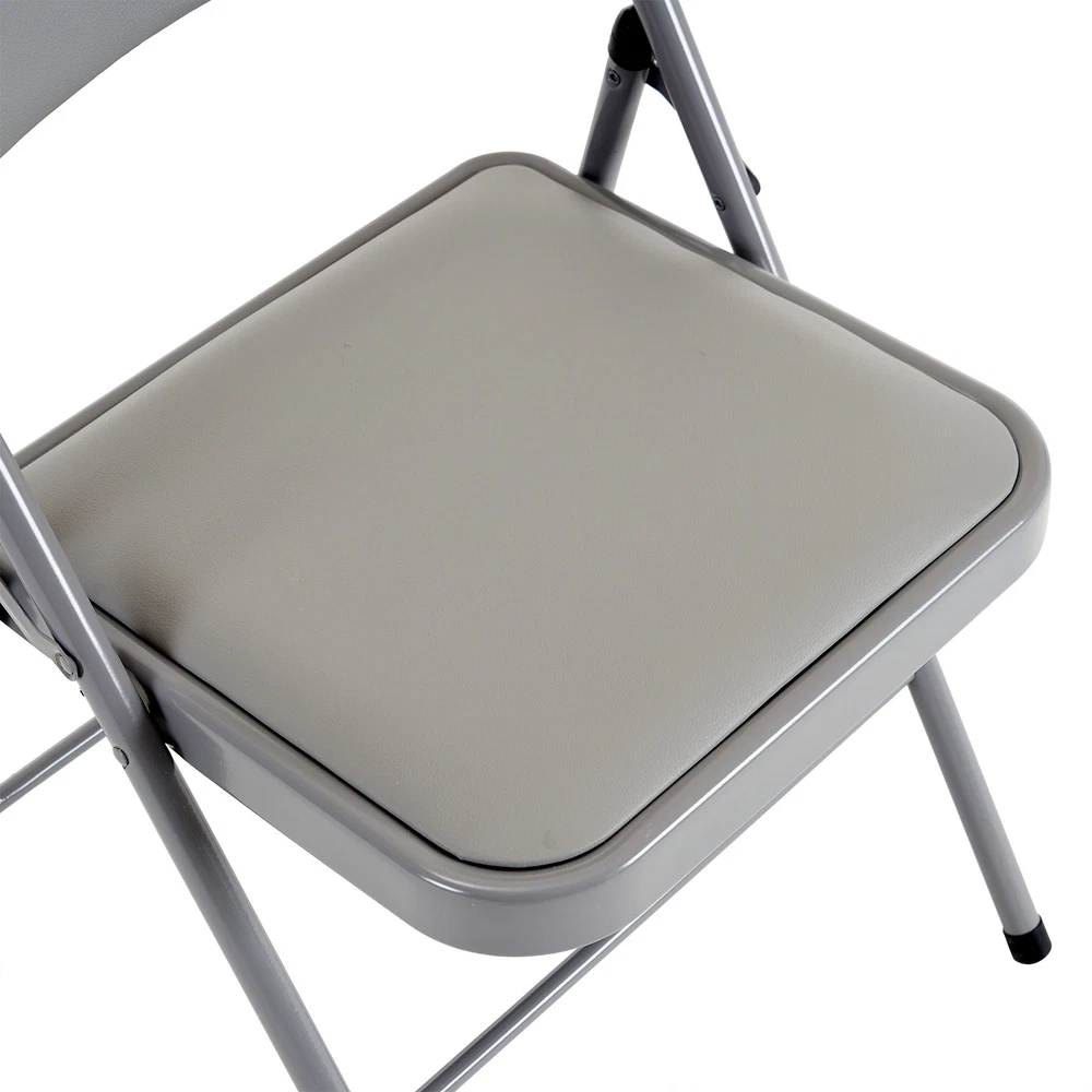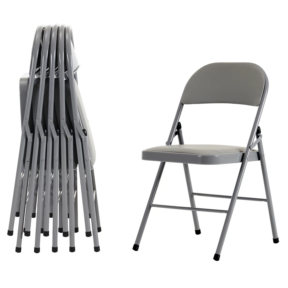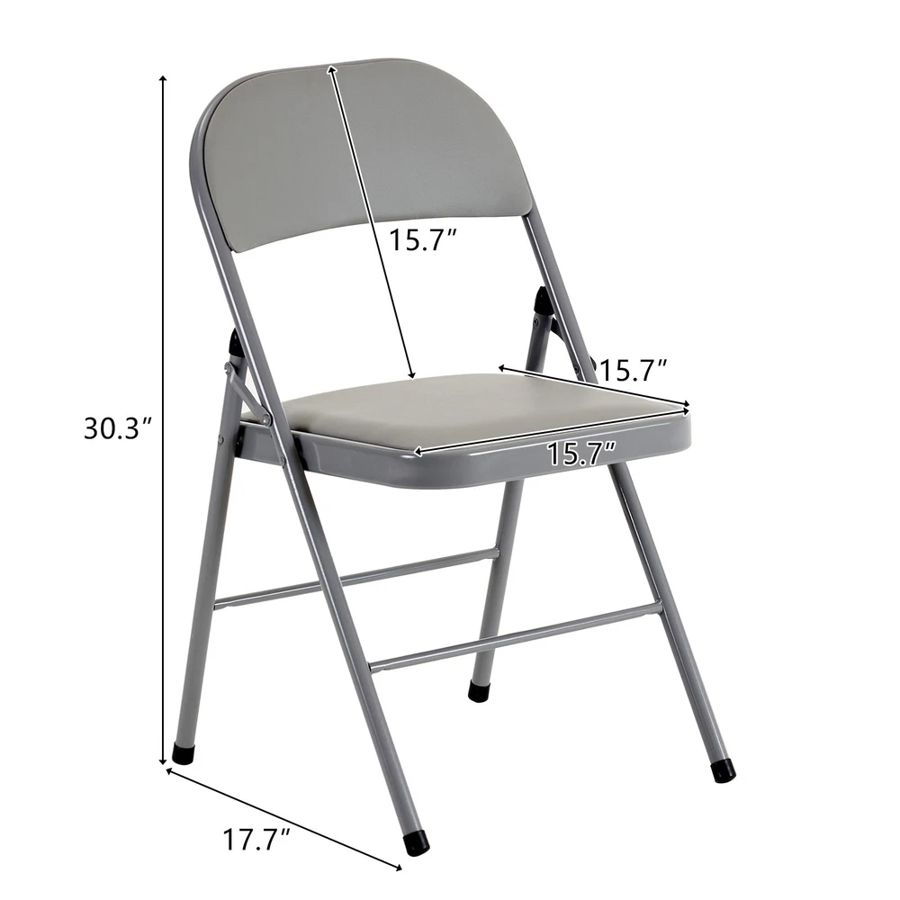 Introductions: This simple style chair combined steel and PVC is suitable for dining room, living room, reception room, exhibition and other places. Sponge filled cushions and backrest give you a more comfortable experience. Sturdy steel frame, two cross - supporting structure can improve the stability of the chair, which makes the chair durable. Steel folding chairs are essential for entertaining guests at large games, parties or events. And they are the best choice when you need additional seats. After use, folding chairs are folded and compact for easy folding and storage. The chairs have smooth surfaces, which is easy to clean. The plastic tube sleeves on chair legs can effectively your floor and prevent scratching. Features: 1. Sturdy and durable steel frame with weight capacity of 150KG 2. Comfortable and soft PVC cushion and backrest, filled with sponge 3. Chairs are easy to carry, foldable and compact, convenient for transportation and storage 4. Plastic tube sleeves can your floor and prevent it from scratching 5. If you have any questions or worries about your order, please keep in with us and we will provide you with timely and satisfactory solutions Specifications: 1. Color: Gray 2. Dimensions:(15.75 x 17.72 x 30.71)”/ (40 x 45 x 78)cm(L x W x H) 3. Seat Dimensions: (15.75 x 15.75)" / (40 x 40)cm (L x W) 4. Backrest Dimensions: (17.32 x 7.09)" / (44 x 18)cm (L x W) 5. Material: Iron Tube & PVC 6. Weight Capacity: 330lbs / 150kg 7. Each Chair Weight: 8.38lbs / 3.8kg Package Includes: 6 x Foldable Chairs