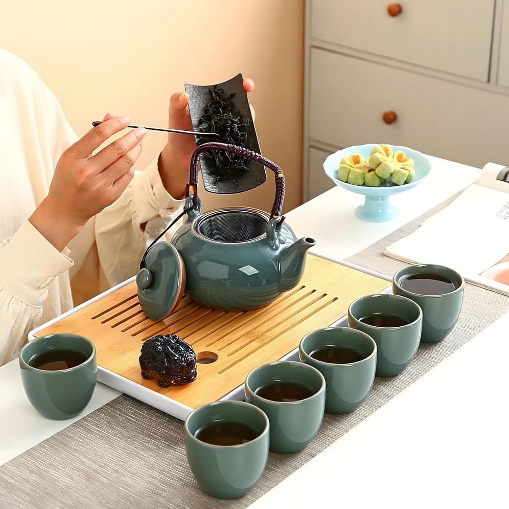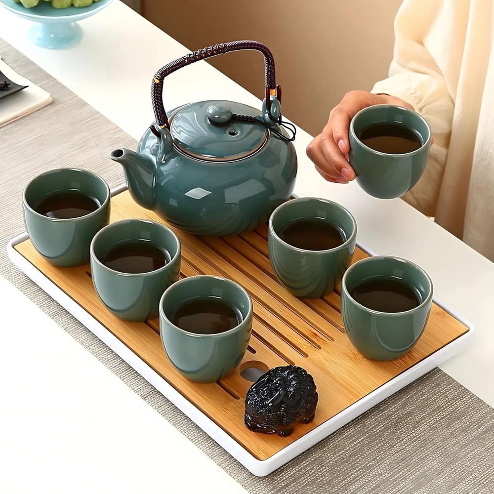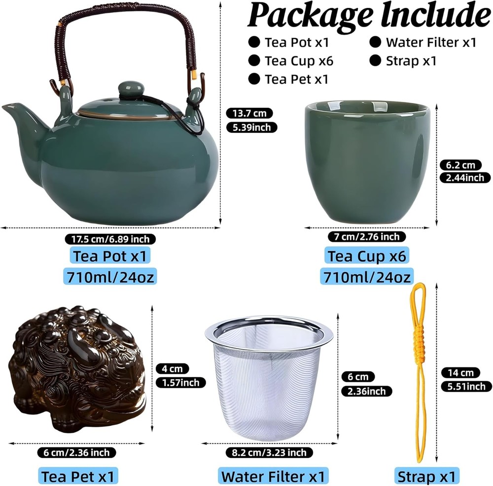 【8-Piece Porcelain Asian Tea Set】The Japanese tea set includes 1 teapot (24oz/710ml), 6 tea cups (4oz/130ml), and 1 tea pet. The tea set is made of kiln-altered glaze porcelain, durable and high quality. It is cadmium-free and lead-free 【Mysterious & Unique, Just Like You】The tea set displays a special pattern, retro and elegant. As the colors blend within the kiln, the glow around the spots reveals subtle differences between each other, irreplaceable and unique. When you serve your guests, friends, or family with this special tea set, you will hear non-stop compliments on your taste. You will not only be drinking fragrant tea, but also savoring an unforgettable visual treat 【Exquisite in Every Detail】The porcelain surface is quite smooth. The handle of the teapot is hand-woven with traditional rope, adding a quaint and simple feel. It is also heat-proof, making it easy and comfortable for you to hold. A yellow cord helps to bind the lid to the handle of the pot. You don't need to worry about the lid slipping off when pouring tea. The rounded spout helps the tea flow smoothly 【Color-Changing Pixiu Tea Pet】Crafted with temperature-sensitive polymer resin, this Pixiu-shaped tea pet dynamically shifts hues when exposed to hot water (45°C+ threshold). Higher temperatures intensify its vibrant colors, which linger until cooled below 45°C. Its durable texture ensures scratch resistance, while the intricate design adds whimsy to tea rituals 【Great Gift for Tea Lovers】This one-of-a-kind Japanese tea set brings both visual and taste pleasure, full of collection value. It can be an eye-catching decoration for your living room, kitchen, or study. You can also give it as a gift to your friends and beloved ones on Valentine's Day, Father's Day, Mother's Day, or birthdays. When she/he receives this tea set, a smile will appear on their face