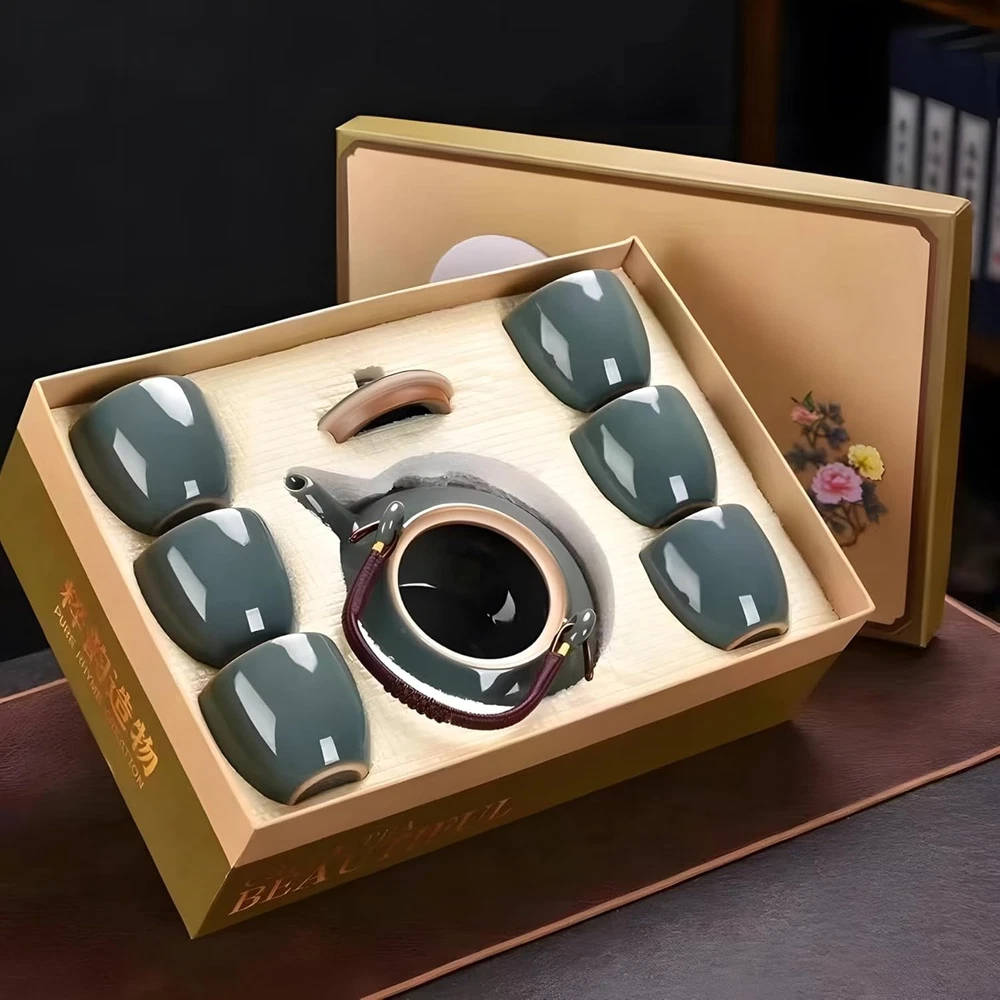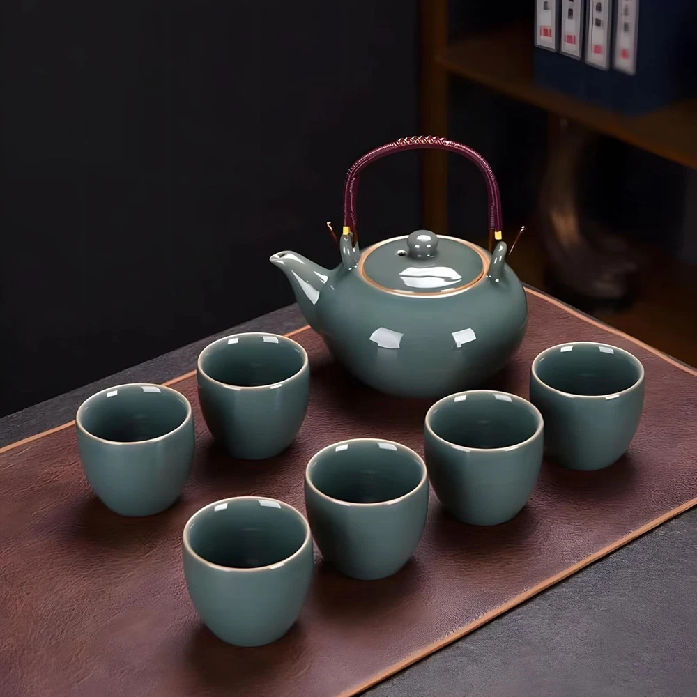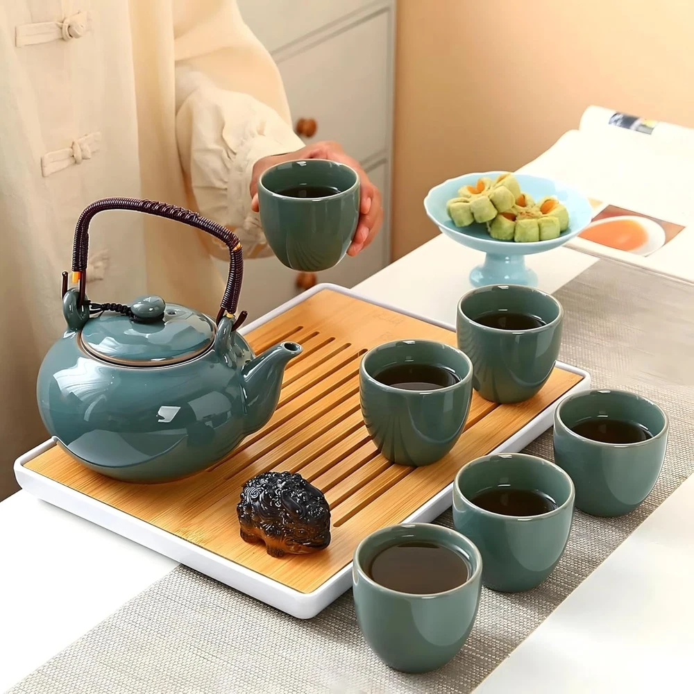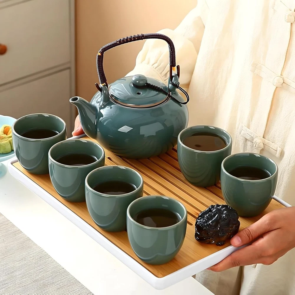 【8-Piece Porcelain Asian Tea Set】The Japanese tea set includes 1 teapot (24oz/710ml), 6 tea cups (4oz/130ml), and 1 tea pet. The tea set is made of kiln-altered glaze porcelain, durable and high quality. It is cadmium-free and lead-free 【Mysterious & Unique, Just Like You】The tea set displays a special pattern, retro and elegant. As the colors blend within the kiln, the glow around the spots reveals subtle differences between each other, irreplaceable and unique. When you serve your guests, friends, or family with this special tea set, you will hear non-stop compliments on your taste. You will not only be drinking fragrant tea, but also savoring an unforgettable visual treat 【Exquisite in Every Detail】The porcelain surface is quite smooth. The handle of the teapot is hand-woven with traditional rope, adding a quaint and simple feel. It is also heat-proof, making it easy and comfortable for you to hold. A yellow cord helps to bind the lid to the handle of the pot. You don't need to worry about the lid slipping off when pouring tea. The rounded spout helps the tea flow smoothly 【Color-Changing Pixiu Tea Pet】Crafted with temperature-sensitive polymer resin, this Pixiu-shaped tea pet dynamically shifts hues when exposed to hot water (45°C+ threshold). Higher temperatures intensify its vibrant colors, which linger until cooled below 45°C. Its durable texture ensures scratch resistance, while the intricate design adds whimsy to tea rituals 【Great Gift for Tea Lovers】This one-of-a-kind Japanese tea set brings both visual and taste pleasure, full of collection value. It can be an eye-catching decoration for your living room, kitchen, or study. You can also give it as a gift to your friends and beloved ones on Valentine's Day, Father's Day, Mother's Day, or birthdays. When she/he receives this tea set, a smile will appear on their face