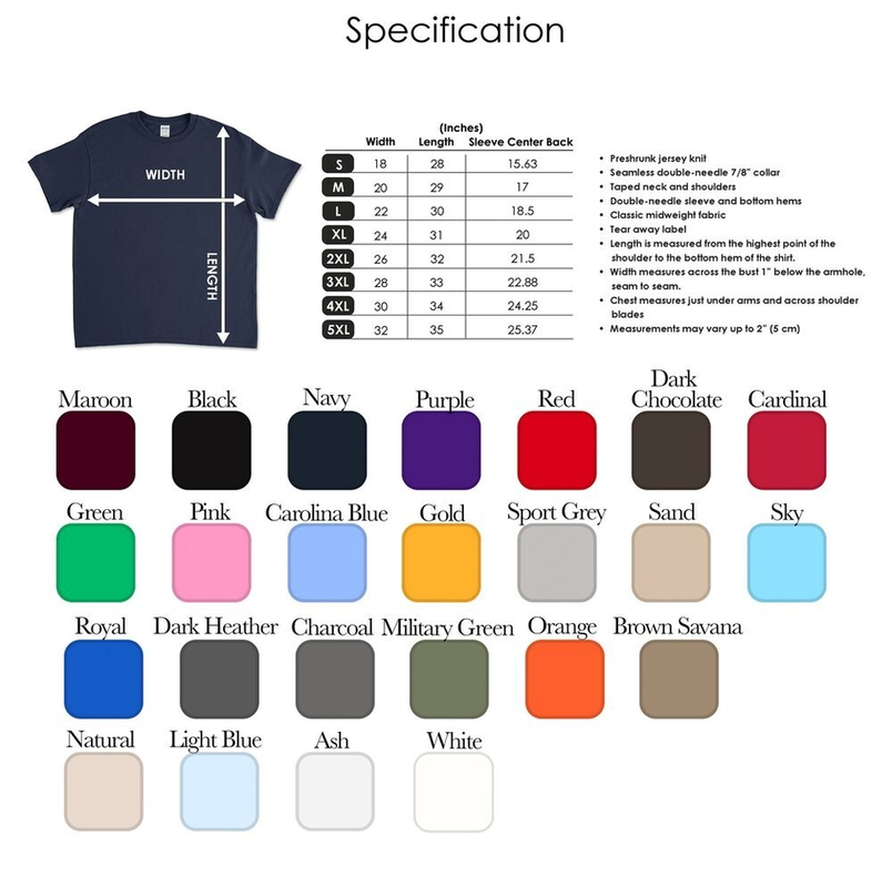 π PRODUCT DESCRIPTION & PROMOTION POLICY π π― IMPORTANT NOTES: If you encounter any problems such as receiving the wrong product, defective product or not receiving the product, please contact us immediately before opening a dispute. We are committed to handling it quickly and providing you with the best support! Please check your order information, shipping address and size carefully to ensure the order is correct. Want to print more on the back of the shirt? Don't hesitate to message us for advice and custom design according to your wishes! You can choose your favorite shirt color to personalize the product, creating your own mark. Actual color may be slightly different due to light and screen, please understand! Size may be slightly different (1-2cm) due to manual measurement. π₯ PREMIUM QUALITY β GILDAN 5000 UNISEX SHIRT π₯ 100% soft, durable cotton (light polyester blend depending on colour). Unisex design to suit all styles, all genders. Available in sizes S to 5XL β choose the right size for comfort and confidence! EASY CARE INSTRUCTIONS Machine wash in warm water (below 40Β°C) to preserve the colour and shape of the shirt. Use non-chlorine bleach when necessary. Tumble dry on medium heat, do not iron or dry clean to keep the shirt looking like new. π FAST & RELIABLE SHIPPING π Fast delivery within 3-7 business days. Orders are processed within 4 business days from payment. We ship nationwide. Updated tracking code for easy tracking. Please double check your shipping address to avoid unnecessary confusion. π― FLEXIBLE RETURN AND REFUND POLICY π― 100% refund within 30 days if the product is defective or not as described. Free returns if the product is defective from our side. Note: We do not accept returns in case of wrong size selection or personal reasons. π YOUR FEEDBACK IS OUR MOTIVATION π Please take a few seconds to leave a positive review if you are satisfied - we are very grateful and will respond to you with better service! Having problems? Do not hesitate to contact us directly so we can assist you as soon as possible! Thank you for trusting and choosing our products! Wish you a great shopping experience! π