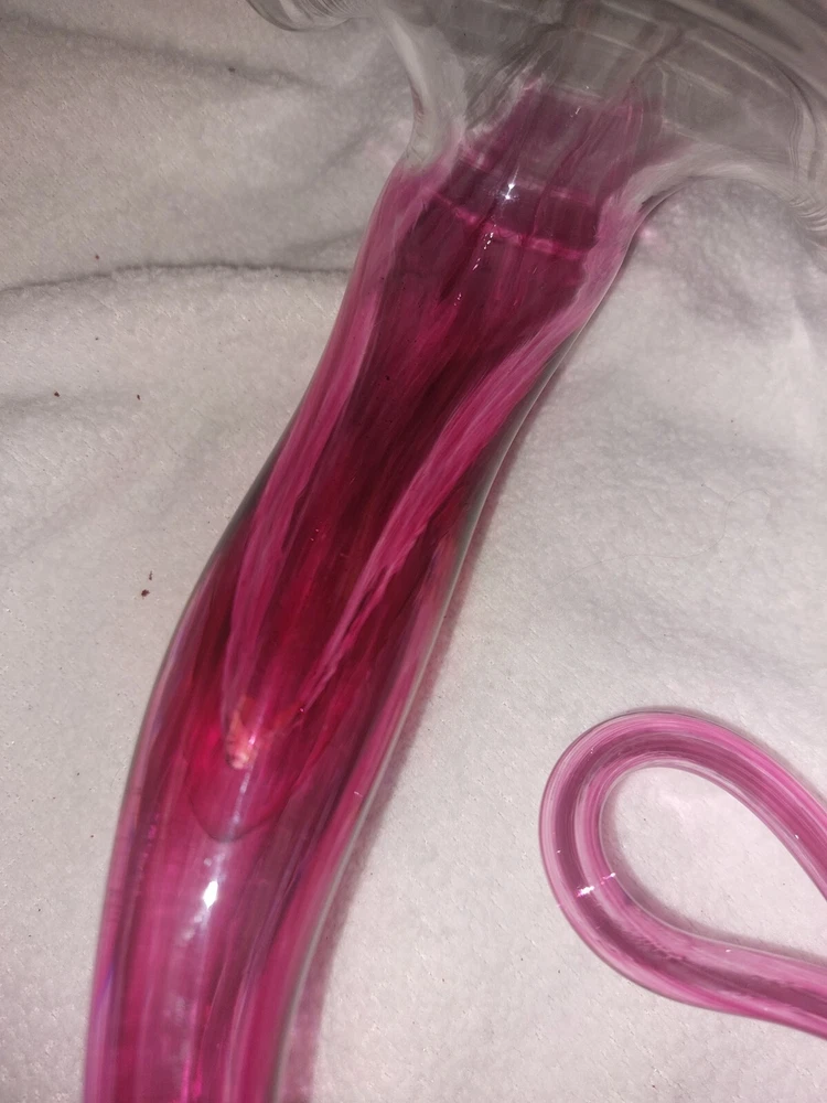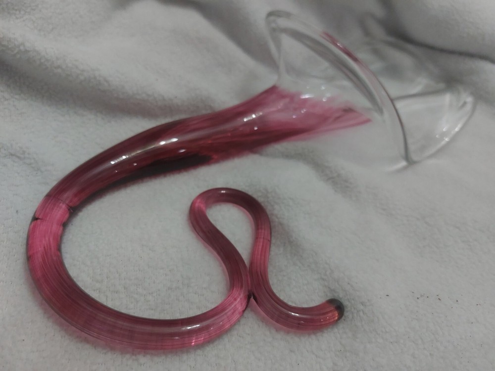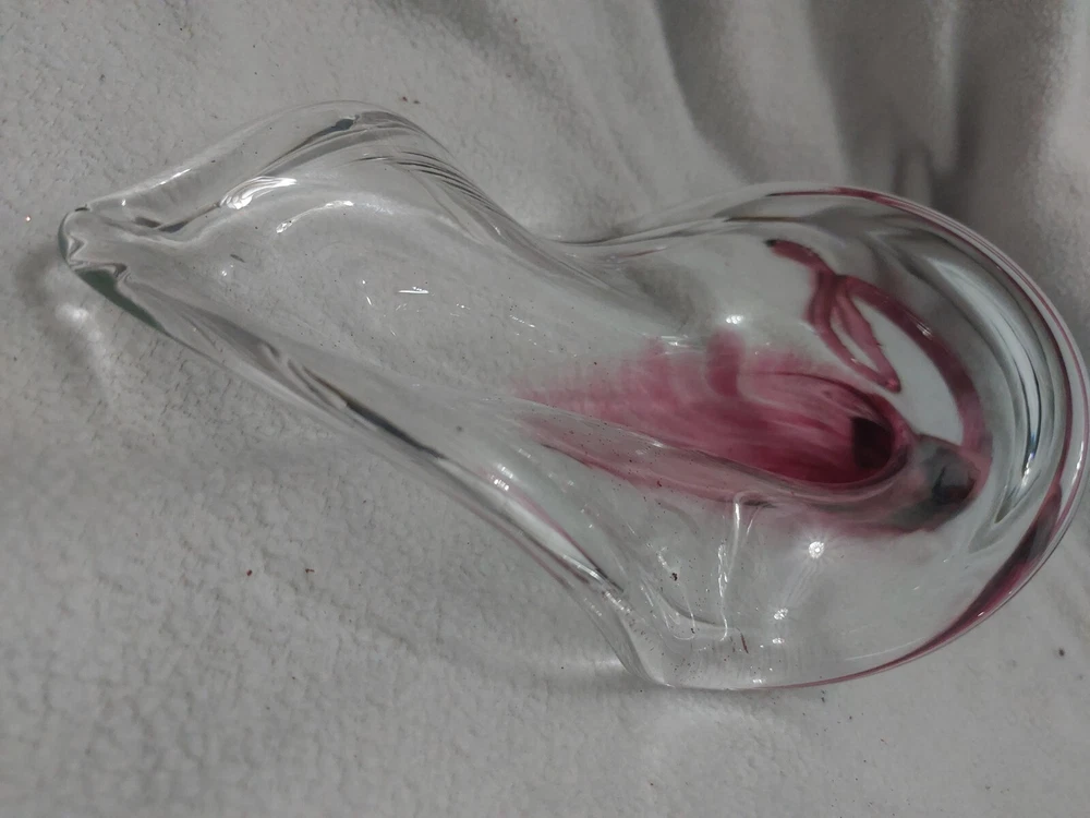 This beautiful vase is a one-of-a-kind piece from Bavin Glassworks. The unique design features a stretched lily shape, handmade with pink and clear glass using the hand blown glassmaking technique. The vase was produced in 2002 and is signed by the artist. Its impressive size of approximately 16 inches at its longest, and about 6 inches wide really catches the eye. There is a small water reservoir for water/flowers. The lily subject is perfect for collectors who appreciate decorative items, and the vase is a great addition to any collection. This piece is perfect for display in any room of your home and will be a conversation starter for sure. Don't miss out on the opportunity to own this stunning handmade glass vase from Bavin Glassworks. No chips or cracks. Experienced glass shipper. Thank you for looking!