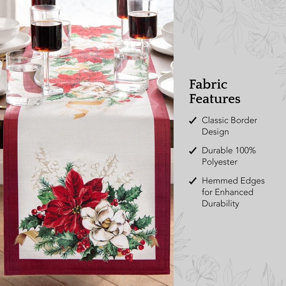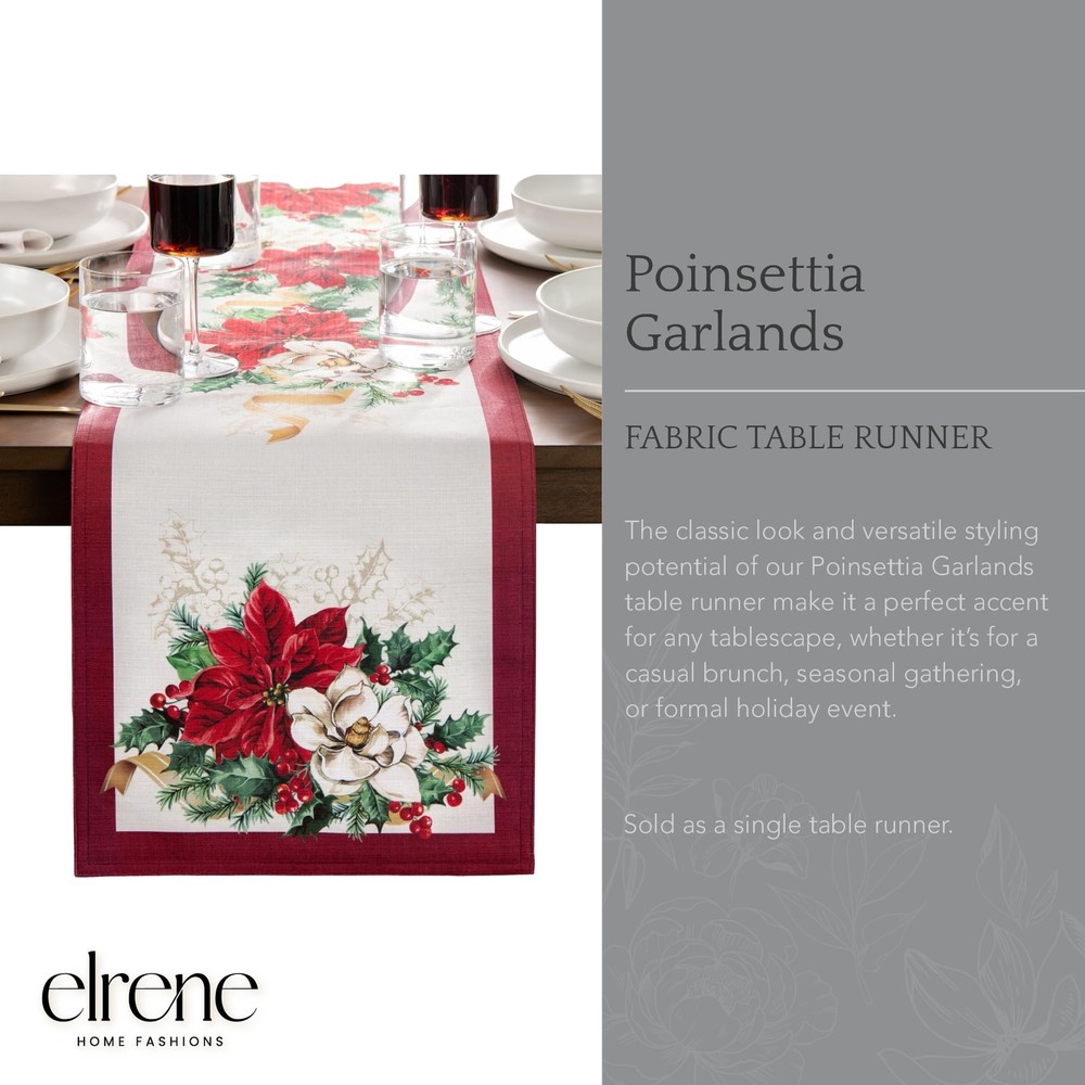 Dress your table in holiday elegance with the Poinsettia Garlands Table Runner. Inspired by traditional winter-holiday decor, this charming fabric table, mantle, or console runner is decorated with deep red and cream colored poinsettia flowers, along with other seasonal blooms, green holly and berries, and gold ribbon accents. On soft ivory ground, this versatile runner also features a classic garnet red bordered design for a festive touch. Excellent for special occasions, events, christmas parties, family gatherings and everyday use during the winter months and holiday season. Soft and durable fabric can be ironed to release stubborn creases and keep your table runner free. Hemmed edges add a finished look and prevent wear and tear. Runner measures 13”x70” and is sold individually. 100% Polyester. Easy care, machine washable. Coordinate to Poinsettia Garlands tablecloth, napkins, and placemats to complete the look. POINSETTIA DESIGN: The Poinsettia Garlands Table Runner is decorated with ruby red and cream poinsettias, seasonal blooms, green holly bunches, and gold ribbon accents over an off-white, ivory ground making it the perfect addition to your holiday decor. PREMIUM QUALITY & DURABILITY: Crafted from high-quality polyester, this reusable table runner is built to withstand frequent use, ensuring it will last through many holiday seasons. VERSATILE USE: Perfect for holidays, parties, events, and everyday use, this table runner is designed to coordinate beautifully with a wide range of dinnerware collections. For a complete look, pair with our matching placemats, napkins and tablecloth. FREE & EASY CARE: Soft and durable polyester fabric is machine washable and can be ironed to release stubborn creases and keep your table runner free. FOUR GENERATIONS OF QUALITY & FASHION: Home Fashions has been designing and producing high-quality home decor since 1922. Committed to quality and design, we specialize in creating products that seamlessly blend functionality with elegance.