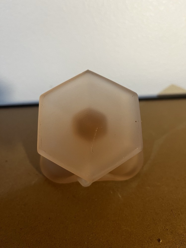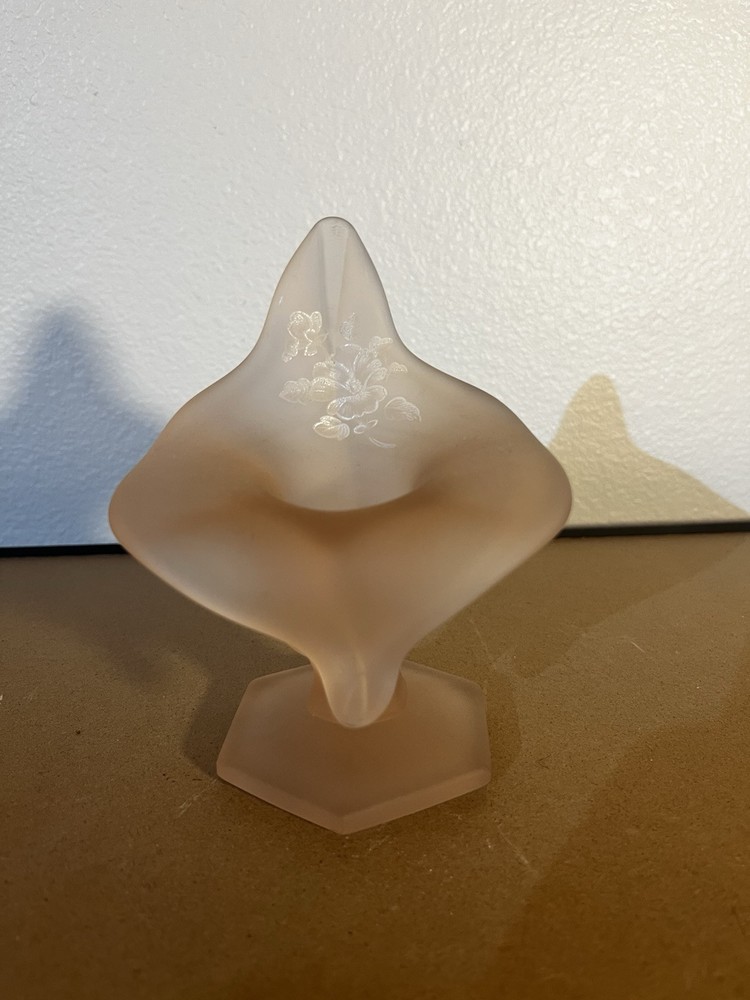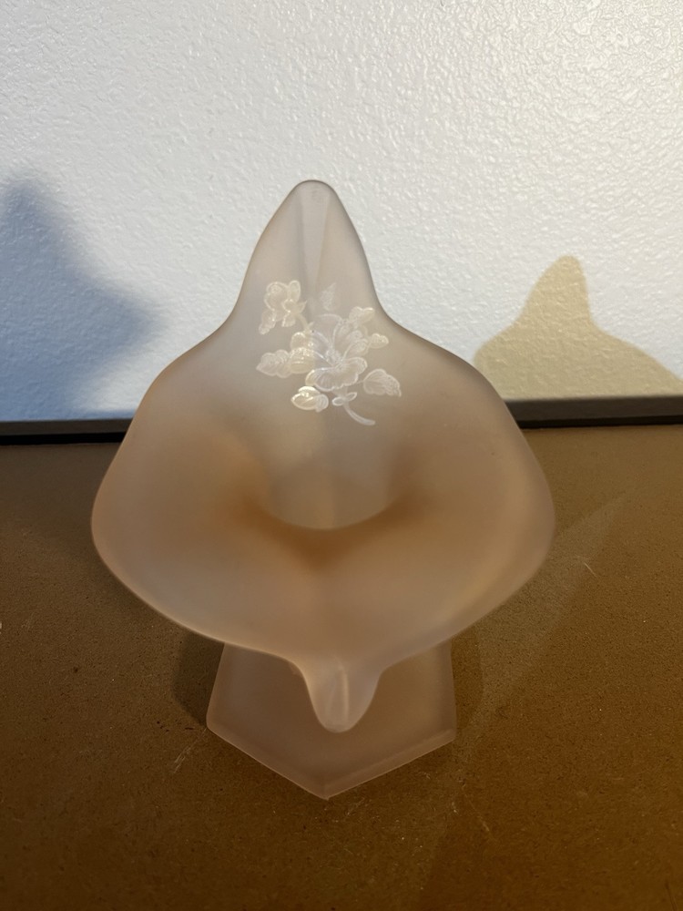 This is a vintage Westmoreland Art Deco vase originating from America. It features a pink frosted glass Jack in Pulpit design with a rose motif. The vase is 5 1/4 inches tall and hand-blown, showcasing intricate floral details. This elegant piece reflects a miniature theme and was produced in the 1970s, showcasing the exquisite artistry of Westmoreland's art glass production.