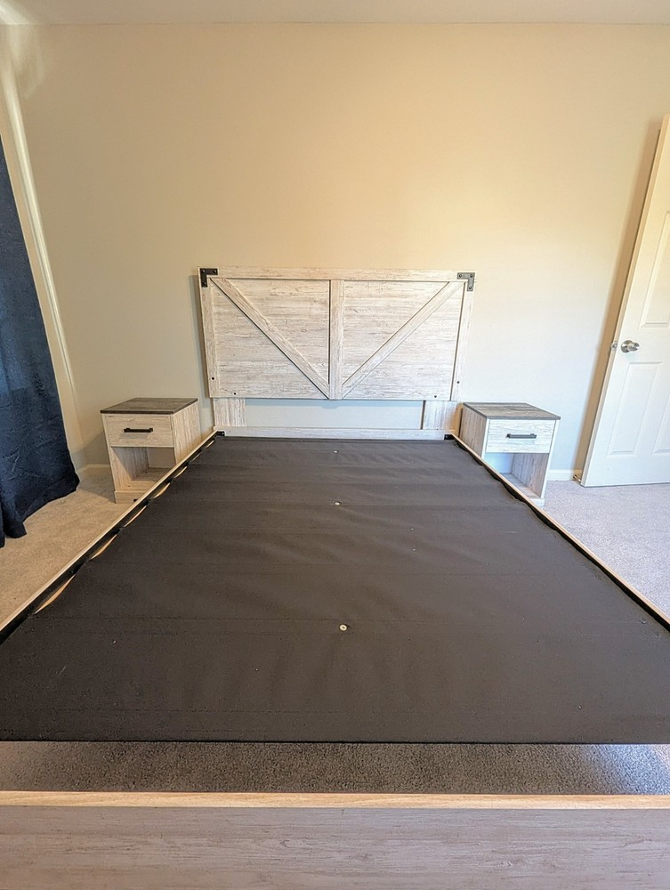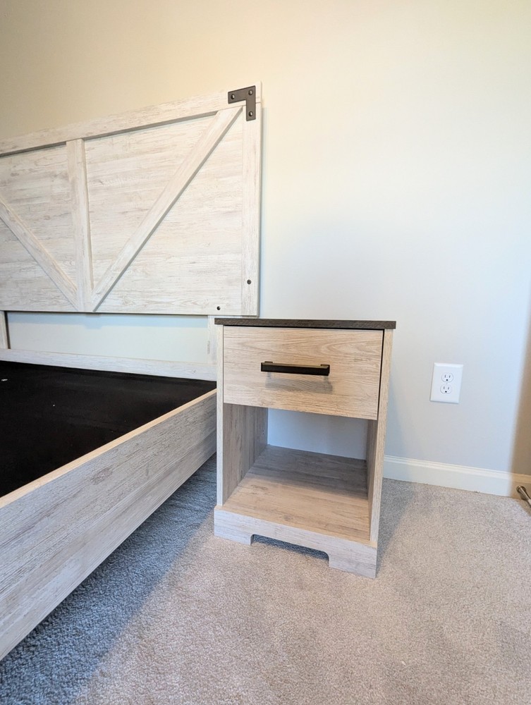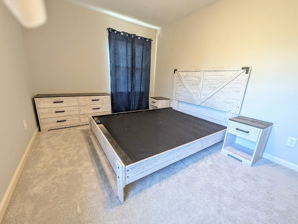 White wash Bedroom Set- •Dresser: length 52 and 3/4in, height 26 and 1/4in, width 16in •Queen Size Bed: length 7ft, height 52 and 1/2in, width 63 and 1/2in •Nightstands: length 16in, height 22 1/4in, width 16in One nightstand has some mild scratches (shown in picture)