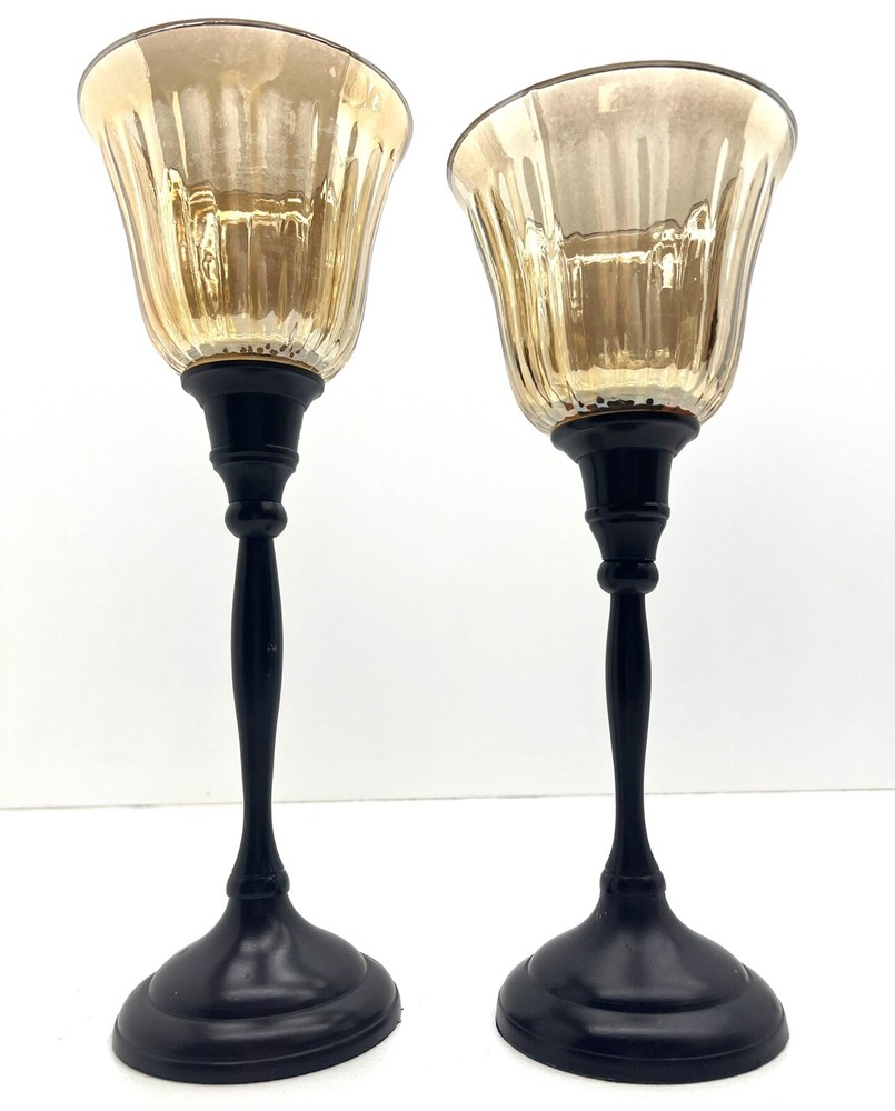 This is a set of two beautiful candle holders made of glass and metal. They are perfect for adding a touch of elegance to any home decor. The holders are designed to hold candles and can be used as decorative pieces for any room in the house. The combination of glass and metal provides a sturdy and durable structure for the candle holders.