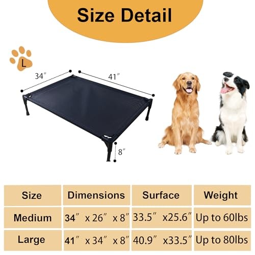 30 Days Return Policy Fast Delivery Trusted seller Cooling Elevated Dog Beds for Large Dogs, Portable Raised Large Dog Bed for Indoor & Outdoor Use, No-Slip Feet Pet Cots, Pet Hammock with Breathable Mesh, Black Product Description Elevated Dog Bed: The raised dog bed features breathable fabric increg airflow on all sides of the bed. And it helps pets stay cool in spring and summer months by allowing air to circulate and keeps pets off wet/cold ground with 8" ground clearance keeping your dog more comfortable, cleaner, dryer, and healthier compared to the ground. Strong & Durable: Our dog cot boasts a lightweight metal powder-coated frame, supporting dogs up to 200 lbs, perfect for large dog breeds. And heavy-duty teslin mesh holds up against scratching and chewing, providing excellent support and even pressure distribution to reduce joint and muscle pain. And the non-skid rubber feet provides strong stability and high load-bearing capacity, no fear of a sudden bed collapse. Indoor & Outdoor Use: The Travel dog bed is ideal for the home and abroad. Suitable for both indoor and outdoor use.Lifted pet bed with breathable mesh center is great for indoor and outdoor use. Slip resistant rubber feet provide protection for indoor flooring and water resistant mesh center repels moisture and odors.Weather resistant, the 8" raised breathable mesh cot works great indoors and outside. Keep your pup dry and comfortable in the backyard, on the patio or porch, next to the pool, or while camping. Easy Care: Dog hammock features a removable cover that is machine washable. Simply wash the mesh with tap water, a hose, or a damp towel. For deeper cleaning, use a mild soap or natural all surface cleaner and rinse thoroughly. Easy to Assemble: No screws and wrenches needed. The dog bed can be directly installed by using the plug-in, making this portable bed perfect for use during travel, camping, picnicking, place cot for dog training, etc. SIZE Detail: Large dog cot bed measures 41" X 34" X 8", perfect for large sized breeds like: Labrador Retriever, German Shepherd, Golden Retriever, Doodle, etc Shipping Returns Payment Shipping Shipping is FREE to all addresses other than APO/PO boxes in the lower 48 states. All our stock ships from US-based warehouses. Shipped via USPS or UPS (depending on location and package weight) Unless stated otherwise, all orders will ship within 24-72 hours of your payment being processed. Check our feedback to see the great reviews of FAST shipping we offer. Returns As our valued customer, we will do our best to make sure the product you receive arrives to you on time and as expected. If you are not satisfied with your purchase, please contact us within 30 days of receiving your order to process a return. Payment We currently accept payment via eBay managed payments only. Once payment is cleared, we will dispatch your shipment within 1-3 business days. Please refer to the "Shipping" tab for more information regarding shipping speed to your destination.