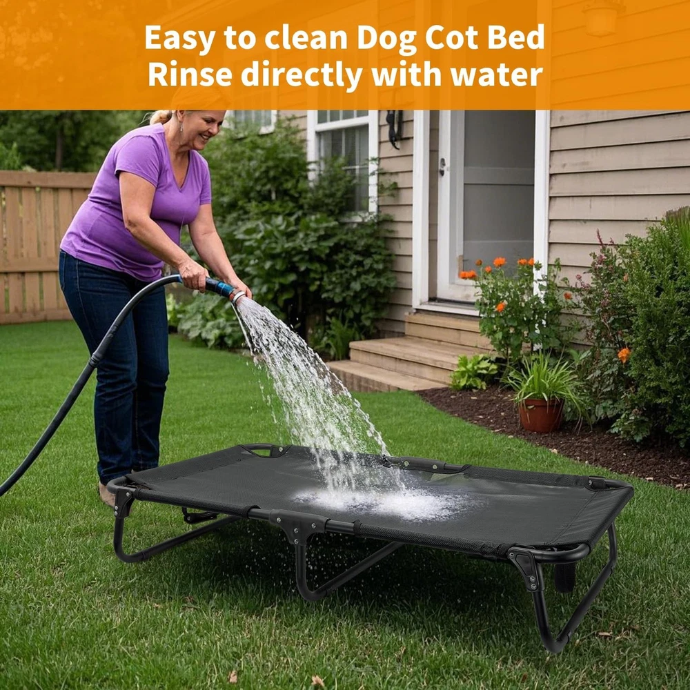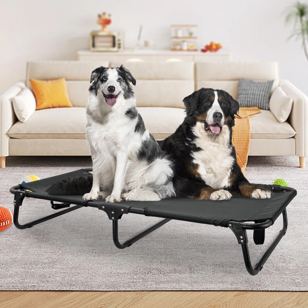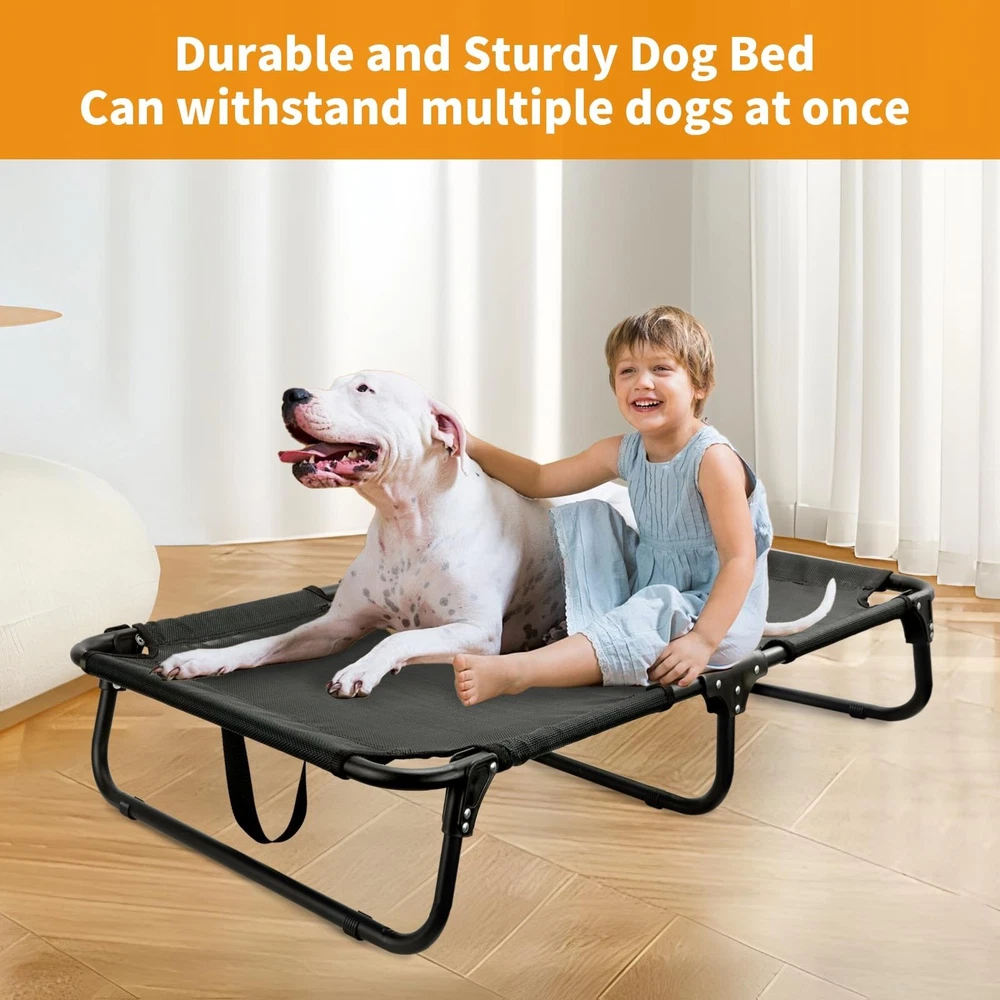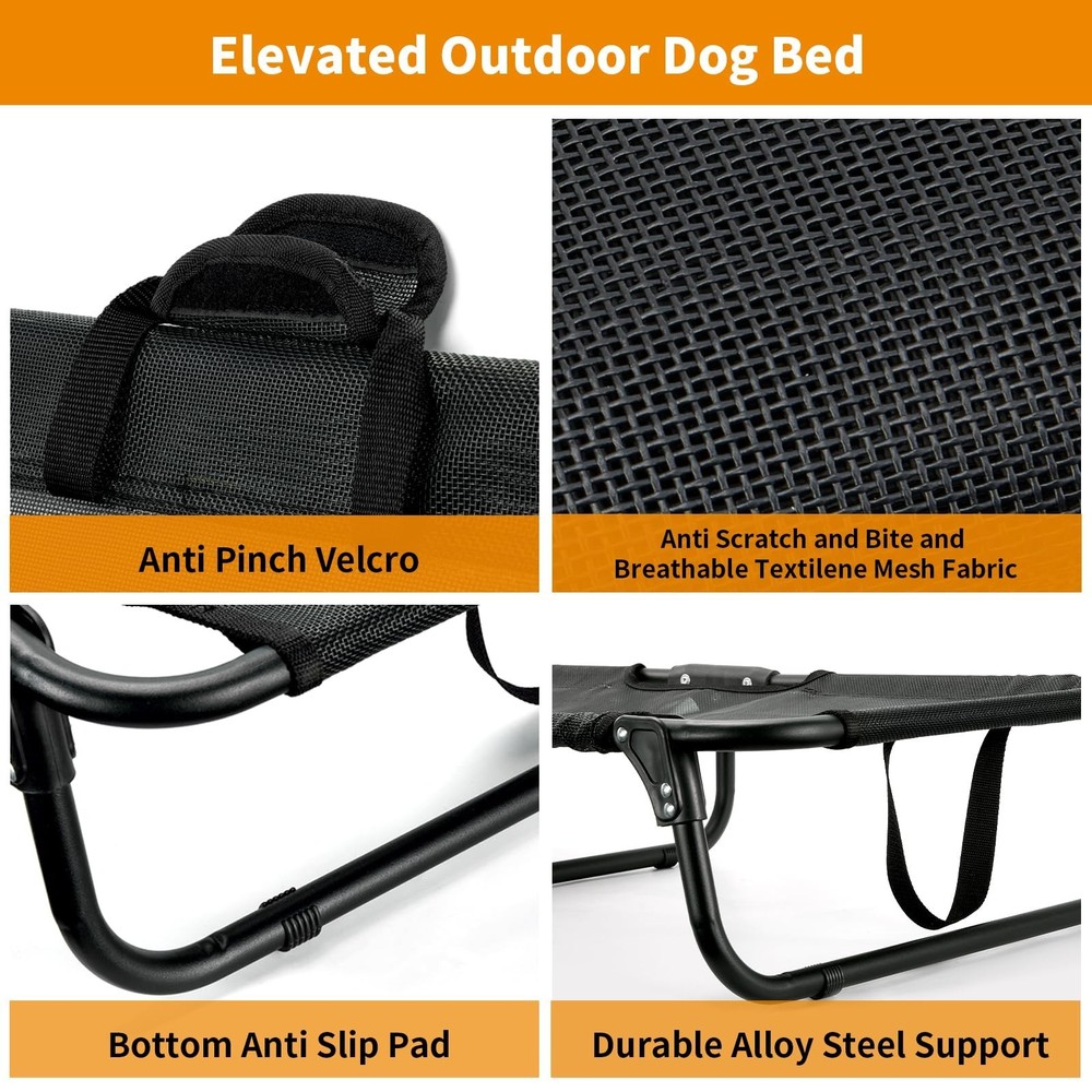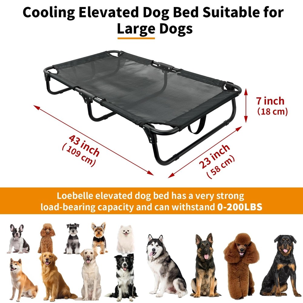 Elevated Raised Dog Bed for Large Sized Dogs Foldable Outdoor Cooling Dog Bed Cot with Breathable Mesh, Chew-Proof, No Assembly Need, Black Product Details Size: 43"L x 7"W x 23"H Brand: Loebelle MPN: Raised Dog Bed UPC: 637586992308 EAN: 0637586992308 Brand: Loebelle Breed Recommendation: All Breed Sizes Special Feature: Foldable Material: Alloy Steel Product Dimensions: 43"L x 7"W x 23"Th Product Dimensions : 43 x 7 x 23 inches; 6.06 Pounds Item model number : Raised Dog Bed Date First Available : November 29, 2024 Manufacturer : Loebelle Country of Origin : China Best Sellers Rank: #75,345 in Pet Supplies (See Top 100 in Pet Supplies) #1,001 in Dog Beds #1,001 in Dog Beds Customer Reviews: 4.5 4.5 out of 5 stars 41 ratings Item Weight: 6.06 pounds Manufacturer: Loebelle Country of Origin: China Item model number: Raised Dog Bed Date First Available: November 29, 2024 Item Package Dimensions L x W x H: 23.7 x 21.06 x 5.39 inches Item Dimensions LxWxH: 43 x 7 x 23 inches Item Weight: 6.1 Pounds Brand Name: Loebelle Target Audience Keyword: Dogs, dogs Directions: Directly deployed for use without the need for assembly Warranty Description: no Model Name: Elevated Dog Bed Color: Black Size: 43"L x 7"W x 23"H Material: Alloy Steel Number of Items: 1 Breed Recommendation: All Breed Sizes Included Components: Dog Bed,pillow Specific Uses for Product: Joints Large Dog Bed Dimensions: Loebelle large elevated dog bed measures 43 x 23 x 7 inch(109 x 58 x 18 cm), fits up to 0-200 lbs; The overall structure is very stable, weighing 5.55 lbs; Elevated dog bed adopting an 8-inch elevated design right for dogs of all ages to increase air circulation, creates low-impact areas to pressure points and joints Stable and Sturdy: Made of mesh fabric with heat resistance, durability, and breathability, relieve joint pain in pets and keep them cool during hot summers and prevent scratching and chewing; Adopting three sided support increases the stability of the structure, can accommodate multiple dogs at once No assembly: Raised dog bed has no assembly required, easy to fold, can be packed and taken away at any time, perfect for travel and camping, providing a safe and comfortable resting space for pets; Bottom anti slip pad can protect the floor and increase structural stability User and Pet friendly: Cooling Elevated Dog Bed is very lightweight, only 4 inches high when folded; The middle Velcro makes the folding structure more stable, and the Velcro at the handle can prevent pinching Easy to Clean: After rinsing with water, wipe with a cloth and let dog cot bed dry naturally