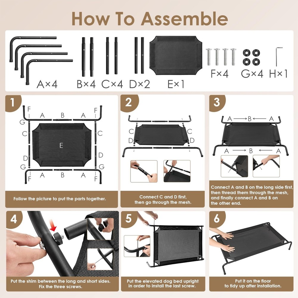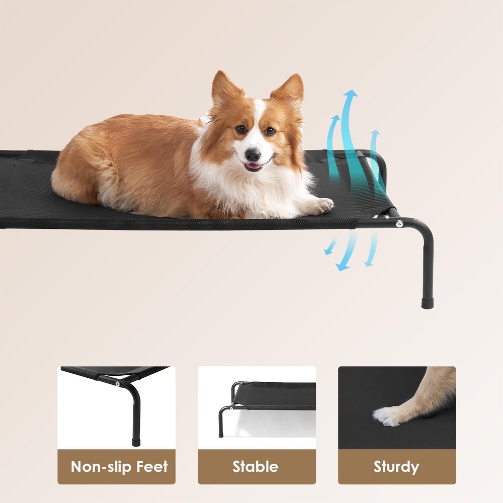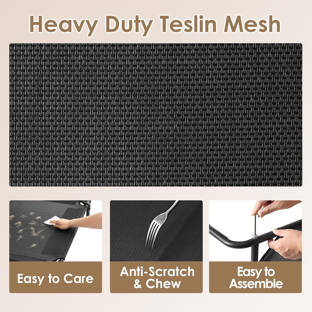 This elevated dog bed lifts your pet off the ground, providing a comfortable and supportive resting space all year round. It ensures good air circulation, keeping your pet cool and comfortable even in hot summers. Designed as a hammock for dogs, it is made of durable Teslin mesh and has a safe height, allowing your pet to rest peacefully and reducing pressure on their joints for optimal relaxation. Whether indoors or outdoors, this elevated dog bed is easy to assemble and disassemble, lightweight, and portable. Cleaning this elevated dog bed is very simple, just rinse with water and let it air dry. The non-slip feet also protect your pet from injuries while jumping or scratching. Breathable & Comfort: The elevated design of this dog bed enhances airflow, ensuring year-round comfort and keeping your pet cool even on hot days. The height is perfect for dogs of all ages. Strong Support & Durable: The heavy-duty Teslin mesh resists scratching and chewing, providing excellent support and even pressure distribution to help reduce joint and muscle pain. The lightweight metal frame, tested for strength, supports dogs weighing between 35 to 125 lbs. Indoor & Outdoor: Weather-resistant and equipped with non-slip feet, the raised dog bed is ideal for both indoor and outdoor use. Keep your pup dry and comfortable in the backyard, on the patio or porch, by the poolside, or while camping. Quick Assembly: Setup takes just a few minutes. The lightweight design of this elevated dog bed enhances portability, making travel hassle-free. Easy to Care: The EHEYCIGA pet cot bed is 7.5 to 8 inches off the ground and can be quickly cleaned using water or a damp towel.