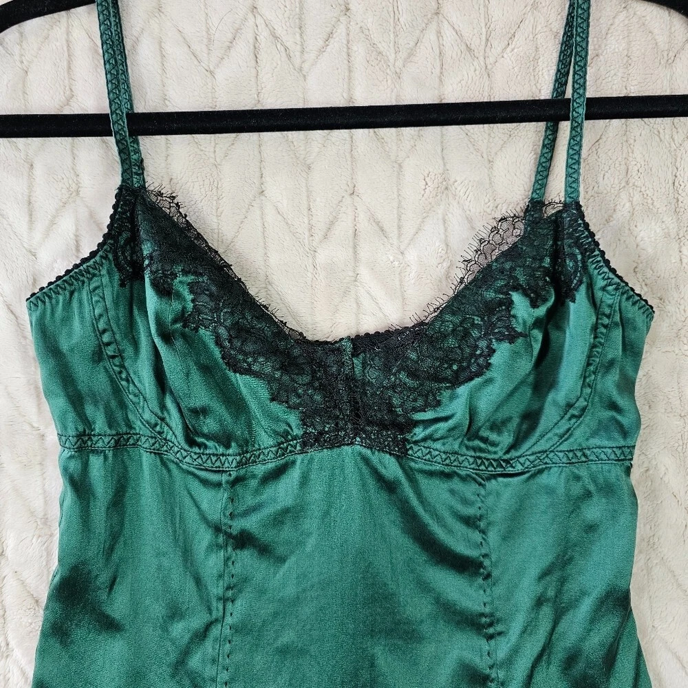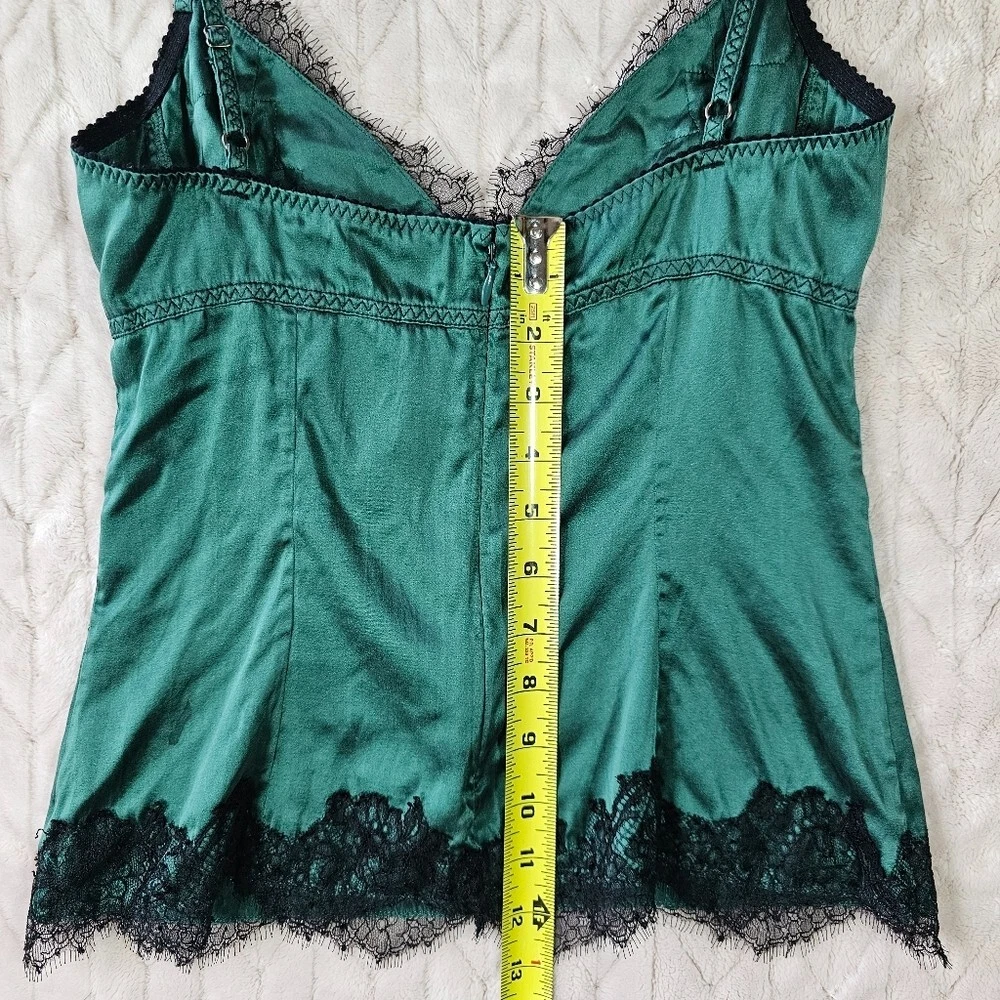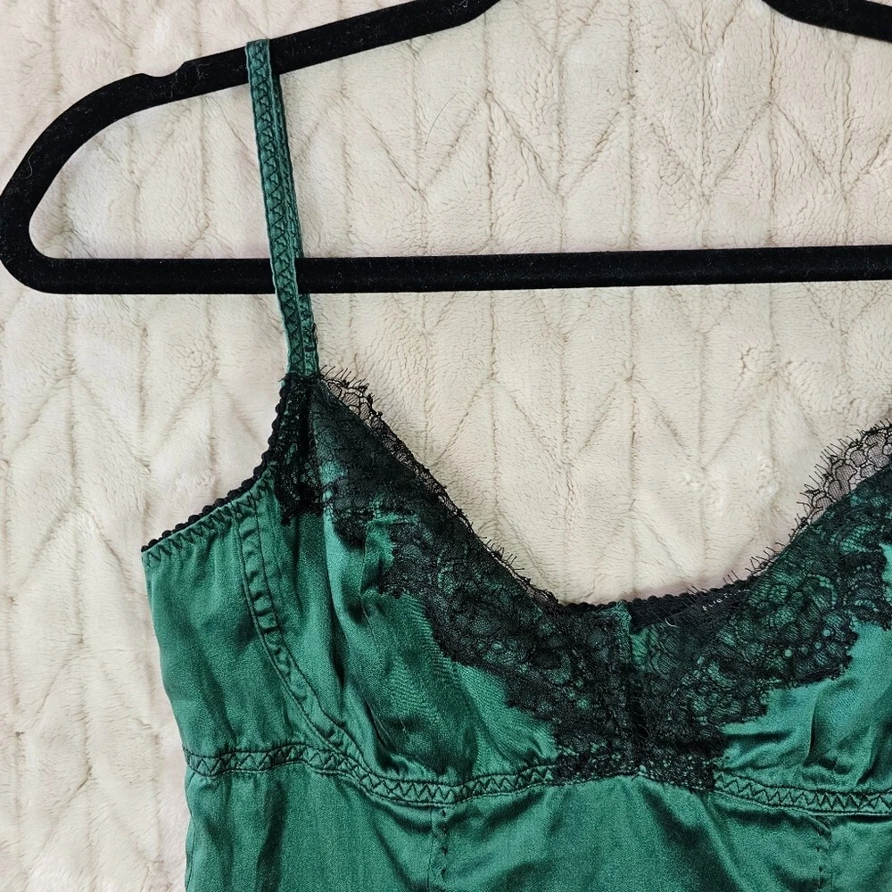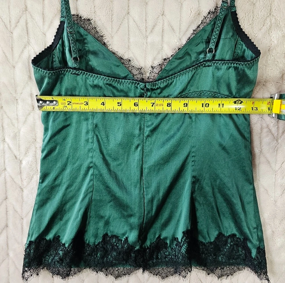 Beautiful emerald green silk camisole with black lace trim. Has a zipper closure on the back. Babydoll bust line with defined cups. Elastic around the top for the best fit! Embroidered style detail down the front to mimic the look of boning. Adjustable straps. In excellent pre owned condition, has one small spot that will come out with treatment.