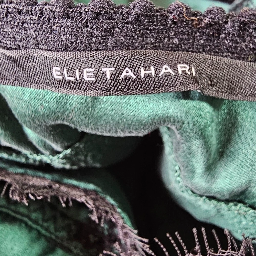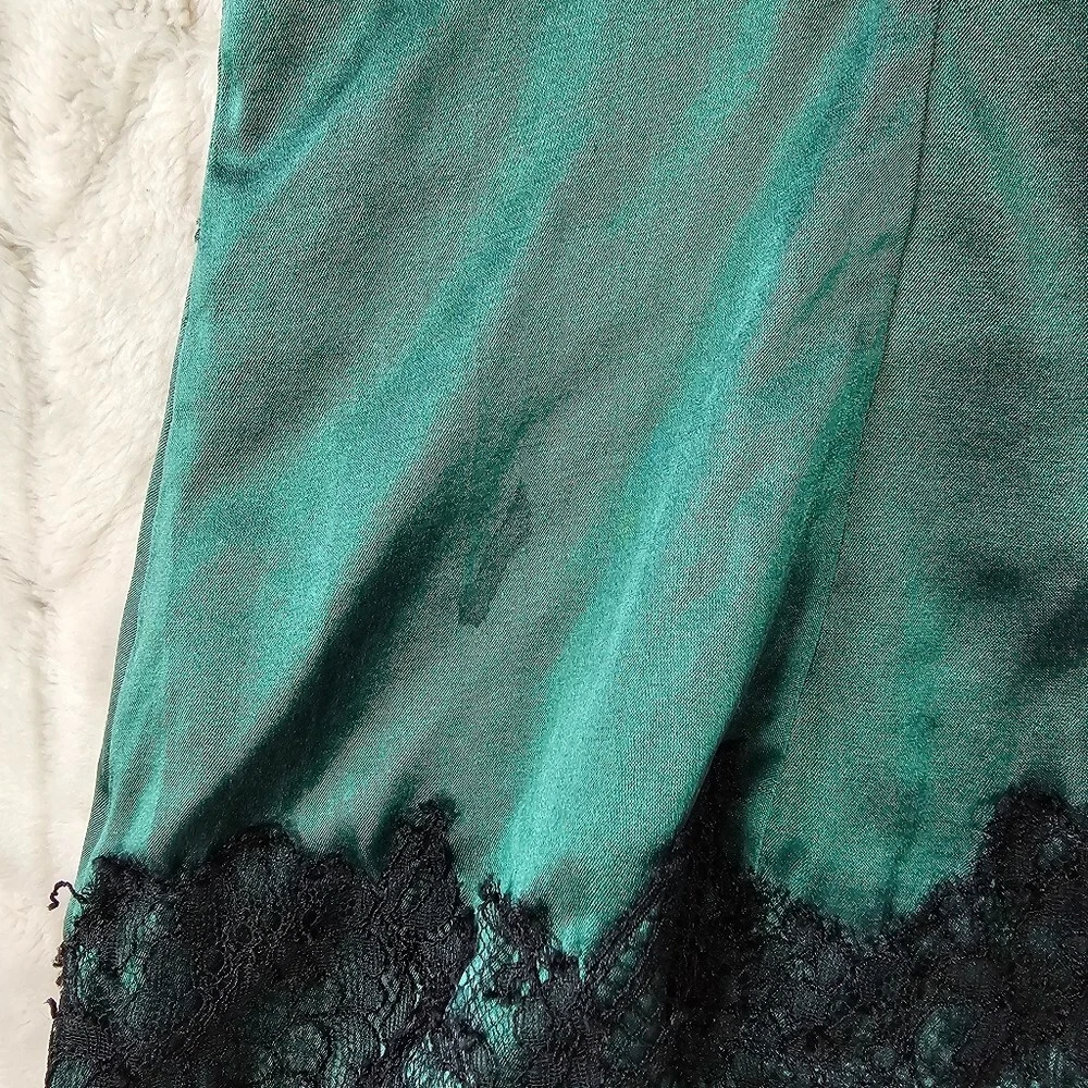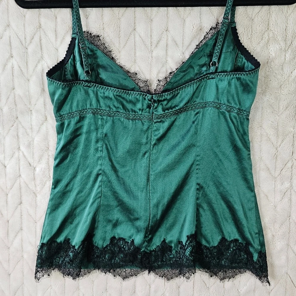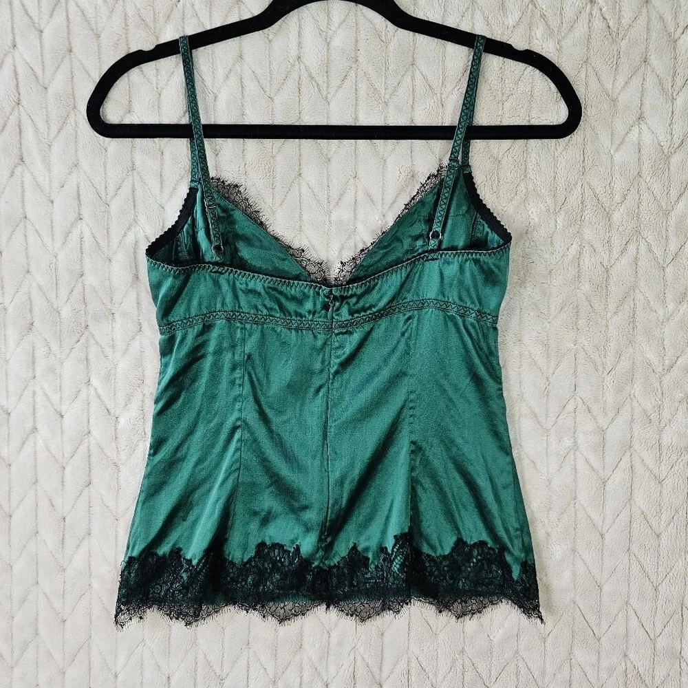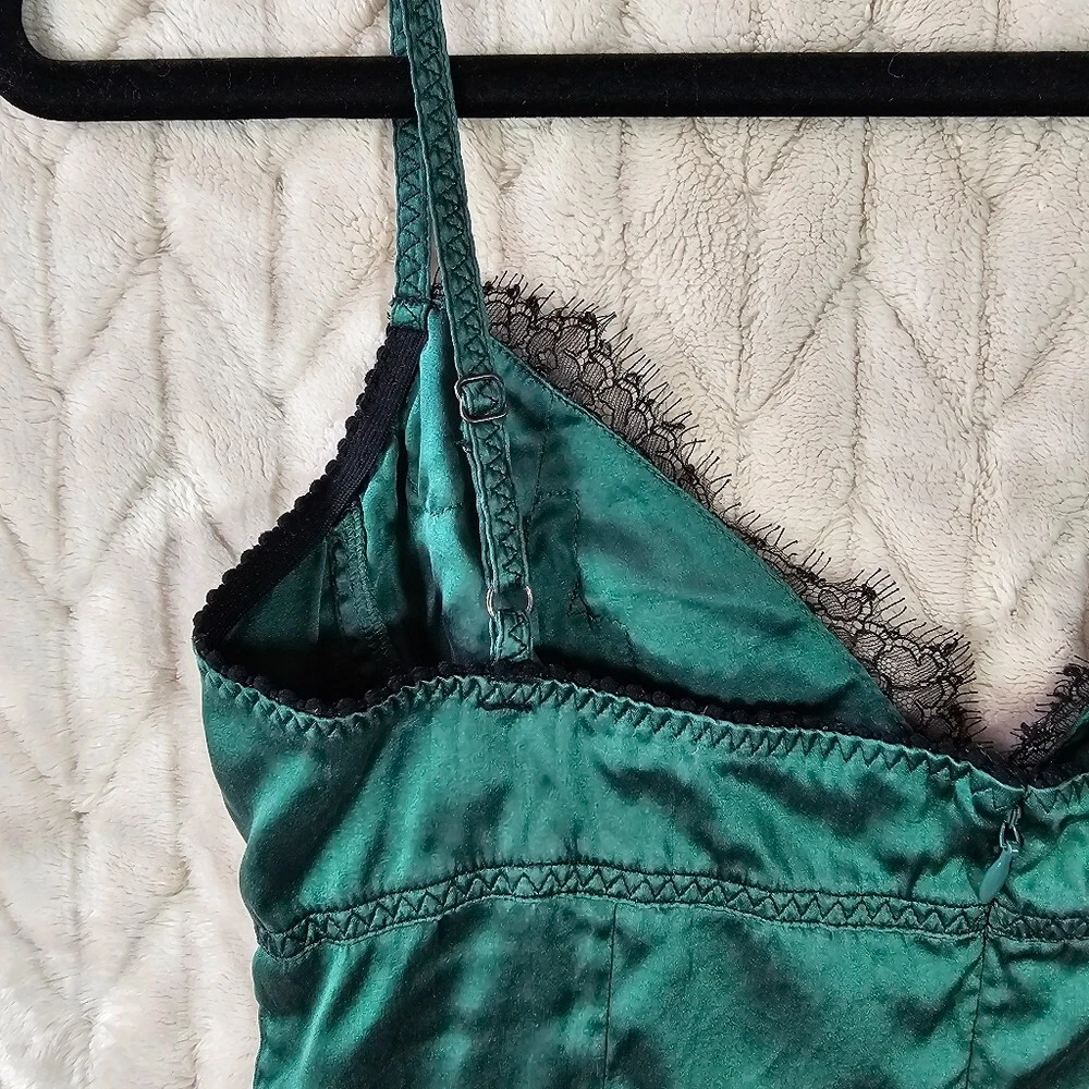 Beautiful emerald green silk camisole with black lace trim. Has a zipper closure on the back. Babydoll bust line with defined cups. Elastic around the top for the best fit! Embroidered style detail down the front to mimic the look of boning. Adjustable straps. In excellent pre owned condition, has one small spot that will come out with treatment.