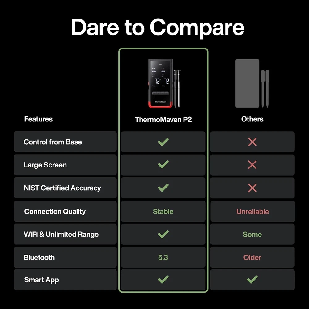 Elite Wireless BBQ Thermometer - 2 Probes, Large Display, ±0.5°F Accuracy, Supports 6 Sensors, WiFi & Bluetooth for Grilling, Baking, and Smoking About this item Unmatched Wireless Range: Enjoy the freedom to move around while grilling, baking, or smoking with ThermoMaven's Elite model. Its advanced wireless technology provides an unlimited range, keeping you connected to your food's temperature from any corner of your property. Precision Cooking at Your Fingertips: Achieve restaurant-quality results in your own kitchen with our ±0.5°F accurate thermometer. The two included probes are designed for durability and reliability, making them ideal for all your cooking adventures. Clear and Convenient Display: The ThermoMaven Elite's large display base is a chef's best friend, offering a clear view of your cooking progress. Its standalone design means you can place it anywhere for easy monitoring. Scalable Sensor System: Whether you're cooking for a crowd or a small family dinner, ThermoMaven Elite's ability to support up to 6 sensors means you can monitor various dishes or different parts of the same dish with ease. Intuitive and Smart: Simplify your cooking routine with ThermoMaven's user-friendly design. Set temperature alarms, timers, and receive notifications directly to your smartphone, allowing you to step away from the grill or oven with confidence.