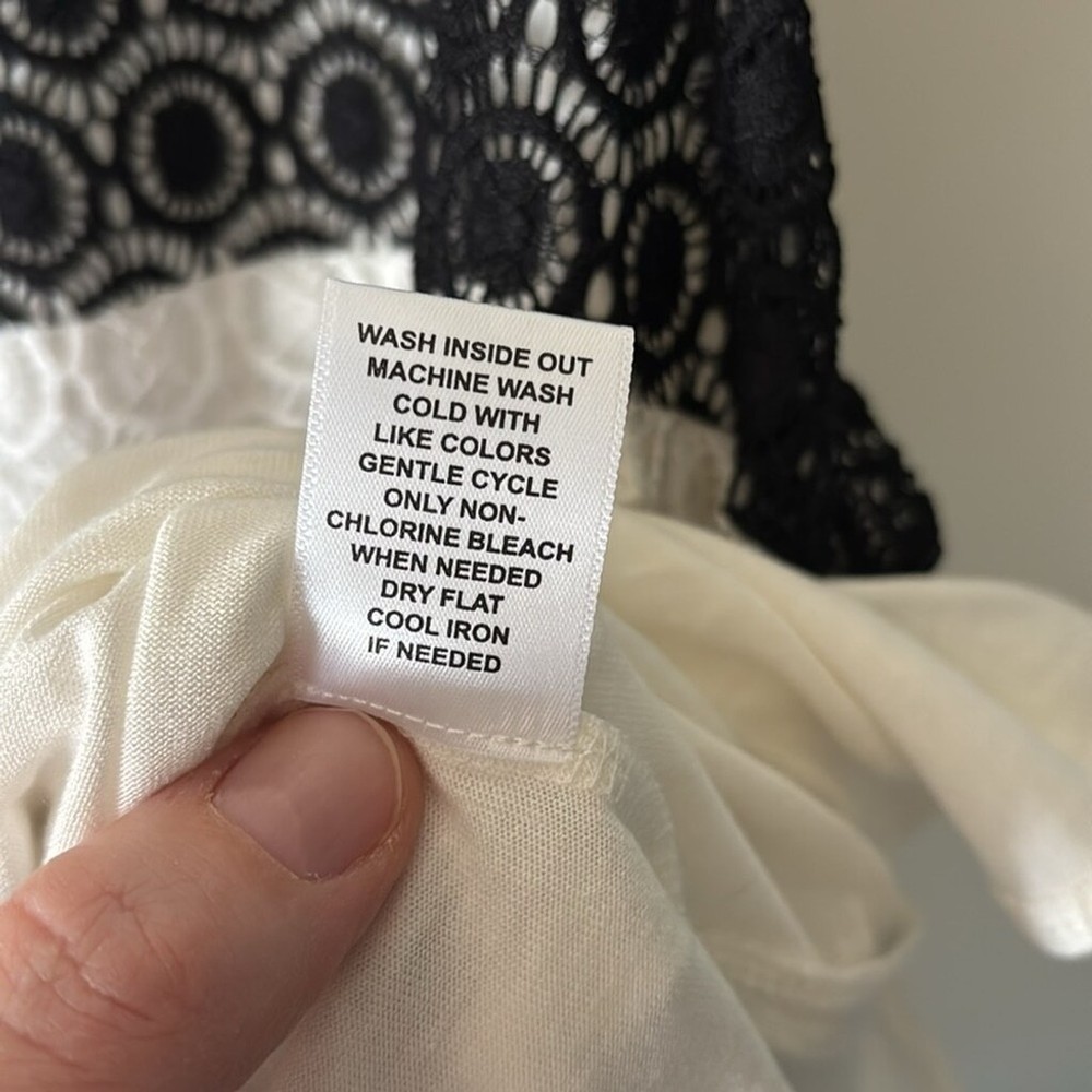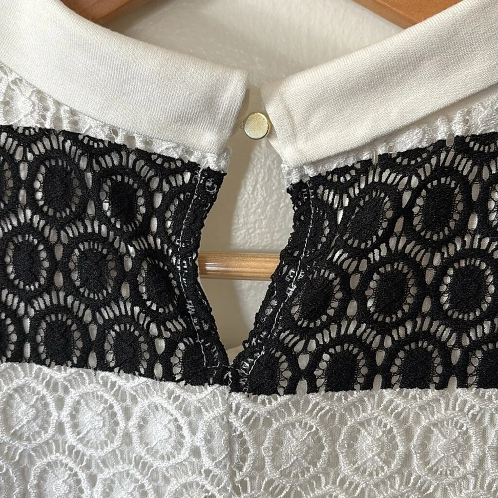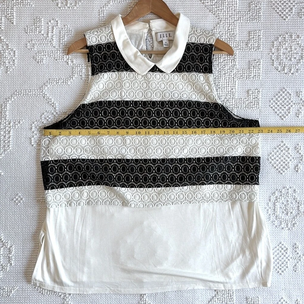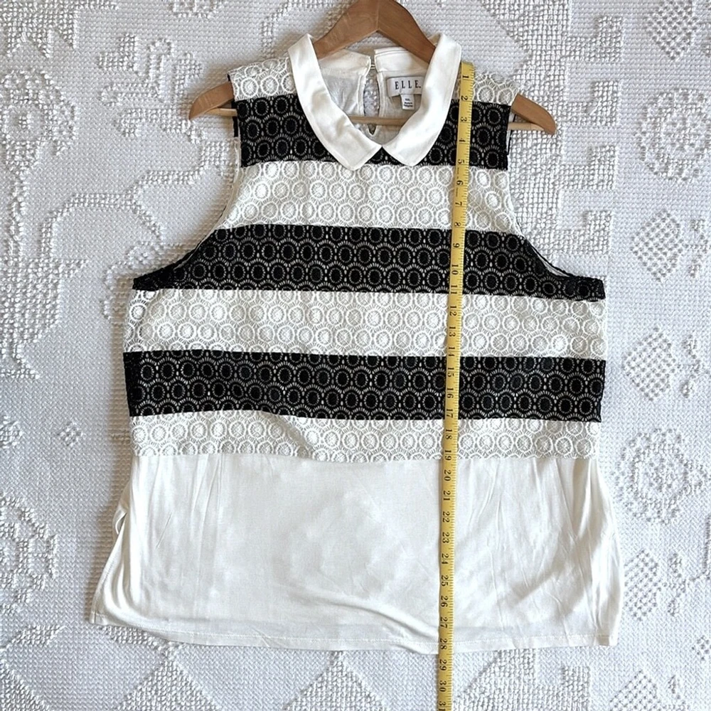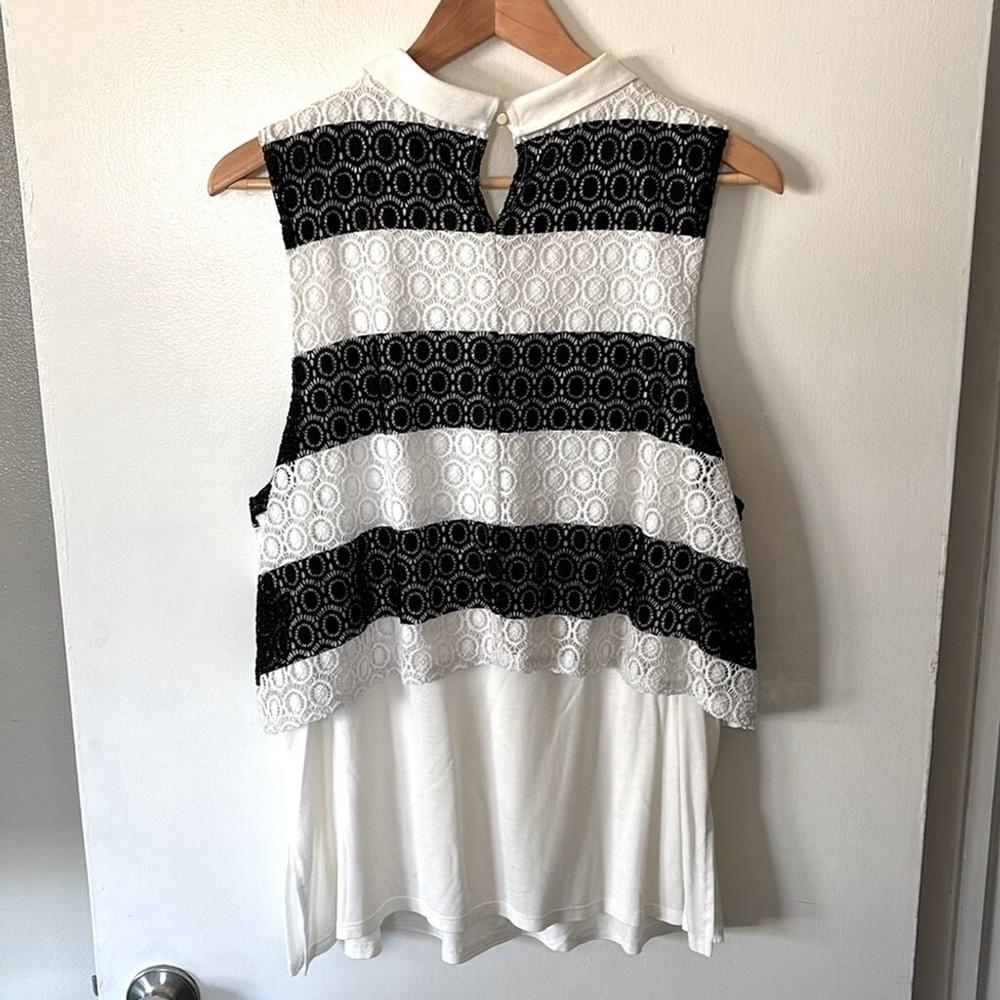 Elle brand Size XXL 2 layer tank top. White sleeveless collared blouse with black and white striped lace overlay and button closure in the back Preowned, no flaws Approx measurements shown in photos: Pit to pit 23” Shoulder to hem 28.5” Smoke free home