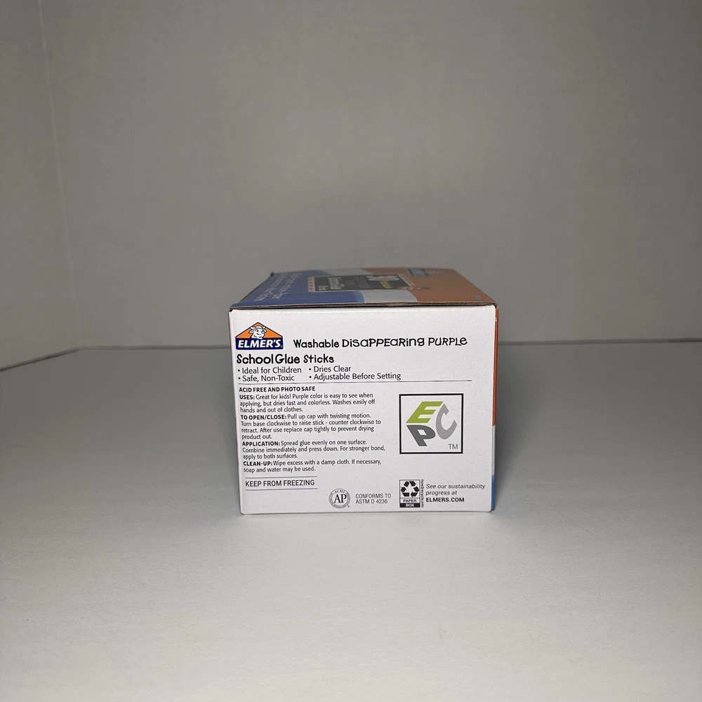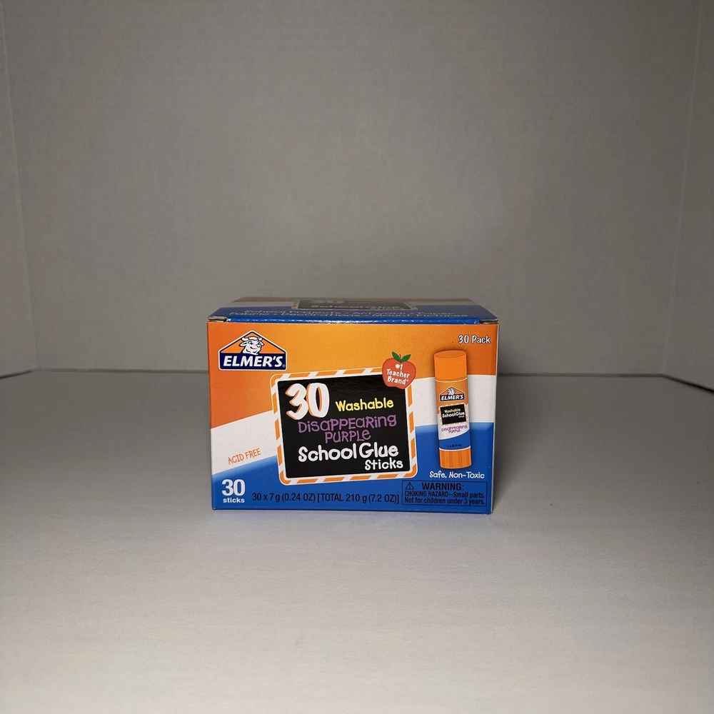Use Elmer's Washable Disappearing Purple School Glue Sticks for all your crafting needs! These sticks are perfect for school projects or any other crafting endeavor. The washable formula ensures that you can easily remove any excess glue without leaving a mess. Get creative and have fun with Elmer's Washable Disappearing Purple School Glue Sticks! Please review all photos. Thank you!