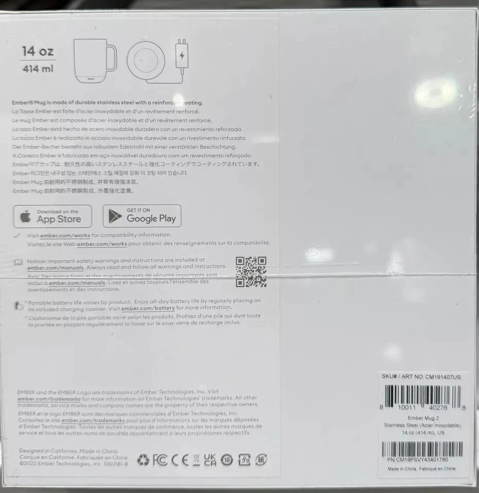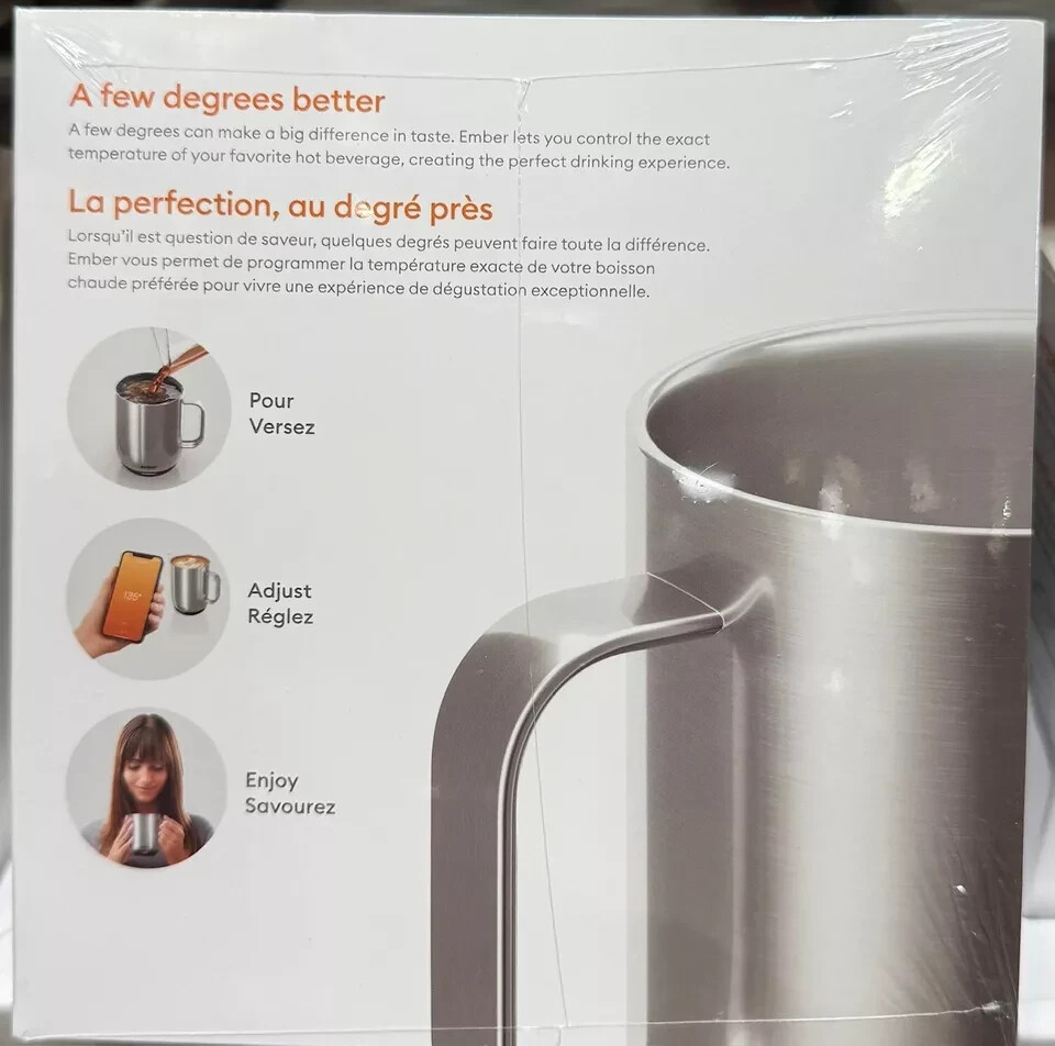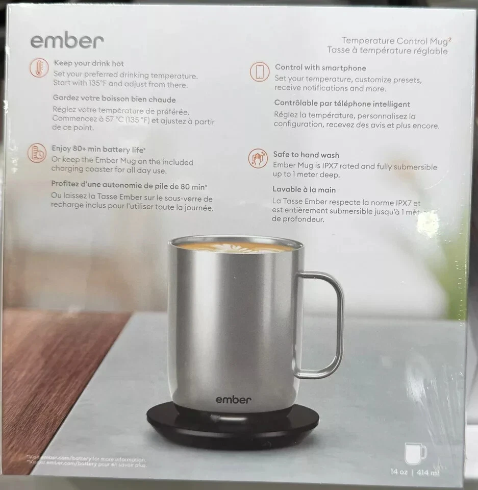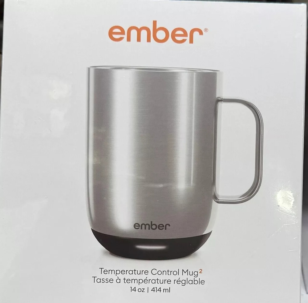 Description Product Details Designed for home or office, Ember Mug 2 does more than simply keep your coffee hot. The temperature control smart mug allows you to set your preferred drinking temperature (120°F – 145°F), so you can enjoy your hot drink—just the way you like it— from the first sip to the last drop. Ember Mug 2’s built-in battery maintains your chosen drinking temperature for up to 80 minutes, or all day with the included charging coaster. Accessories Included: Ember Mug 2, 14 oz, Stainless Steel Charging Coaster 2 Power Adapter Product Features: Capacity: 14 fl oz Built-in battery to maintain your drinking temperature Battery life: 80 minutes, or all day on included charging coaster Ember Mug Charging Coaster 2 included Pairs with the Ember app. iOS and Android compatible Temperature range: 120°F – 145°F Ember Mug is safe to hand wash and submersible up to 1 meter in water Do not microwave Dimensions & More Info: Type of material made out of: Stainless Steel, Polycarbonate 4.5" W x 3.5" L x 4.6" H 16.1 oz Made in China Warranty: Parts/Labor: 1 Year Limited