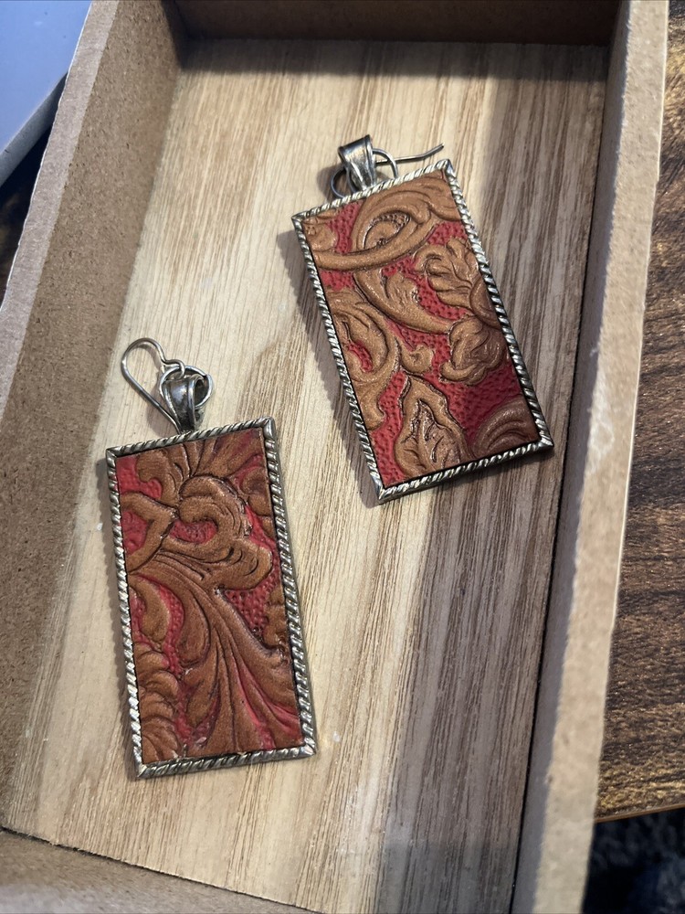 Embossed Leather Rectangle Pendant and Earring Set of 2