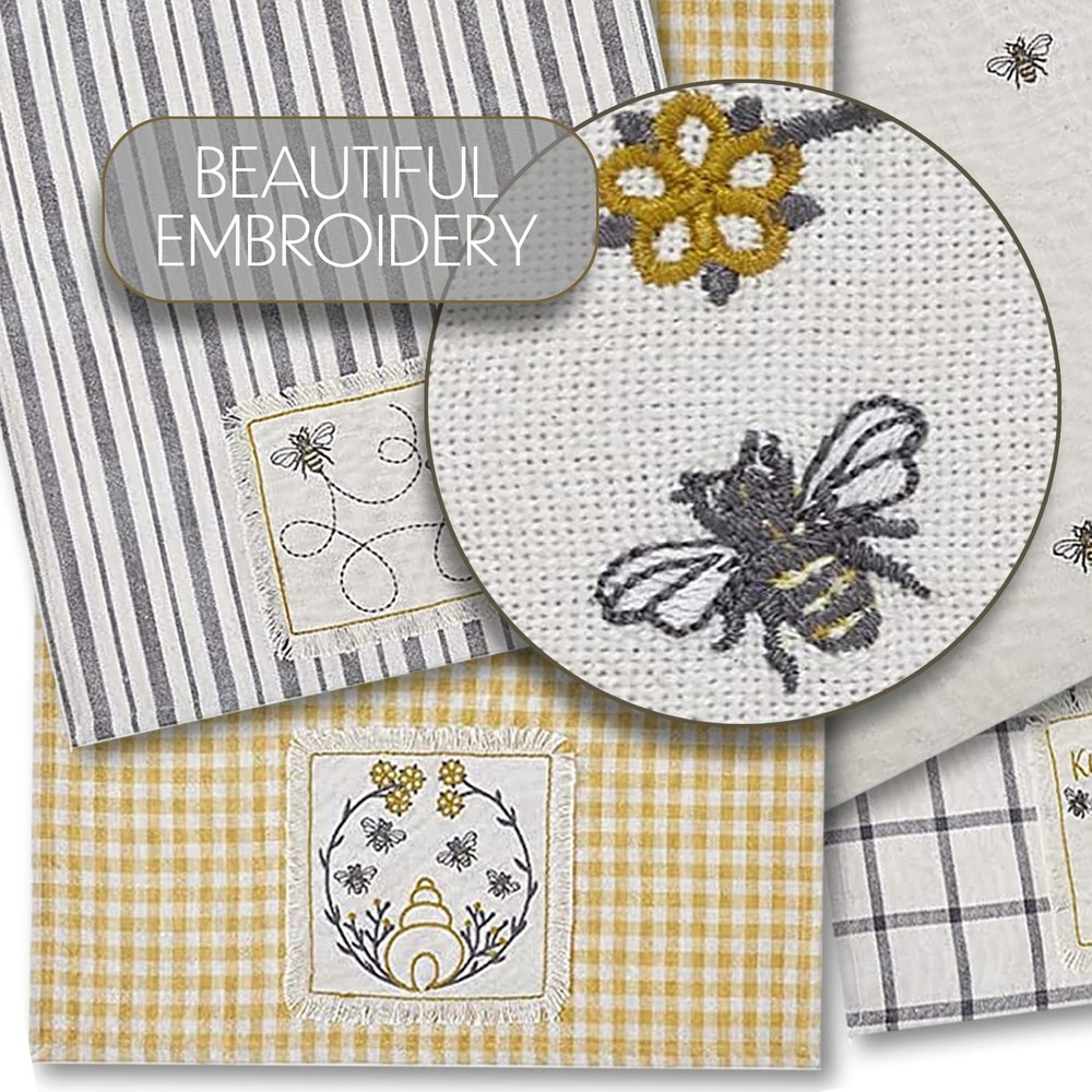 The Embroidered Bee Kitchen Tea Towel Set of 4 features a textured woven cotton base fabric with bee-inspired appliques and embroidery in natural creme, soft yellow, and charcoal grey. For your convenience, each towel includes a fabric loop for easy hanging. Towel Set: Add a cottage style to your kitchen for a farmhouse feel; Provides style and functionality for a homey feel to you decor. Textured Material: This 100% cotton flax makes this towel set extra soft and extra absorbent. Machine wash on gentle and tumble dry low. Towel Set: Our wide array of towel sets are perfect for adding a farmhouse element to your kitchen; Complements your home, lodge, cabin, retreat or lake house Farmhouse Home Decor: We offer a wide range of products to decorate your home from wall to wall; This includes bedding, window treatment, rugs, and holiday themed textiles and decorative items : After more than 3 decades, the company has grown to become a trusted brand for quality country and traditional American decor; it is our firm belief that our products will last you for years to come