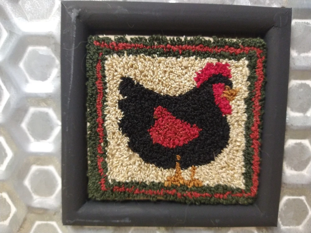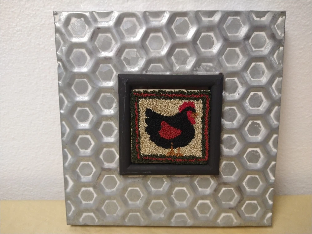 This beautiful piece of art features a charming chicken design, embroidered using the punch needle technique on a metal frame. Its unique style and intricate details make it a must-have for any needlecraft enthusiast. Made in the United States, this framed needlepoint is a one-of-a-kind item that will add a touch of rustic charm to any room. The embroidery is expertly crafted and the metal frame adds an interesting visual element to the piece. This finished needlepoint is perfect for adding a pop of color to your home decor or as a thoughtful gift for a loved one. Don't miss out on the chance to own this lovely creation.