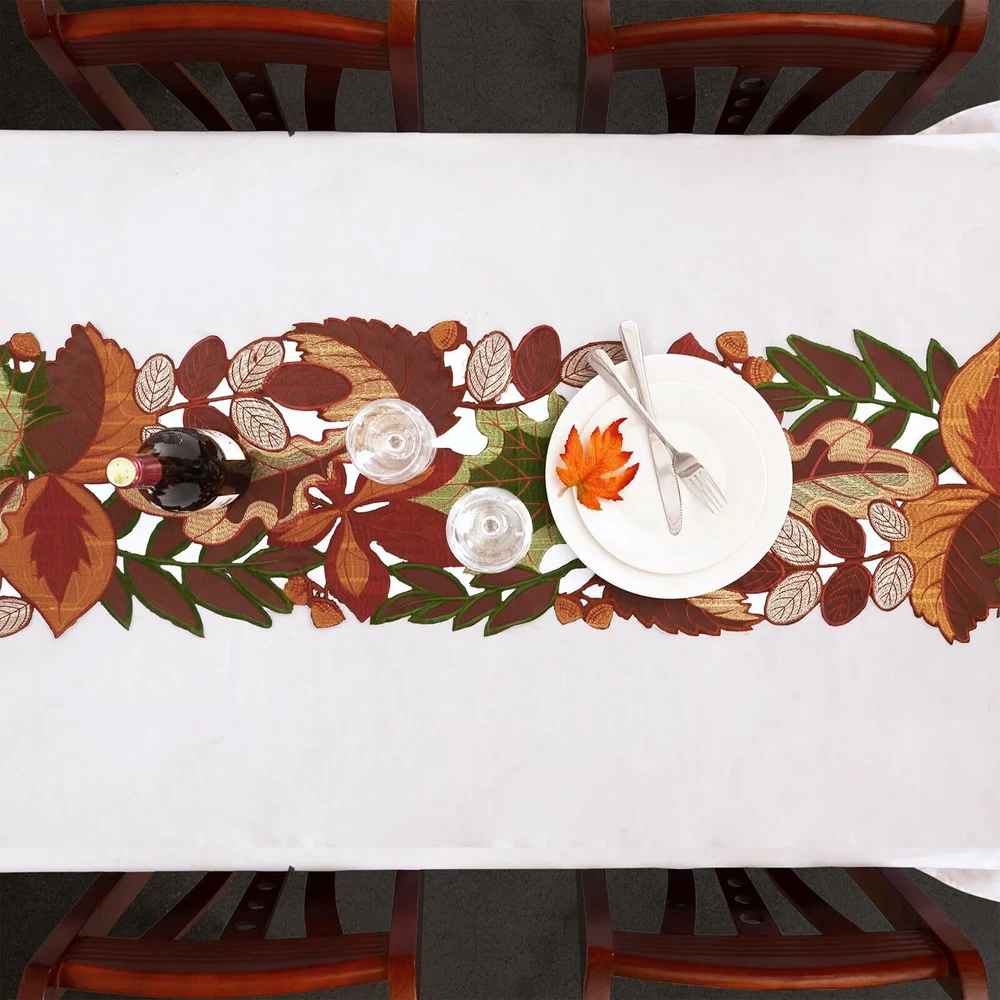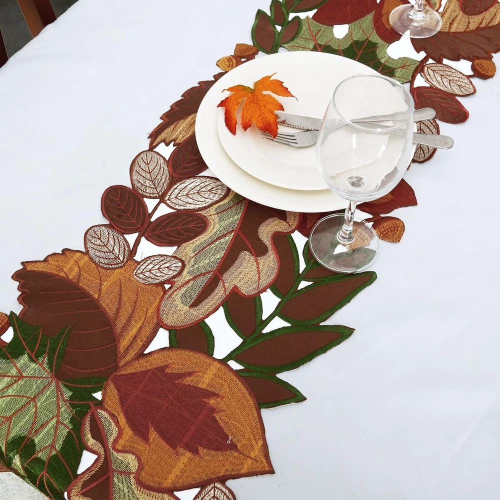 Elevate your home decor with this stunning table runner adorned with an intricate arrangement of fabric leaves in rich autumnal hues. Crafted with meticulous attention to detail, each leaf is expertly shaped and colored, creating a vibrant tapestry that celebrates the beauty of nature. Whether draped across your dining table or adorning a sideboard, this exquisite piece adds warmth and sophistication to any space. With its earthy tones and organic textures, it effortlessly complements a variety of design styles, from rustic to contemporary. Embrace the captivating charm of fall year-round with this remarkable table runner that transforms your home into an inviting sanctuary. Vibrant Fall Decor: This table runner features an array of lifelike autumn leaves in rich hues of burgundy, orange, and brown Versatile Design: The elongated garland style allows it to beautifully adorn tables, mantles or shelves Textured Details: Meticulously crafted with fabric leaves that showcase intricate veining for an ultra-realistic look Easy Care: Simply wipe clean with a damp cloth as needed to maintain its fresh appearance